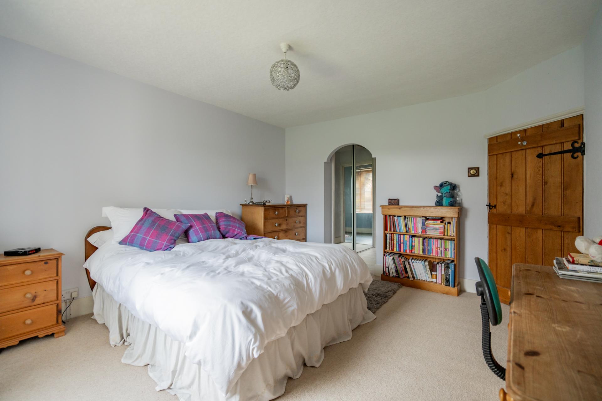 Another spacious double bedroom which offers delightful views of the land, countryside, and mature trees. Enhanced by oak flooring, the room provides access to the attic room via a stairway.