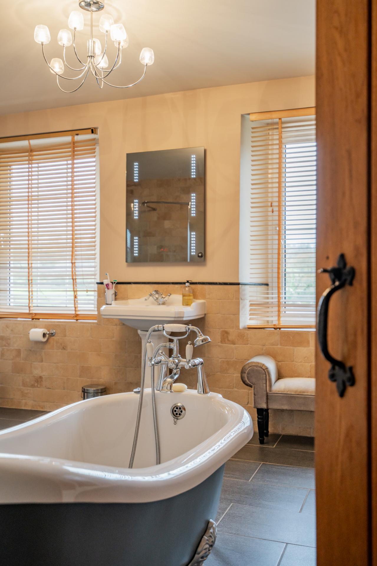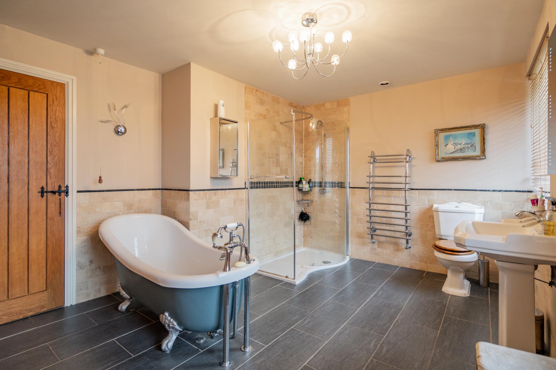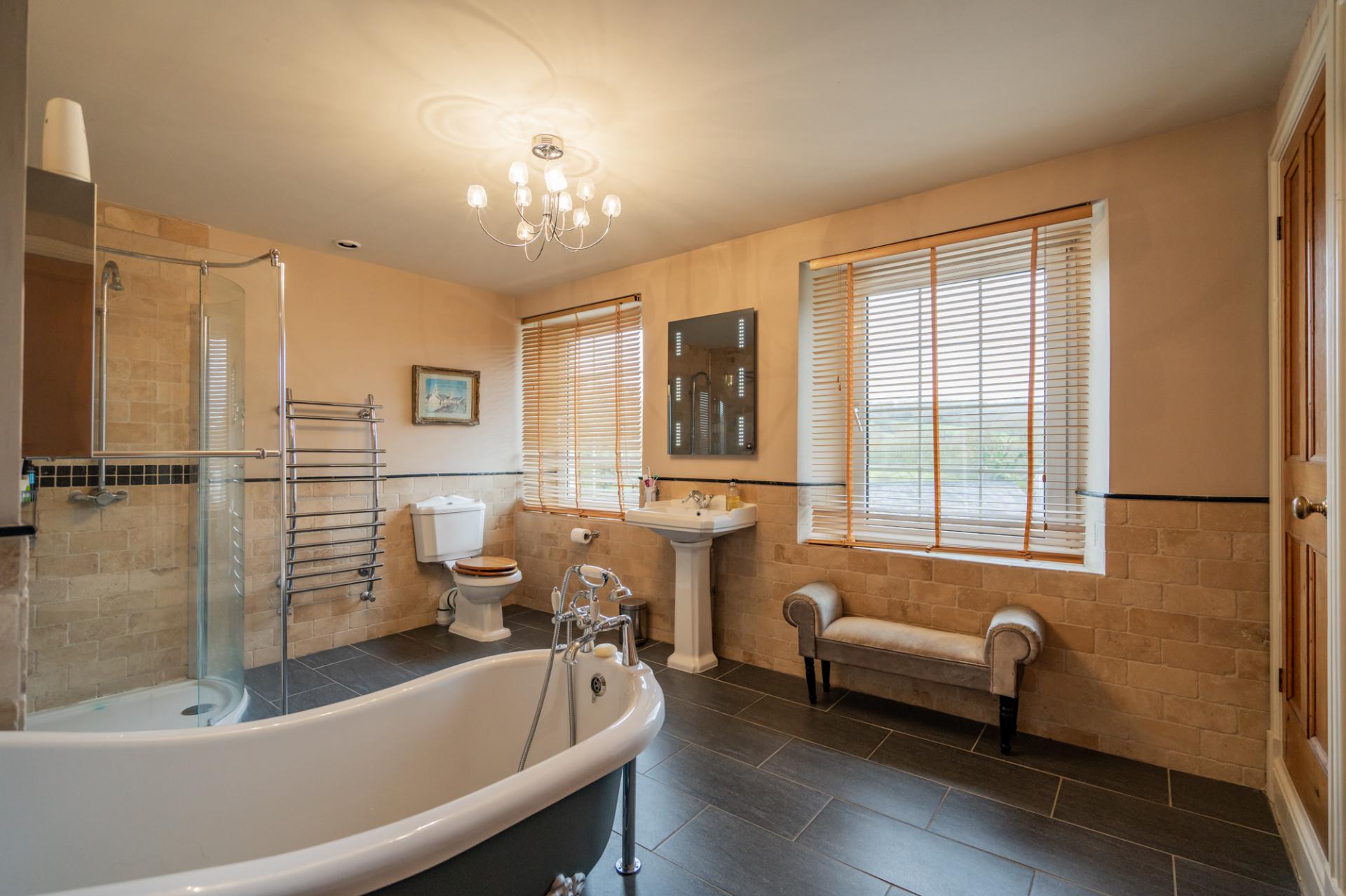 The lavish family bathroom is fully furnished with a WC, wash basin, feature free-standing bath, walk-in shower, heated towel rail, extractor fan, porcelain tiled flooring, travertine tiled walls, two windows, double door large airing cupboard with fitted shelving, and an additional cupboard housing the water tank.