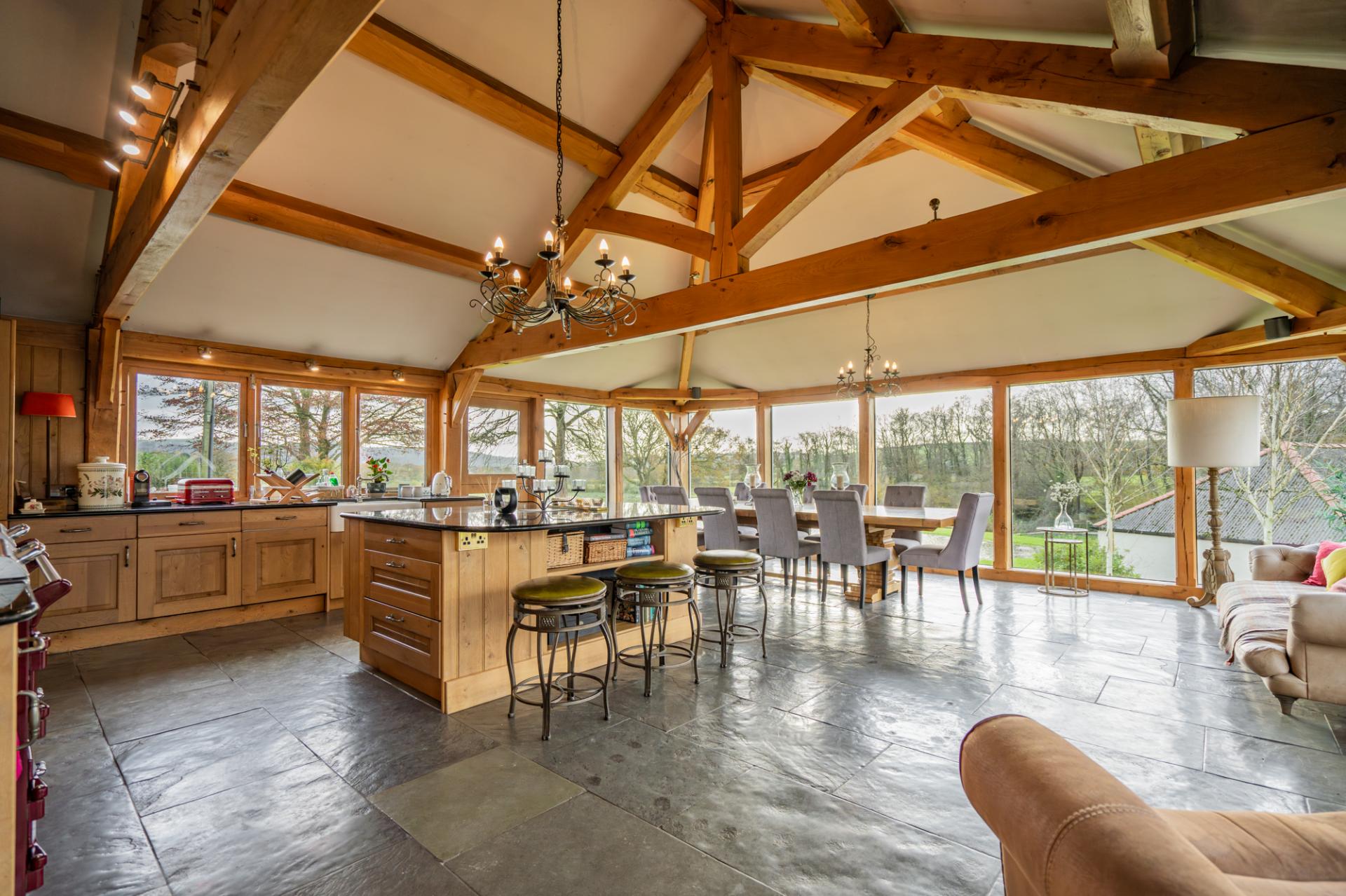 Begin by discovering the remarkable kitchen/diner/breakfast room – undeniably the heart of the home. Upon entering, the allure of oak-framed windows becomes apparent, providing breath-taking views of the lake, rural landscapes, and mature trees. Abundant natural light floods the space, fostering a warm and inviting ambiance. The charming limestone tiled flooring extends throughout, while the expansive vaulted ceiling is adorned with beautiful oak beams.