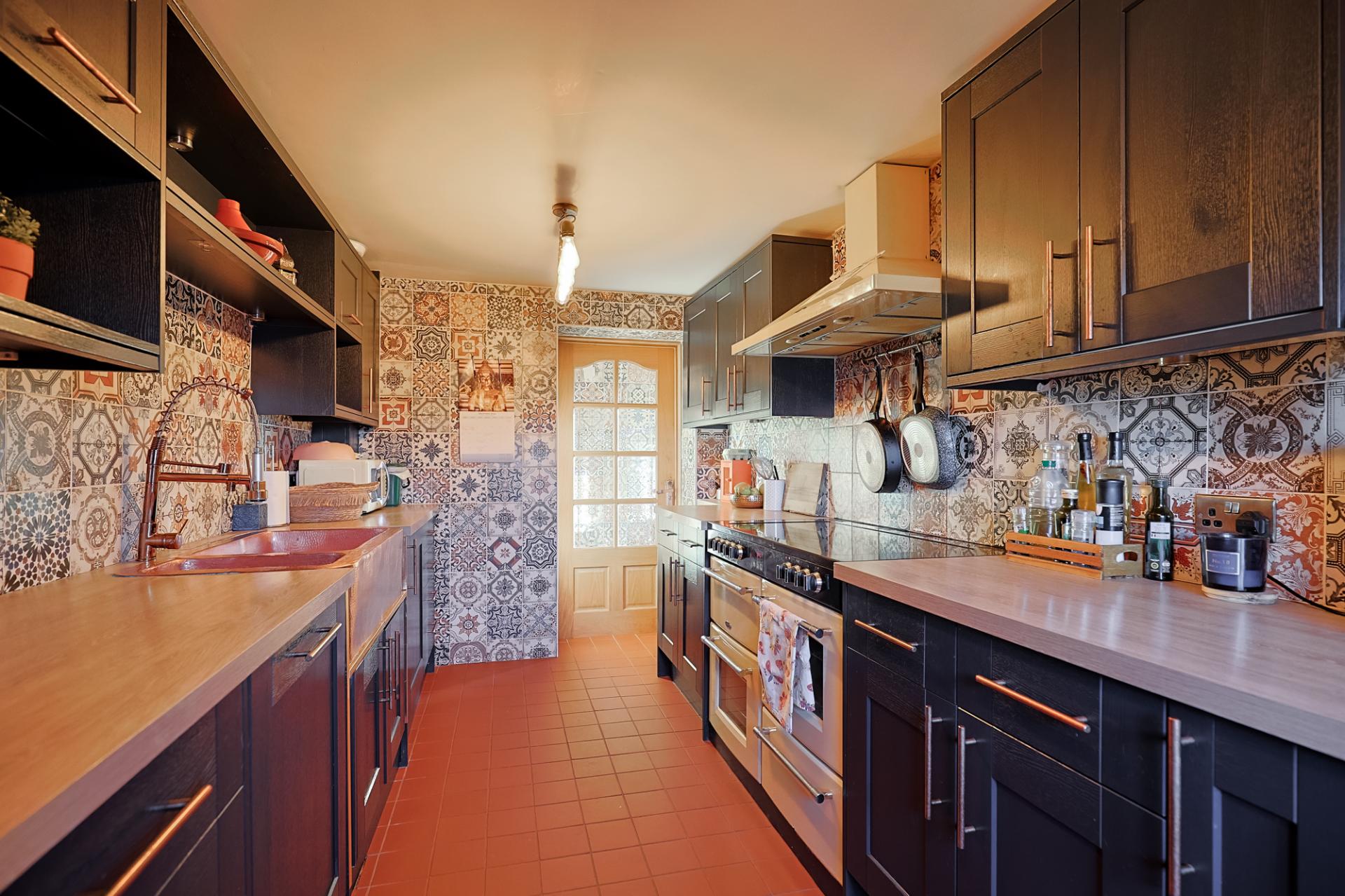 This beautifully presented kitchen boasts terracotta-tiled flooring and feature tiled walls, with a window to the front offering rural outlooks. It is fitted with wall and base units, feature lighting, and an impressive double copper sink with a flexi tap. The kitchen also includes a dishwasher, a tall fridge/freezer, a Belling double oven and grill, a 5-ring electric hob, hot plate, and elevated extractor fan. A rear lobby provides access to the outdoor space and a practical pantry for additional storage and appliance housing.