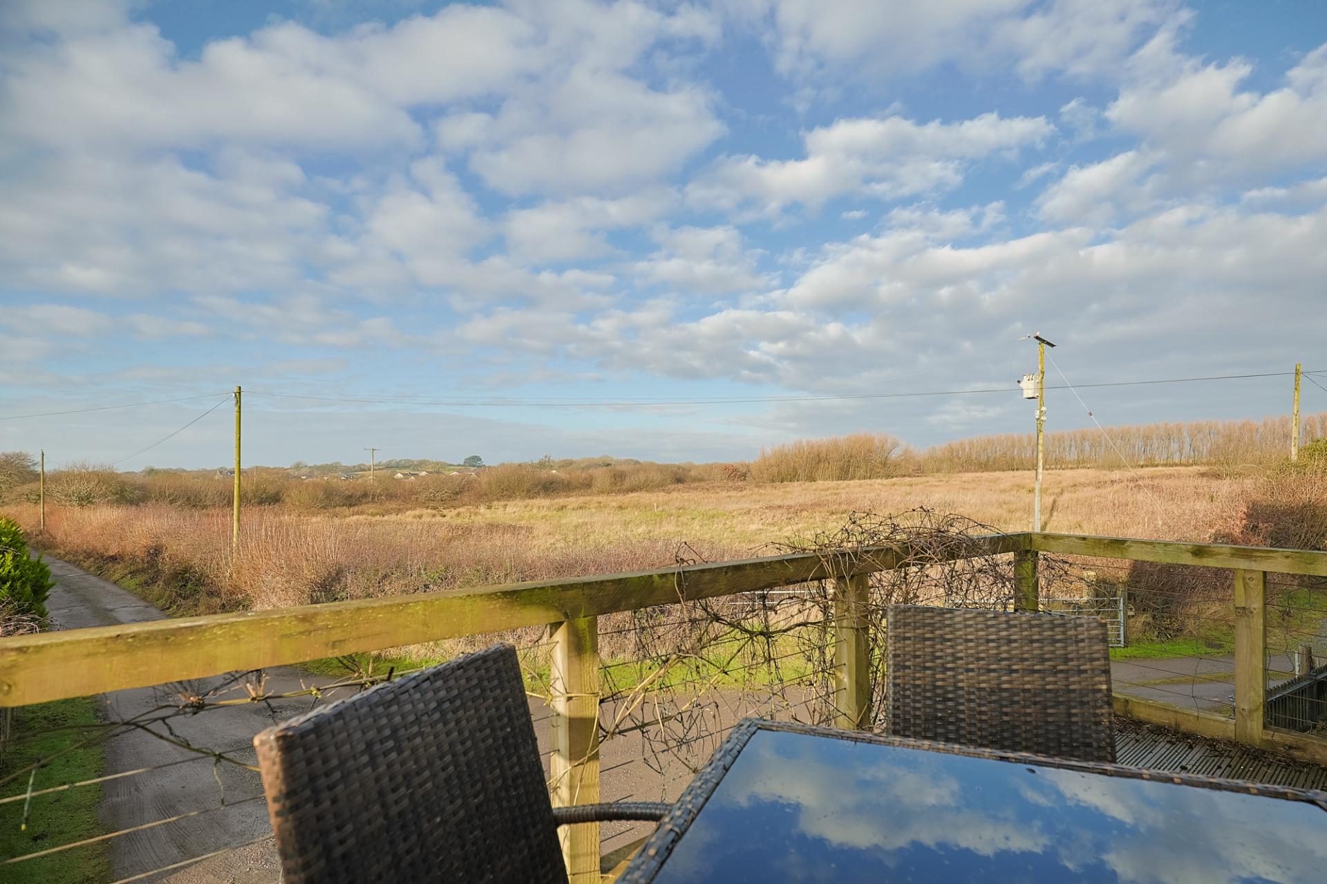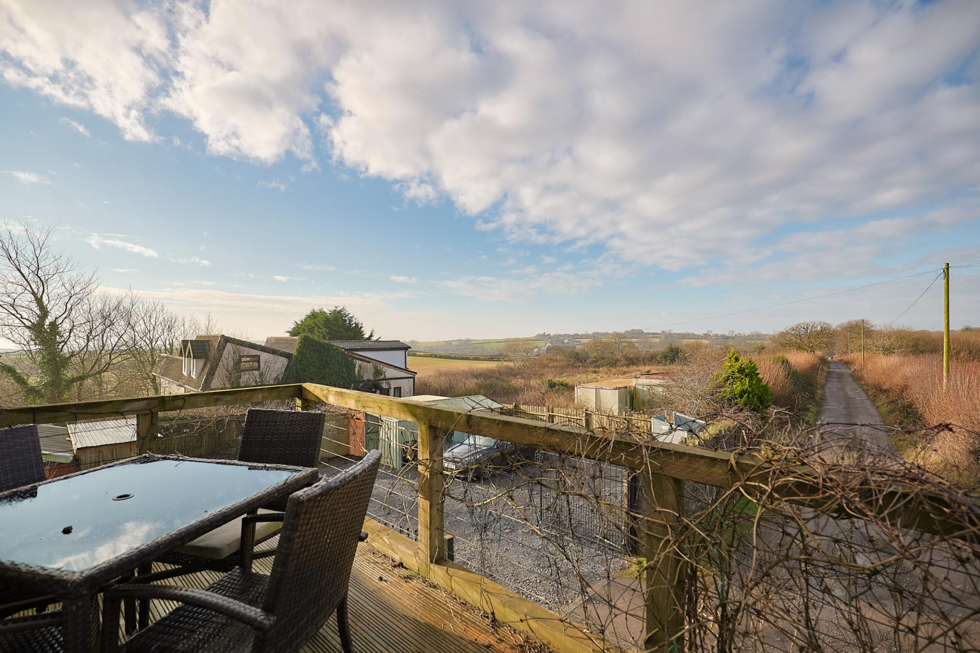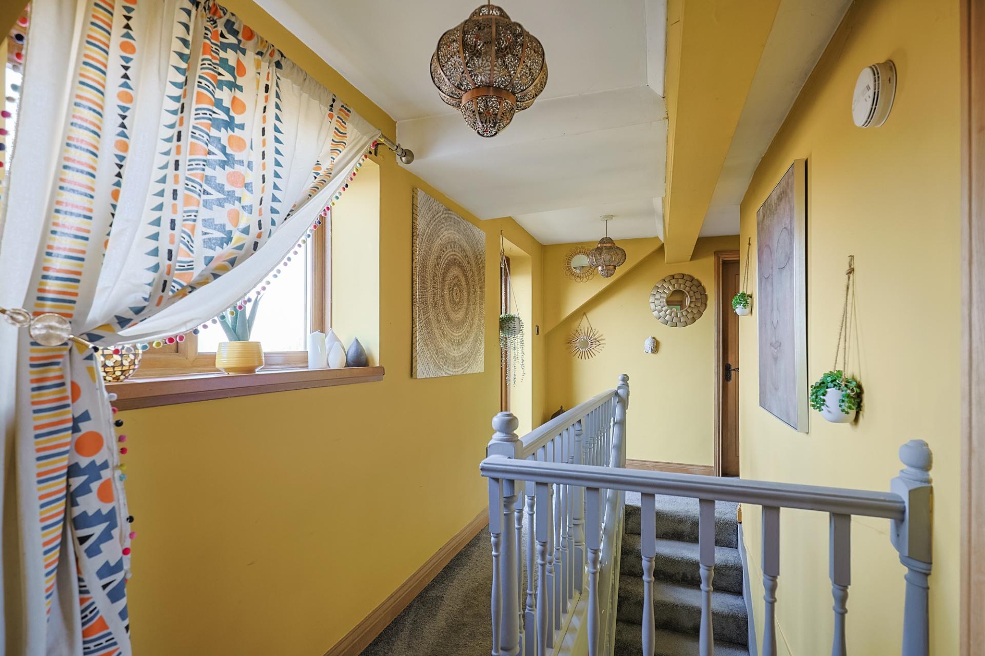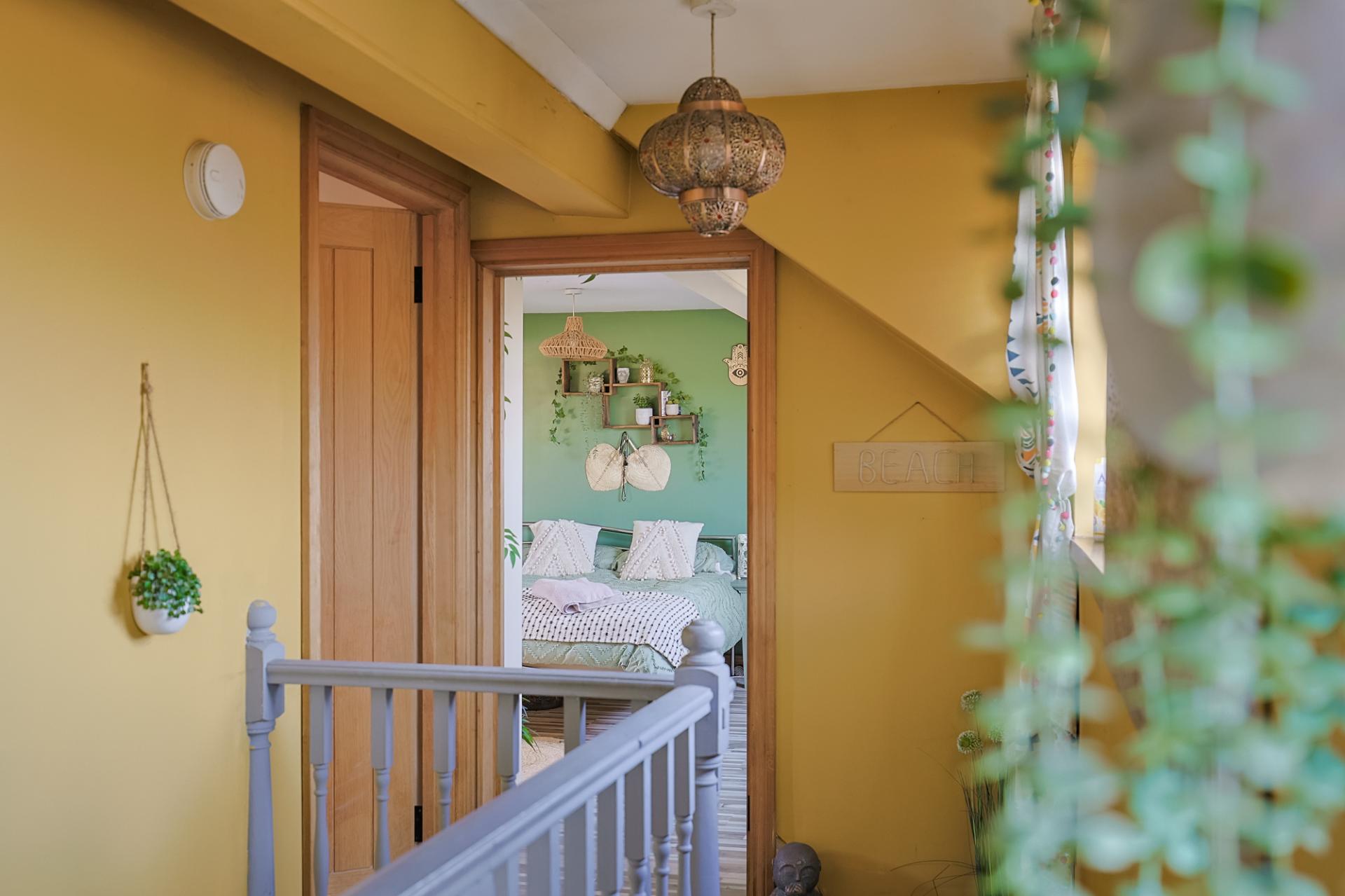 Ascending the carpeted stairway, you’ll arrive at a cosy landing laid with carpet, and a window to the front. This space provides access to three double bedrooms, a family bathroom, an airing cupboard, and a sit-out balcony with countryside views.