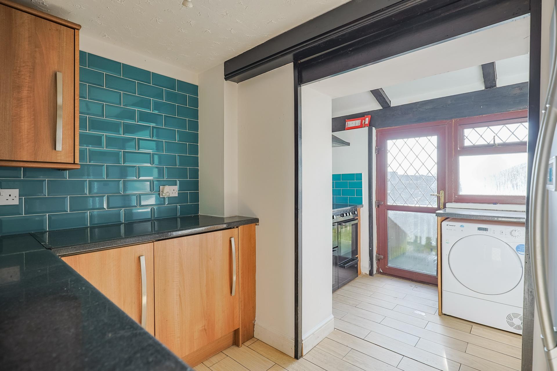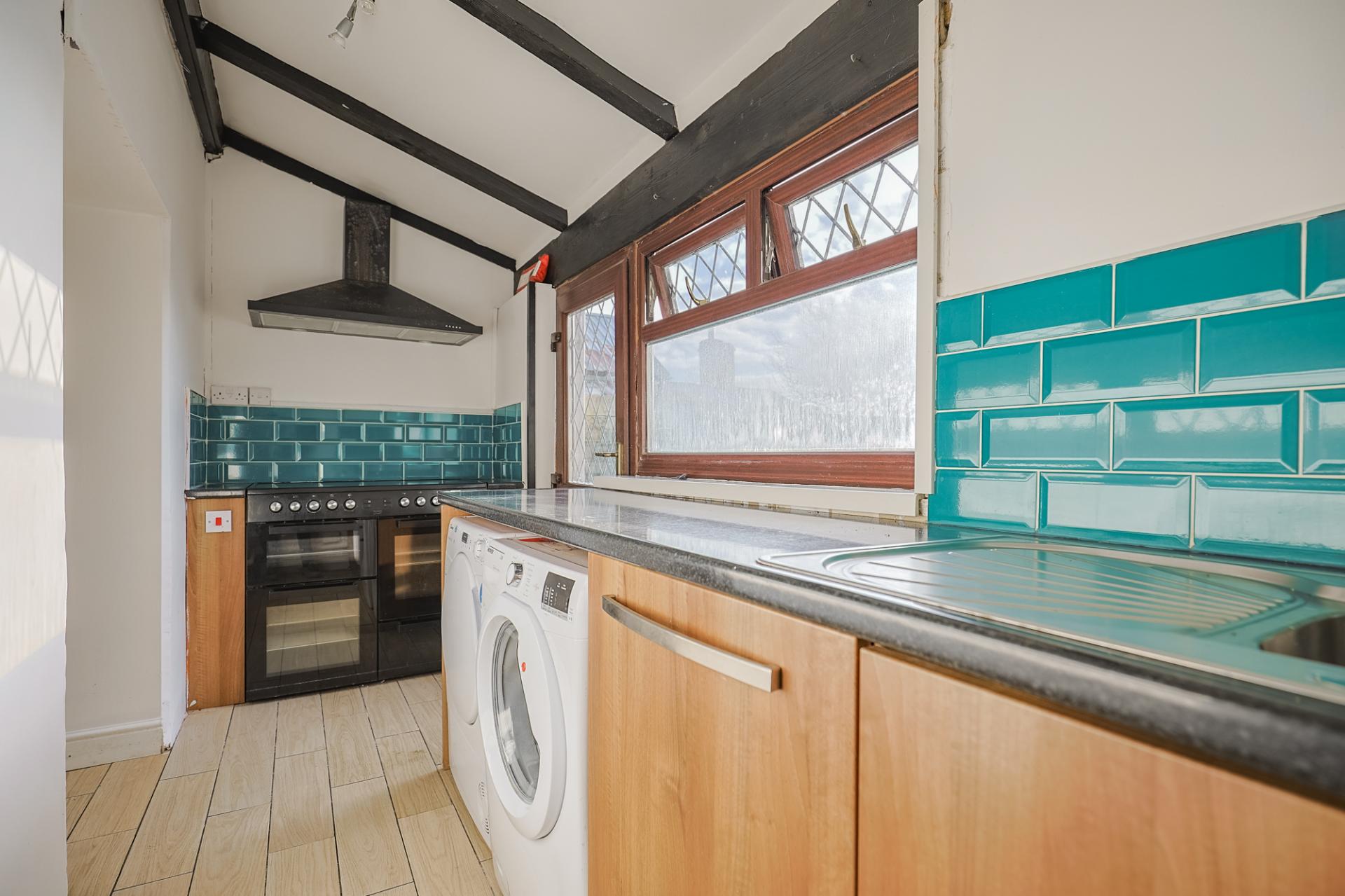 The cottage’s kitchen is well-equipped with a range of wall and base units, a double stainless-steel sink, a Candy dishwasher, a Beko double oven and grill, a 5-ring electric hob, and an elevated extractor fan. With tiled flooring, a vaulted ceiling, and a side-facing window, this kitchen also provides access to a rear enclosed patio area and space for a freestanding appliance.