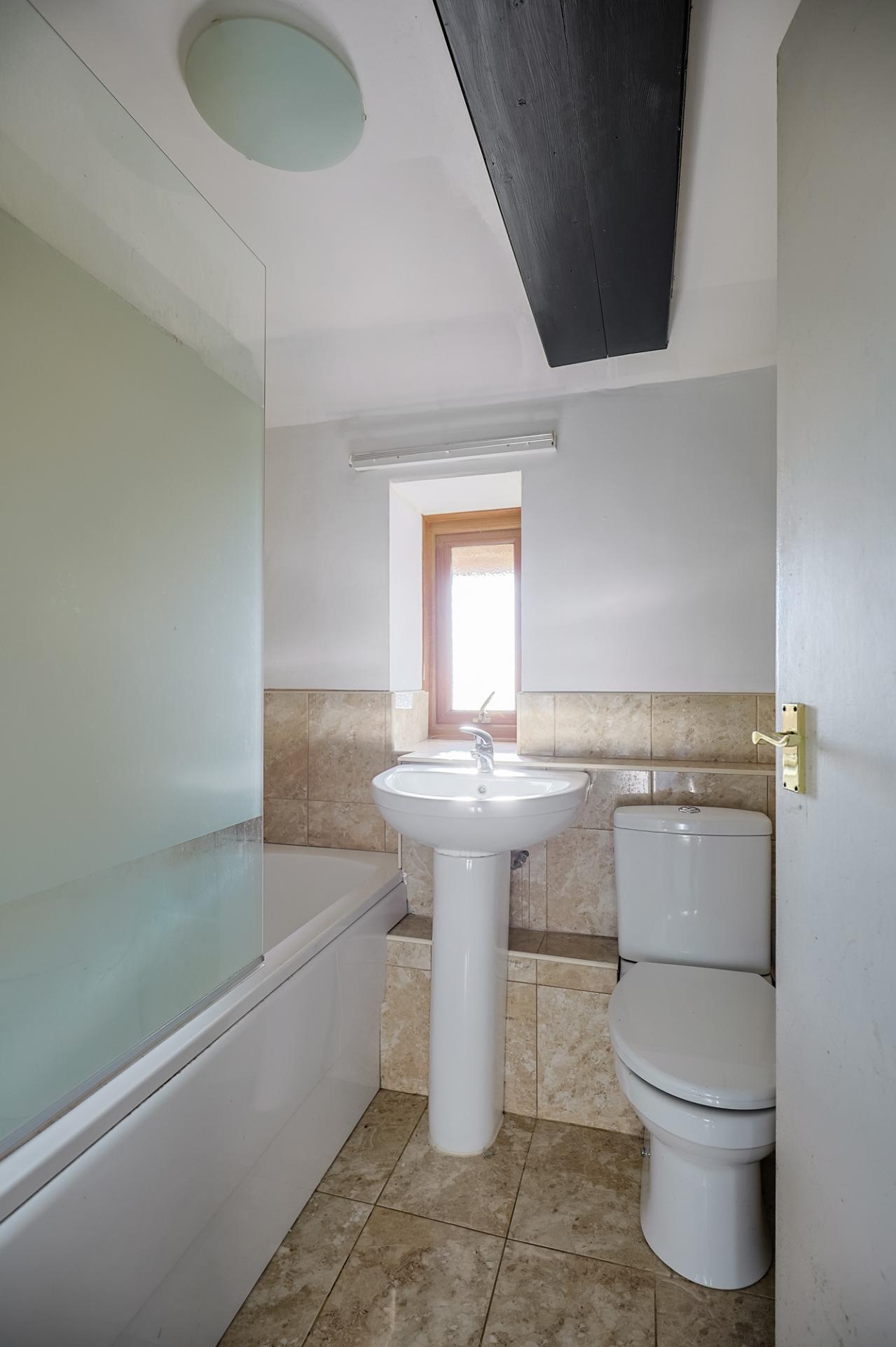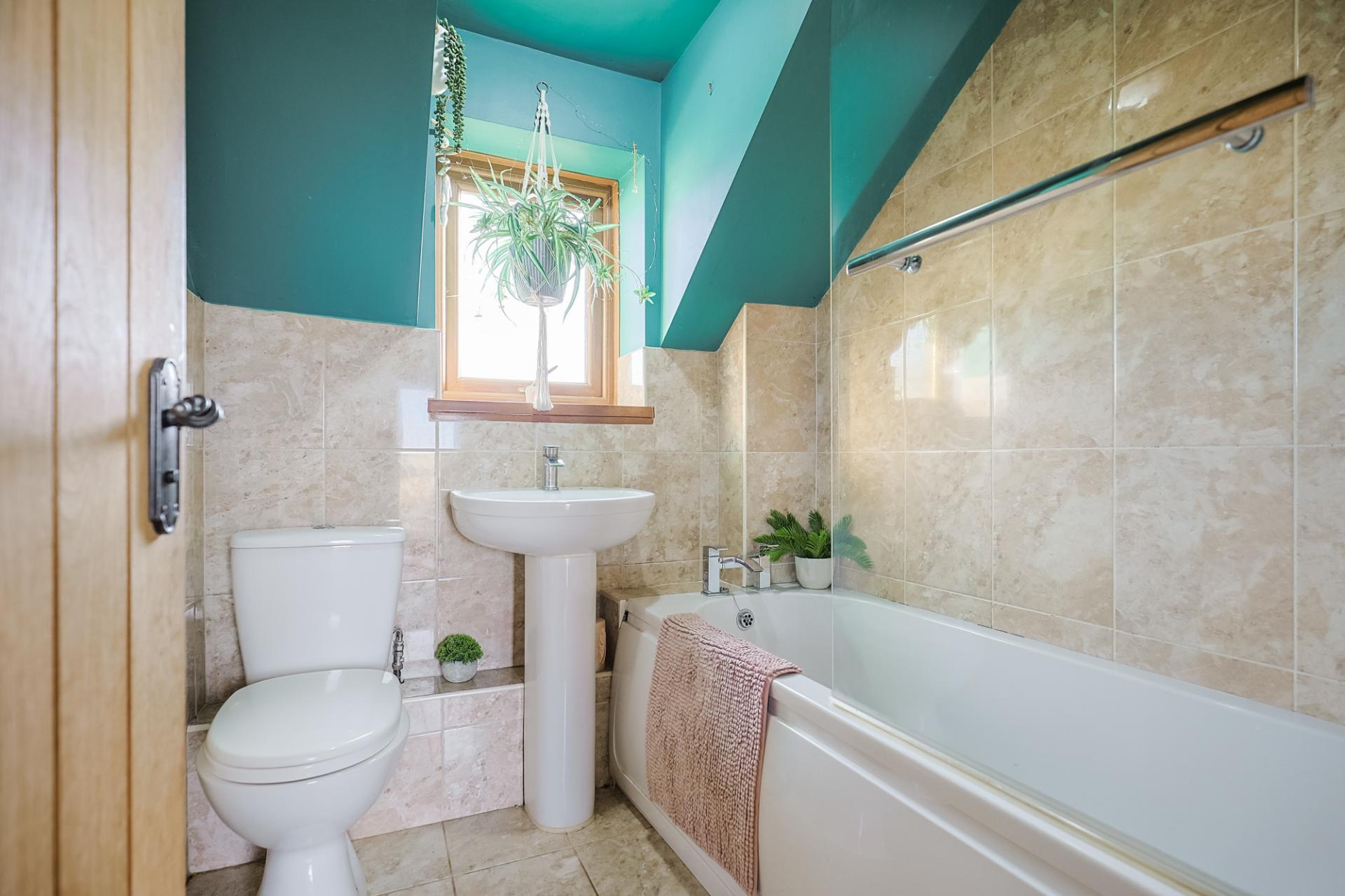 The bathroom is furnished with a WC, wash basin, fitted bath with an electric shower over, heated towel rail, tiled flooring, part-tiled walls, and a frosted side-facing window.