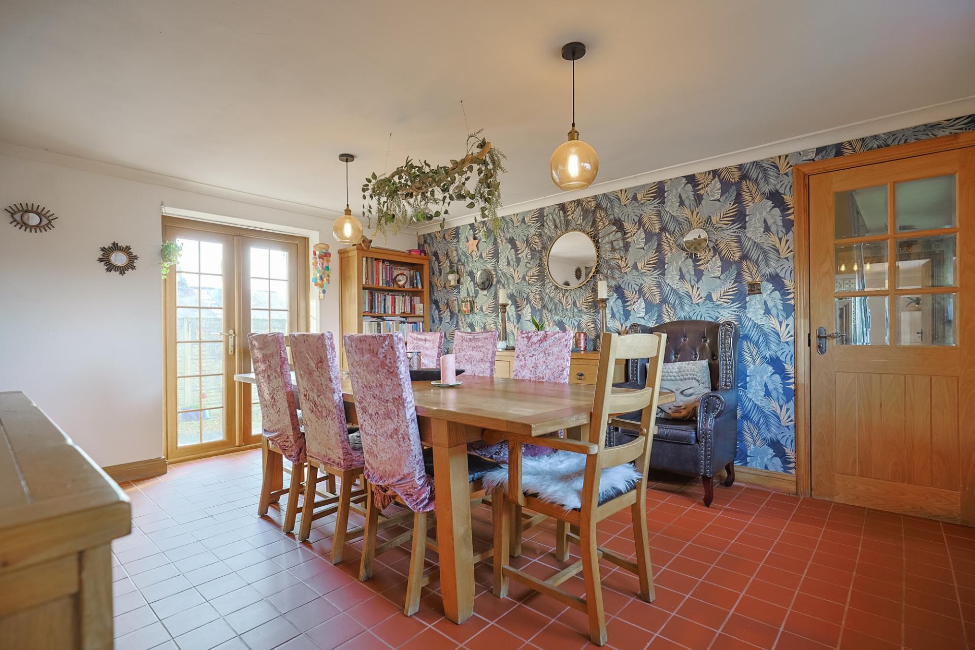 The spacious dining room is perfect for entertaining, offering double patio doors to the rear and a window to the front which showcases rural views. Laid with terracotta tiles, this room provides ample space for a large dining table, ideal for hosting family and friends.