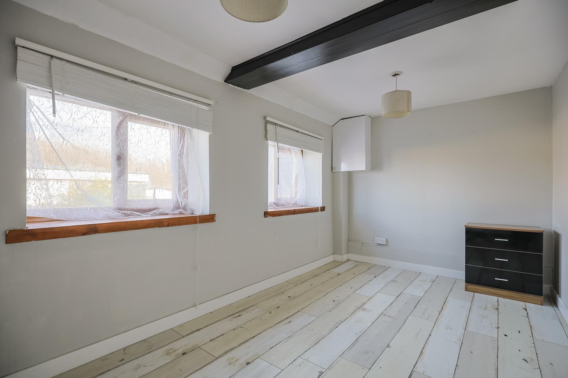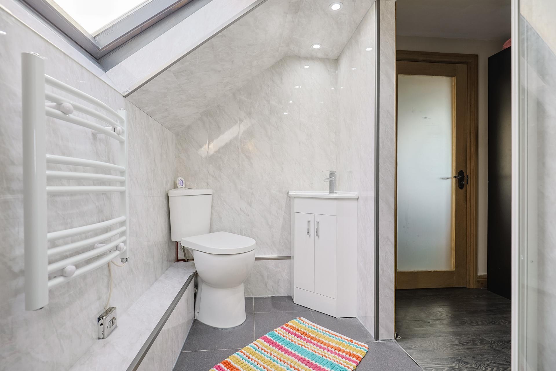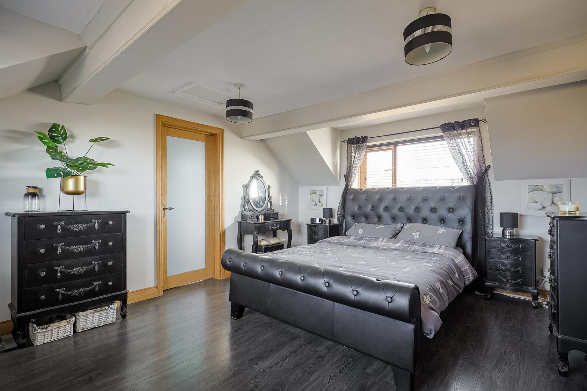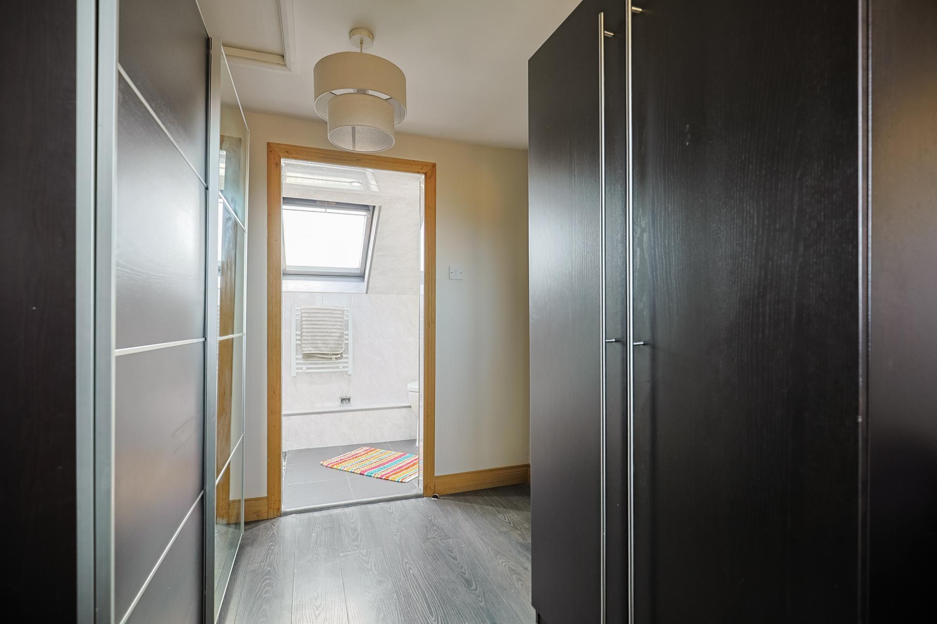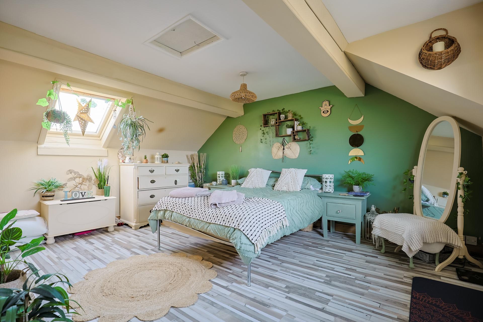 This lovely principal bedroom features dual-aspect windows offering views to the front. The room includes vinyl flooring, a vaulted ceiling, and access to a walk-in wardrobe with ample storage. From the wardrobe, you’ll find a private en-suite with a WC, wash basin with storage, double shower, heated towel rail, extractor fan, spotlighting, tiled flooring, panelled walls, and a Velux window.