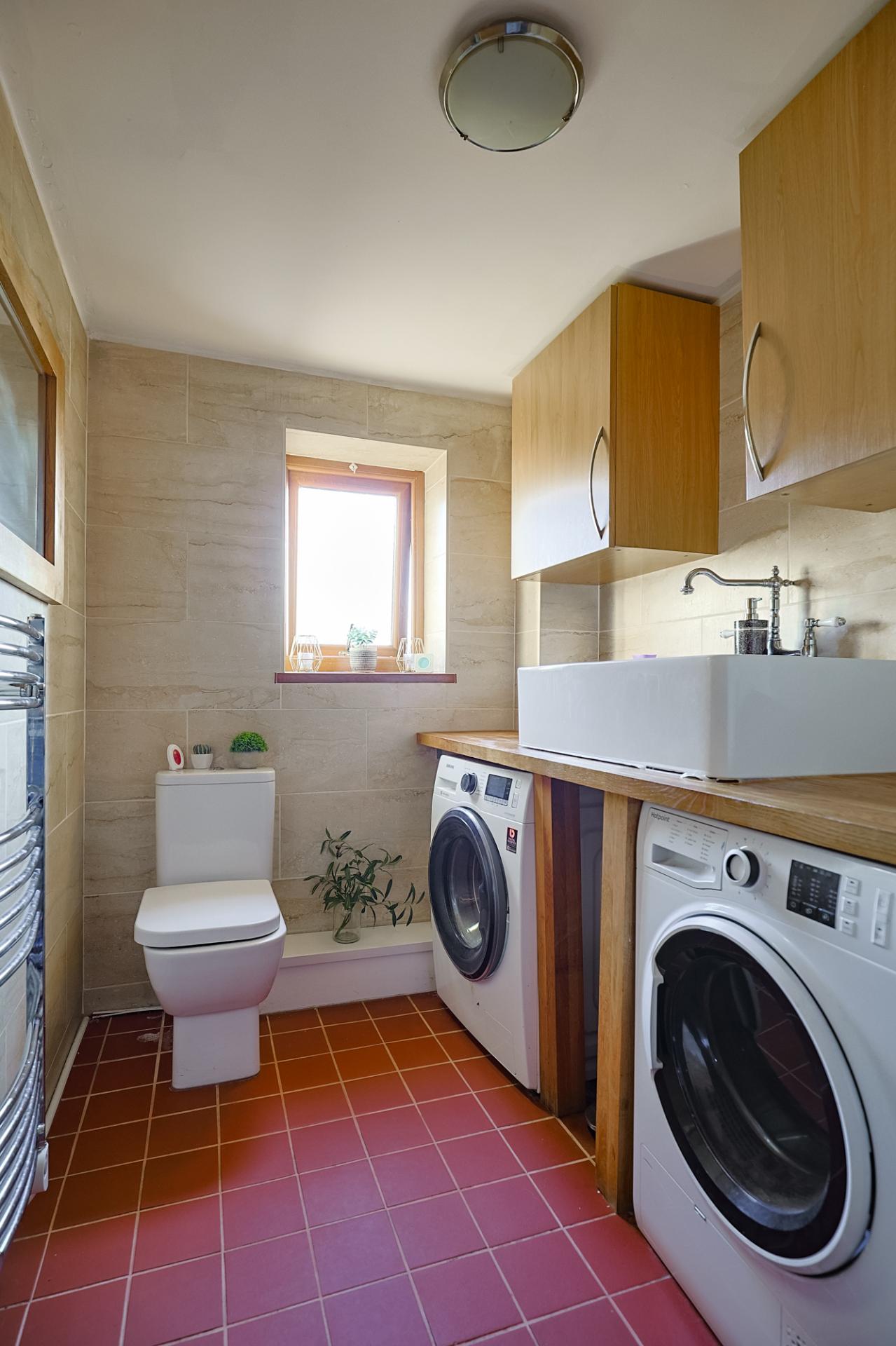 This practical ground-floor utility and WC are laid with terracotta tiled flooring and feature tiled walls. The space includes a WC, heated towel rail, double porcelain sink, and frosted rear window. Wall-mounted storage units, an additional storage cupboard, and room for two under-counter appliances complete this functional area.