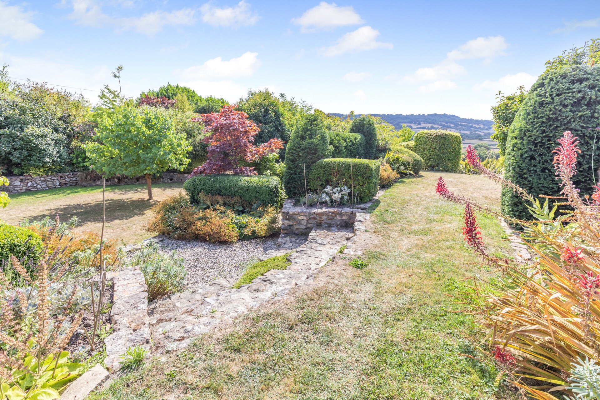 Set in just over seven acres, Budleigh Farm combines beautifully designed formal gardens with complete privacy. The gardens have been thoughtfully planned to follow the sun throughout the day, all while enjoying the stunning backdrop of the Blackdown Hills, where amazing sunsets are guaranteed. A balance of elegant design and relaxed spaces creates a seamless connection between the gardens and the main living areas of the home. The more time you spend in the gardens the more you become aware of the subtle designs that flow throughout the gardens.