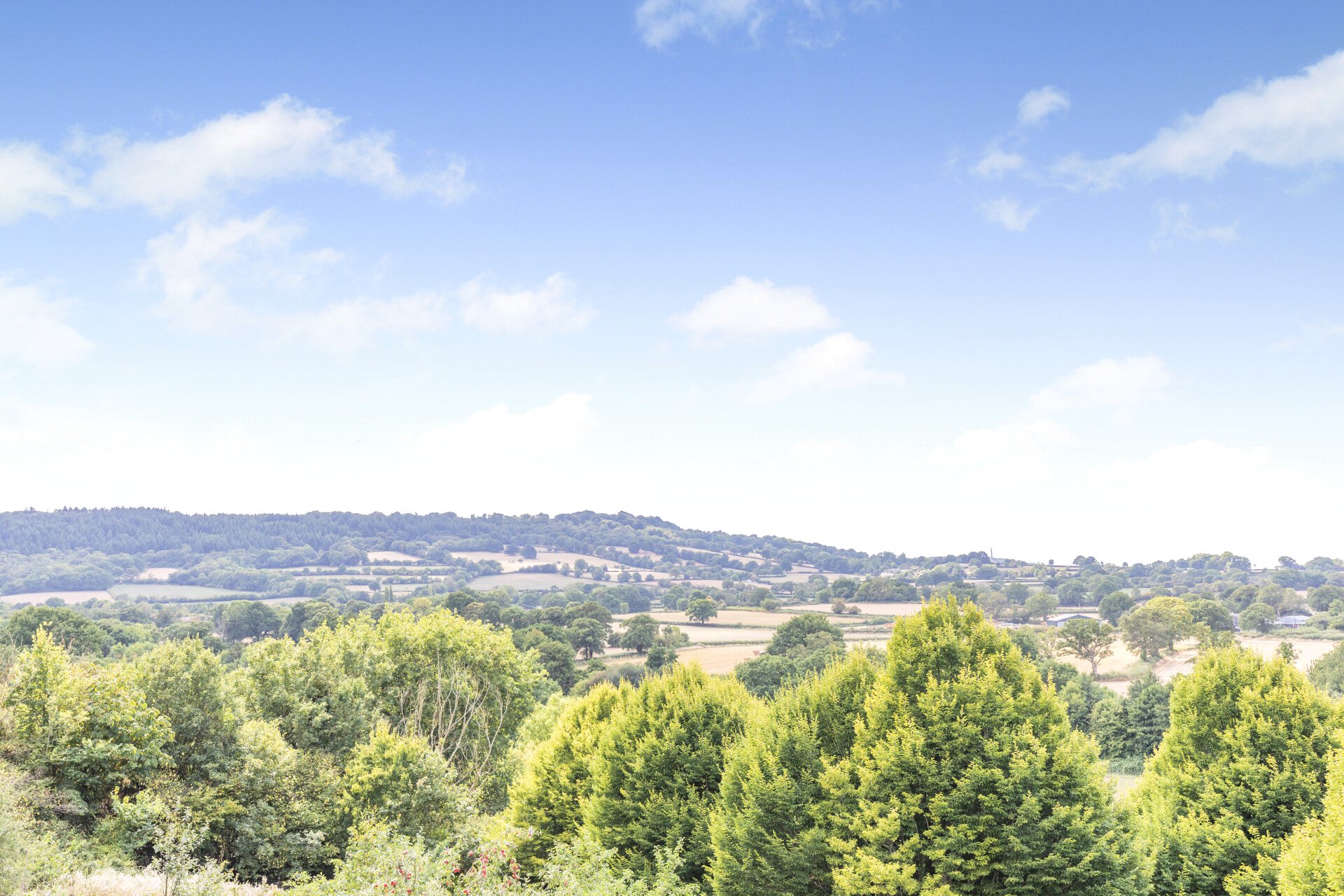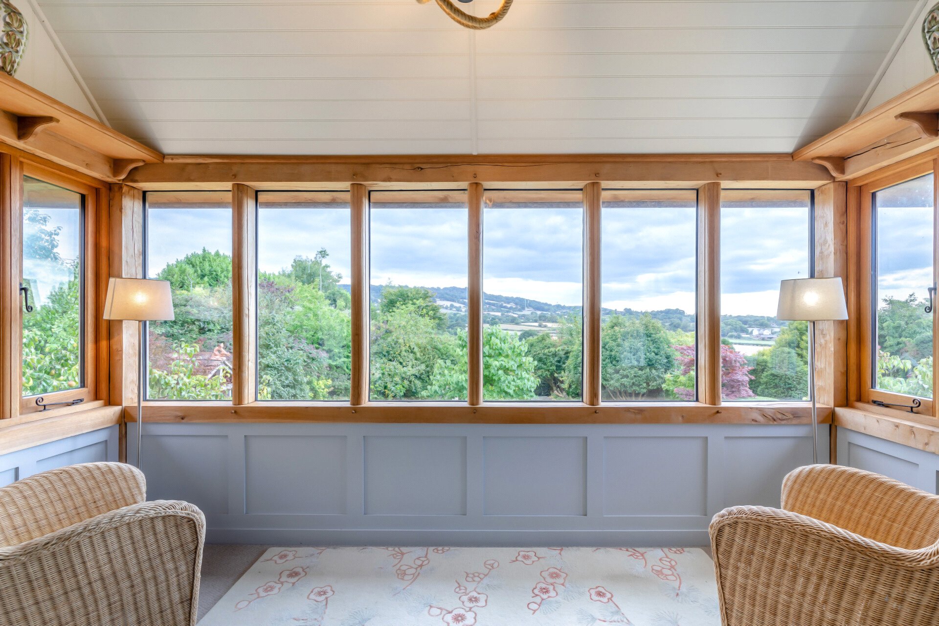 What is so surprising is that you get no inkling at all as you drive to the house, or from the outside. It’s only when you get to see the other side you get to appreciate the magic of what the elevated position gives. It’s not just a view , it’s a whole landscape…ranging over the Blackdown Hills, the Wellington Monument in the distance, across the end of the valley and west out to glimpses of Exmoor. And such big skies!