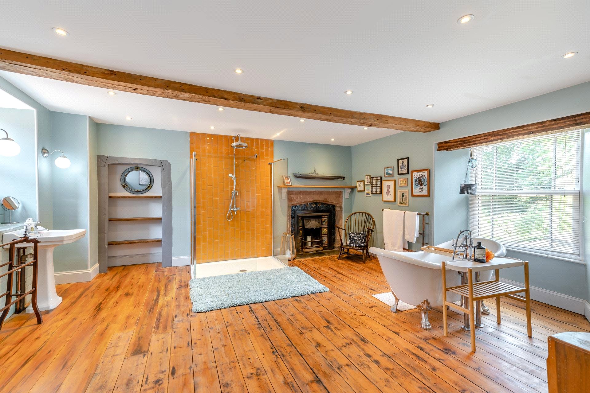The first-floor accommodation offers an abundance of space, featuring five double bedrooms. The principal suite is particularly impressive, complete with a walk-in dressing room/wardrobe and a large, well-appointed en-suite shower room. Two additional guest bedrooms also benefit from their own en-suite facilities, ensuring comfort and privacy for family and visitors alike. Bedrooms four and five are served by a beautifully created family bathroom, where the luxury of space is matched by thoughtful design, featuring a double walk-in shower enclosure and a freestanding roll-top bath perfectly positioned to take in the views across to the Quantocks. A truly lovely and indulgent touch.