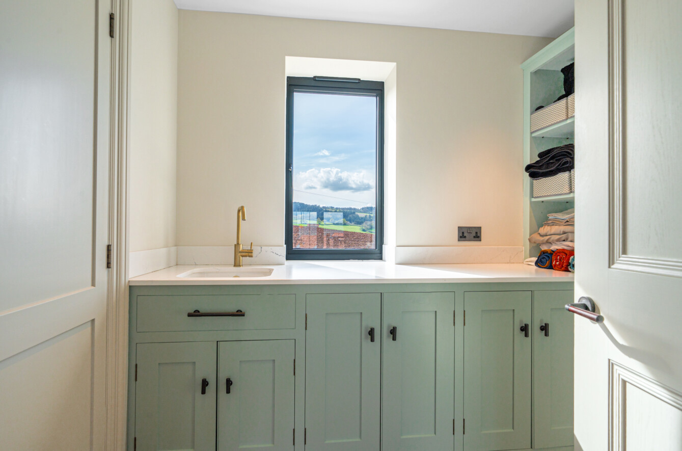 A boot room with warm water walk in shower facility, ideal for muddy children or pets. A ground floor bedroom provides flexible living space whilst frameless Juliet balconies extend from both principal bedrooms, offering uninterrupted views and a seamless connection to the outdoors. A dedicated laundry room on the first floor with air source drying cupboard where the air flow gently dries them without using a tumble dryer.