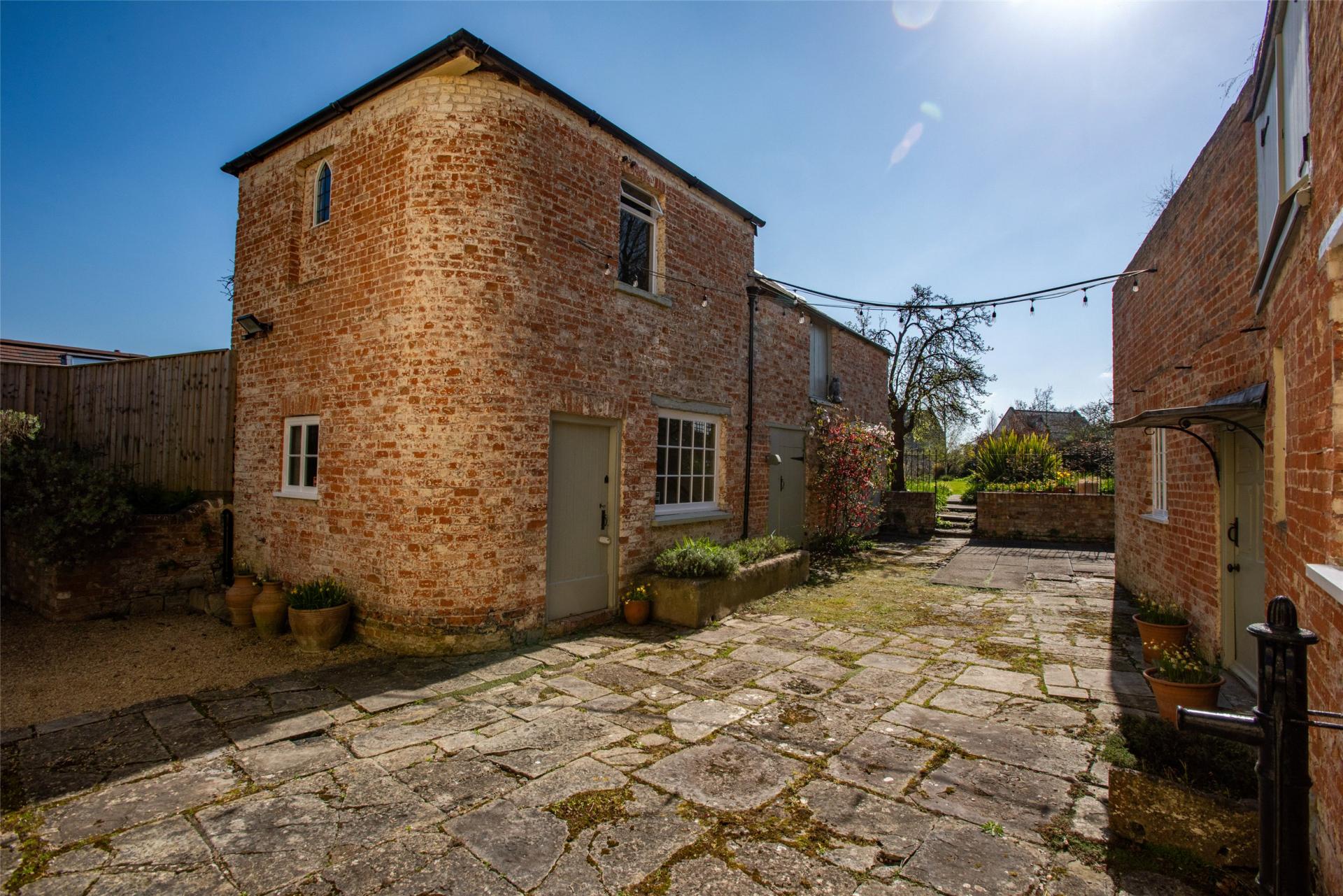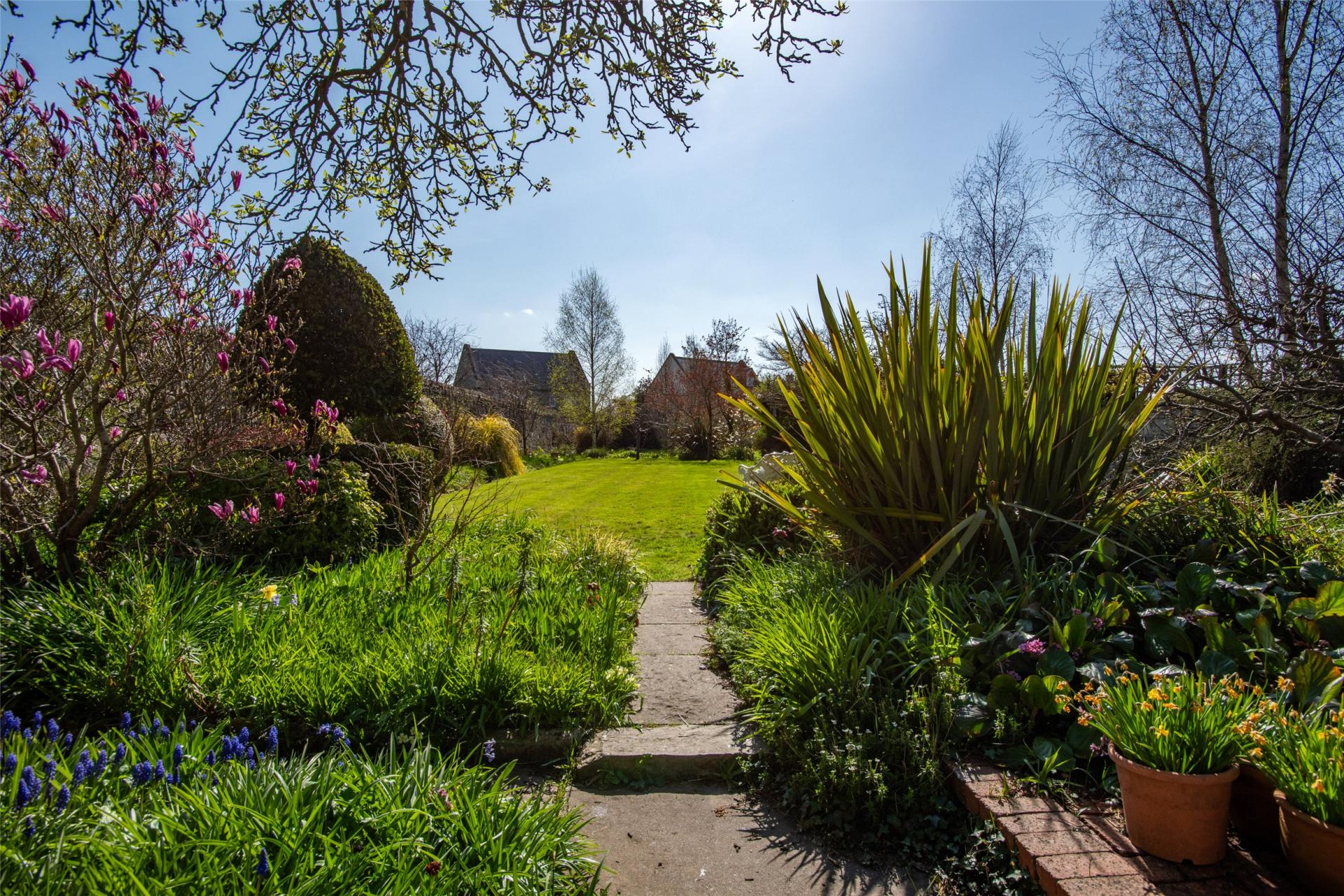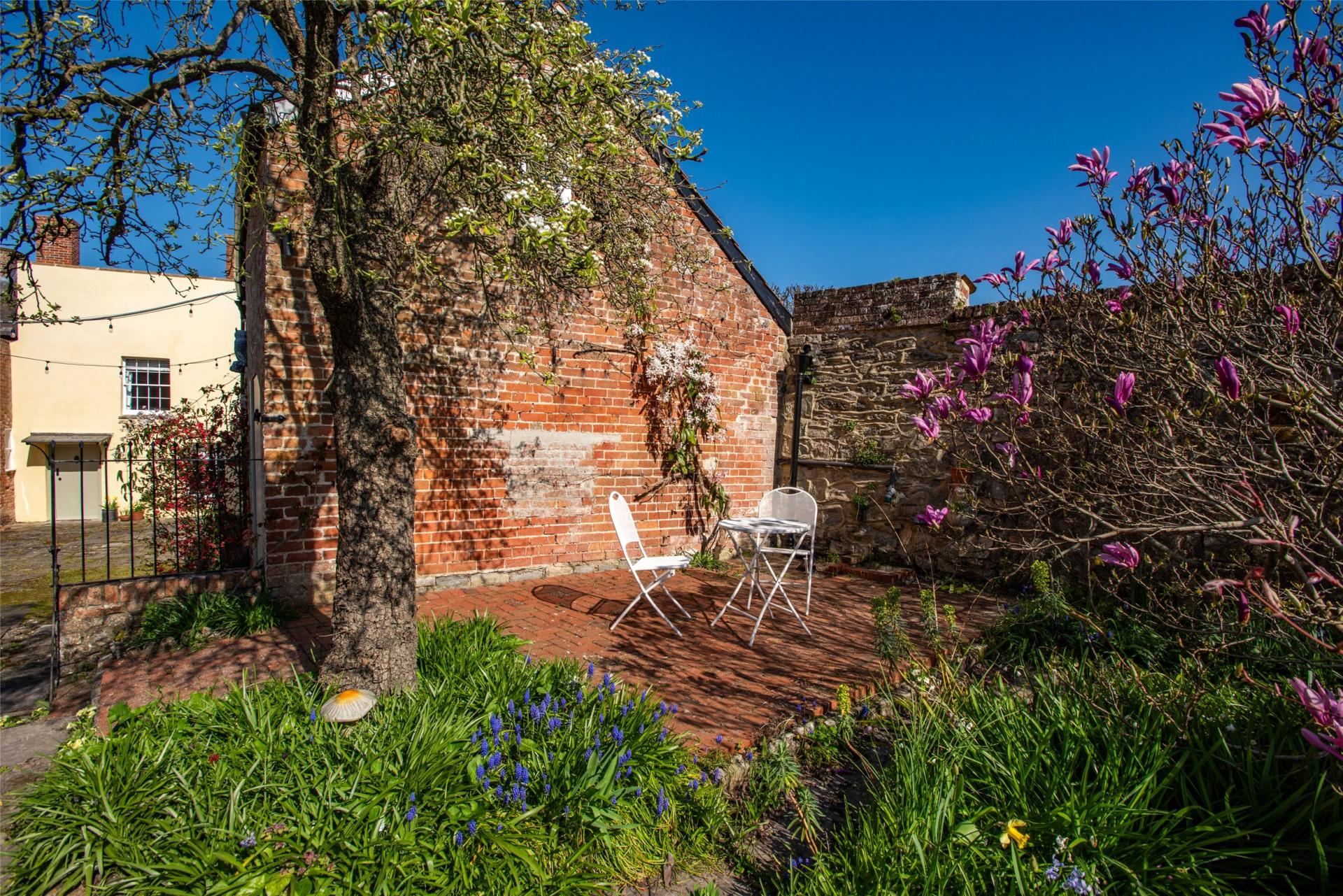 A short flight of steps rises to a sun-trap terrace, perfect for enjoying morning coffee beneath a canopy of mature ornamental trees. Beyond, the walled rear garden stretches out behind the main house and is filled with established planting including bay, lilac, bramley apple trees and mixed flower beds.