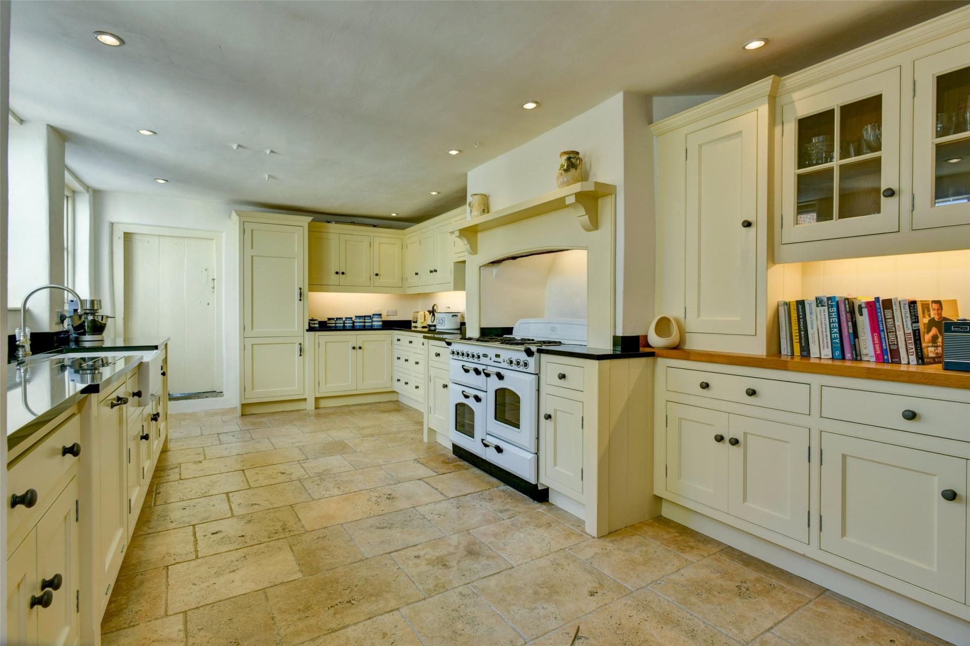 The kitchen is well-equipped with a range of traditional cabinets and a feature fireplace housing a Rangemaster cooker with five-ring gas hob. An offset breakfast area adds a touch of relaxed charm. There’s also a walk-in pantry and a useful garden room with flagstone floor, French doors to the terrace, and access to the courtyard.
