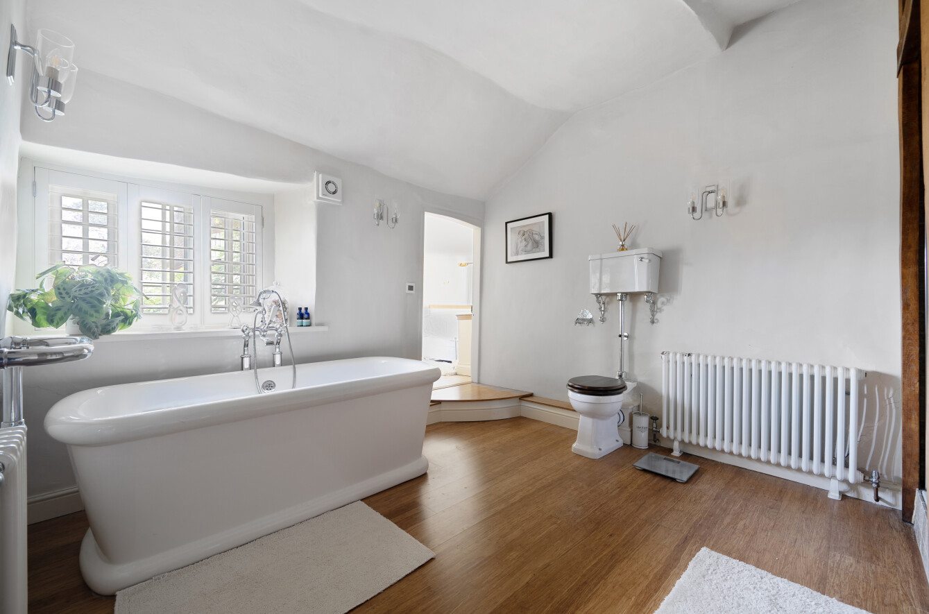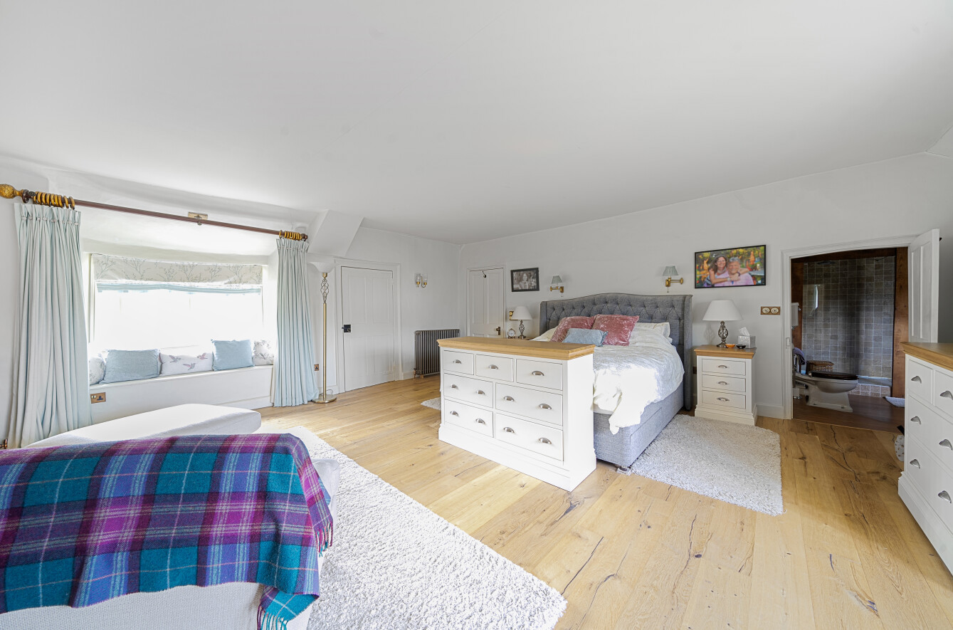 There are four generous bedrooms, each with its own individual character and charm. However, the principal bedroom suite truly stands out, offering an exceptional sense of space and luxury. It comfortably accommodates a sofa, features a handsome fireplace, and benefits from charming window seats with views over both the front and rear aspects of the property.
