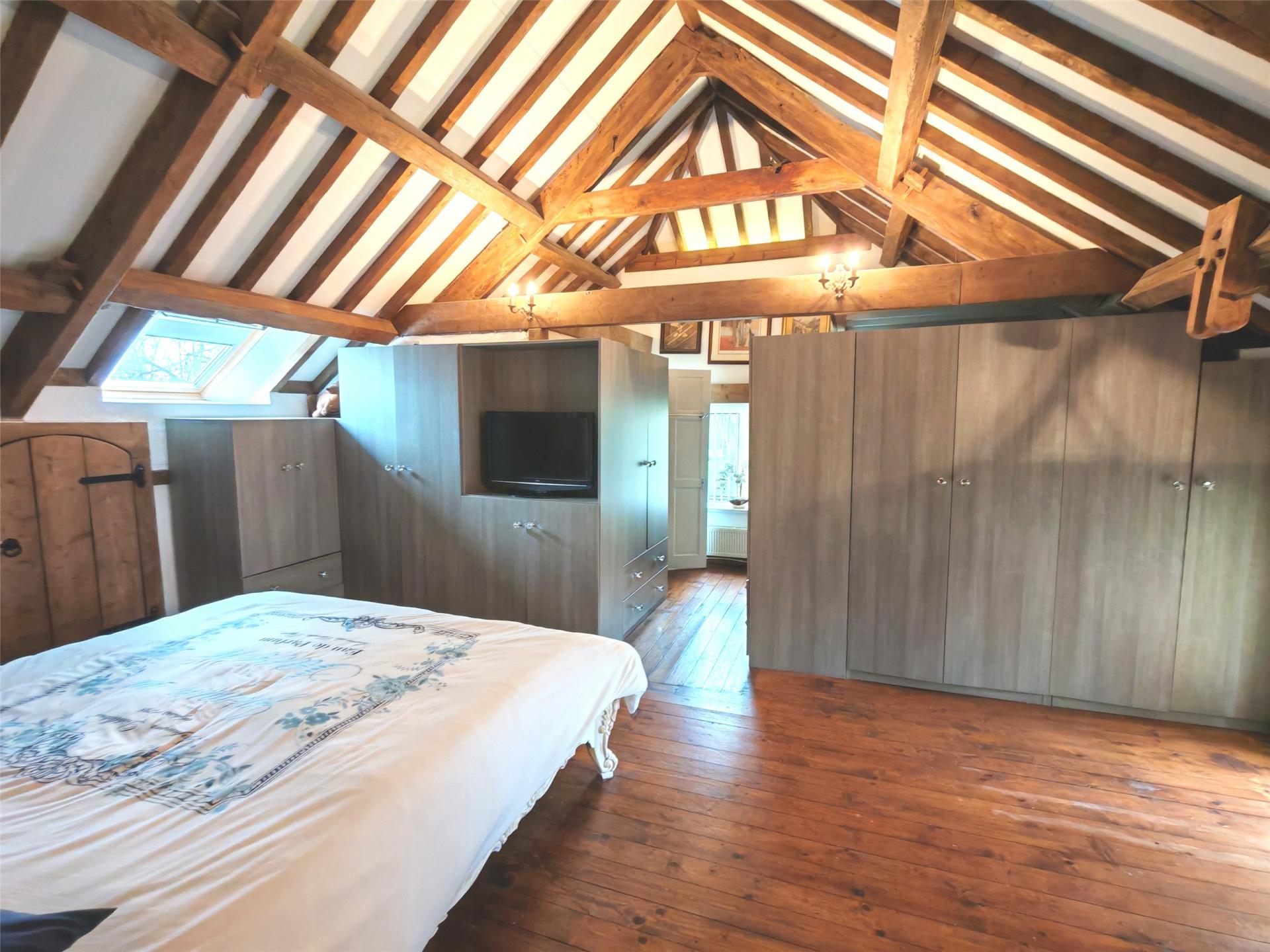 Stairs from the far end lead to a galleried sitting area, perfect for reading and relaxing with views over the main reception hall and door directly to the large principle bedroom – with extensive range of wardrobes, dressing area and windows to the gardens. An en-suite bathroom compliments this private suite. There is under floor heating to the principle bedroom as well.