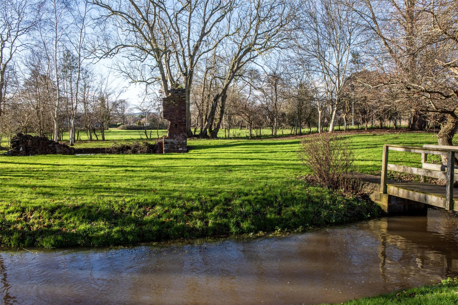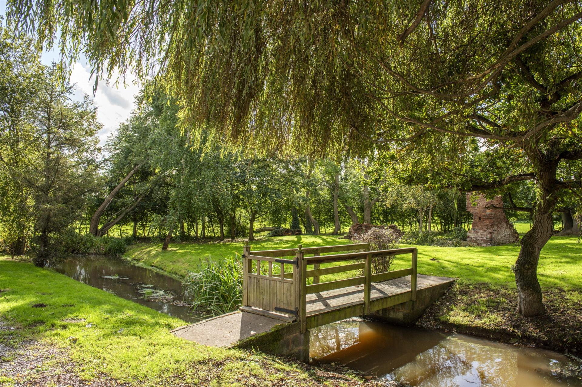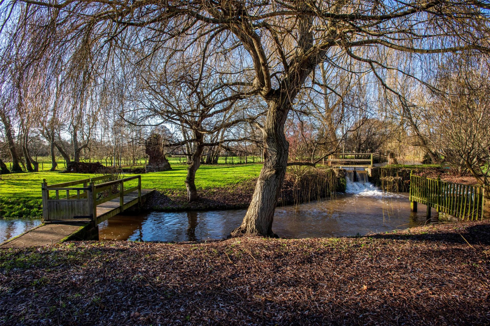 There are two areas of garden interconnected by foot bridges leading to grassed areas with established trees. In addition, there are the remains of the former miller’s cottage.