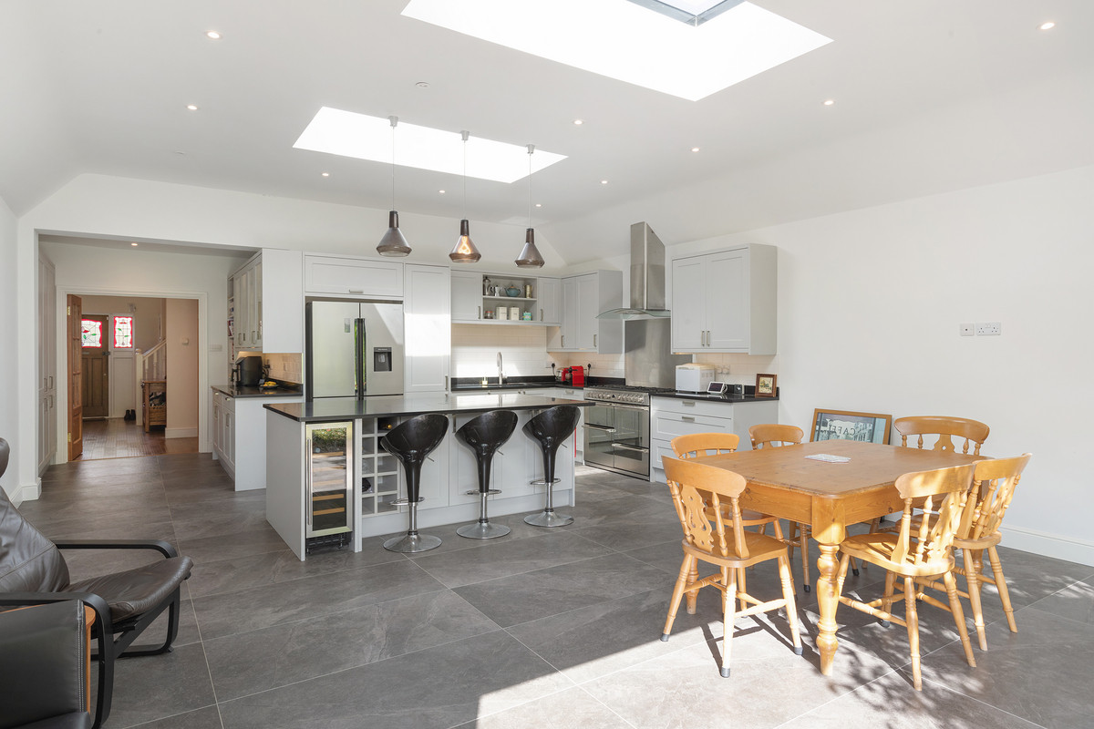 The expansive kitchen diner is a standout feature, recently upgraded with skylights that flood the space with natural light. It comes fully equipped with modern appliances, and also provides direct access to the 100-foot garden, making it a superb space for entertaining.