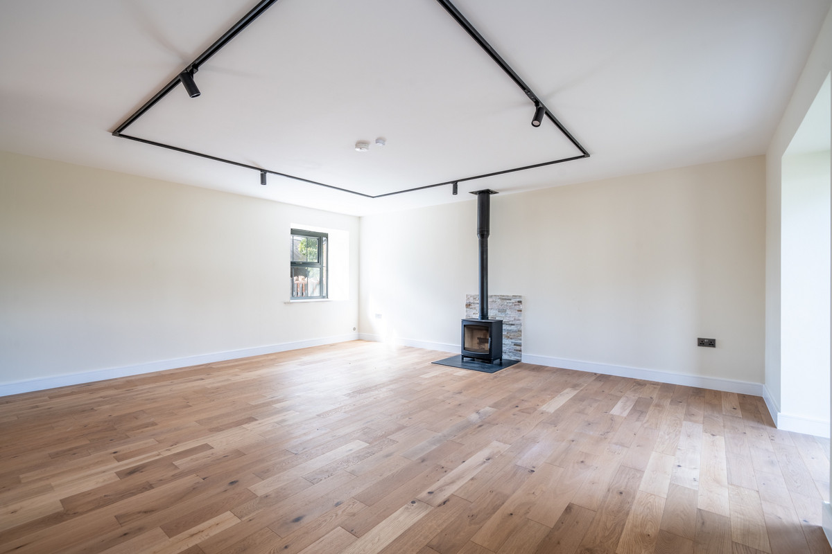 Every detail has been thoughtfully considered, from the black-framed aluminium windows offering striking contrast to the countryside views, to the under-floor heating providing comfort year-round. The lounge’s log burner further enhances the cozy ambiance, while inset spotlights and chic fittings flood the rooms with light.