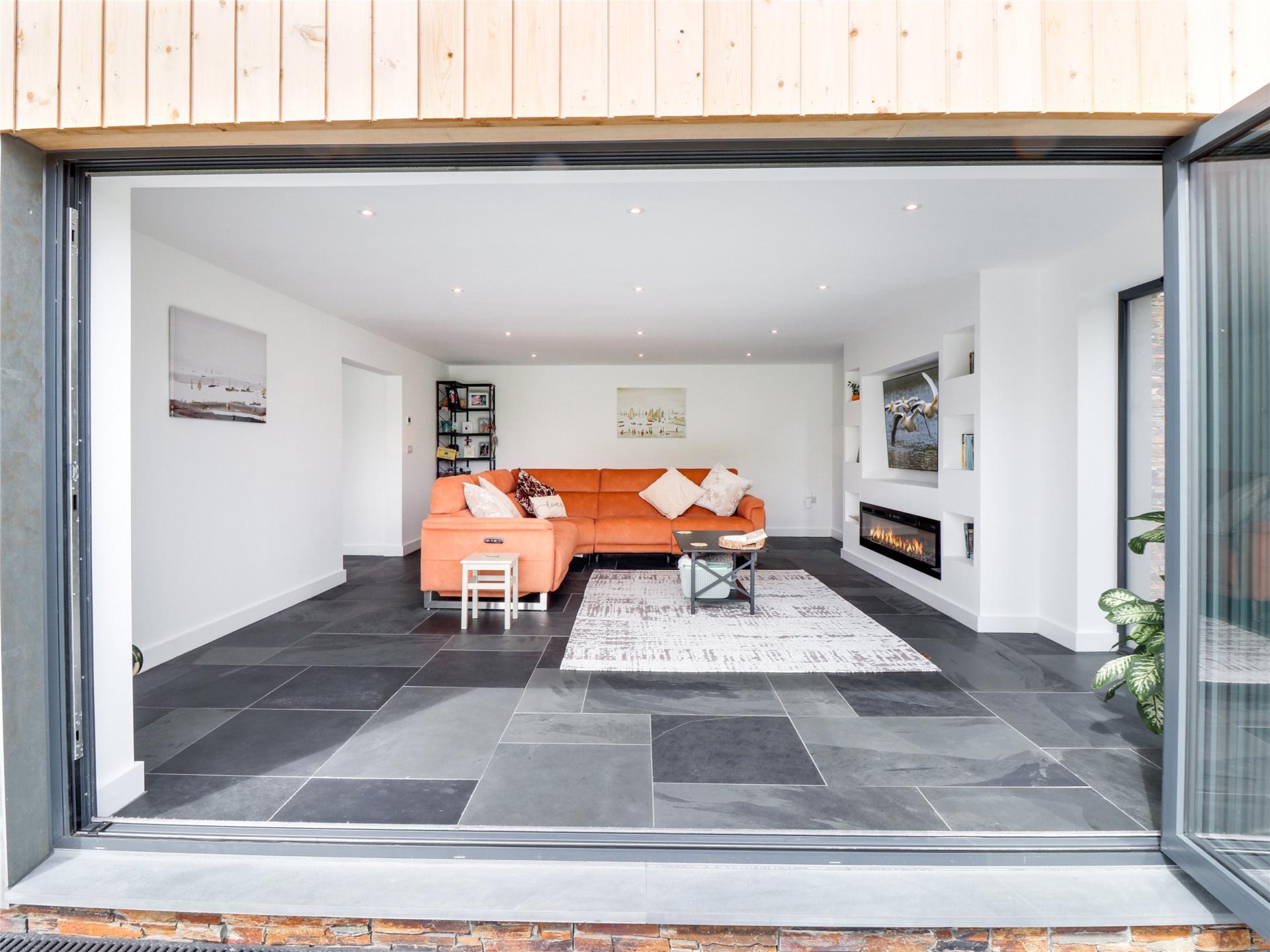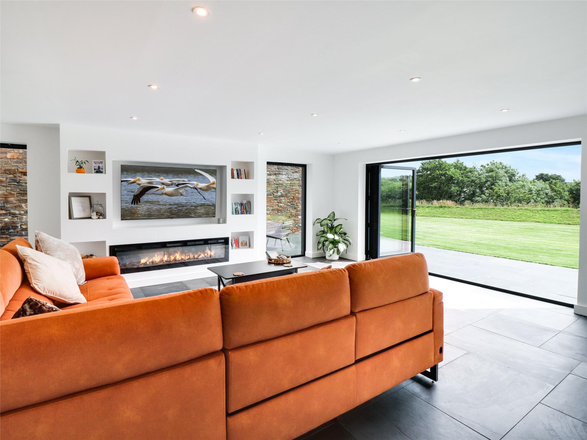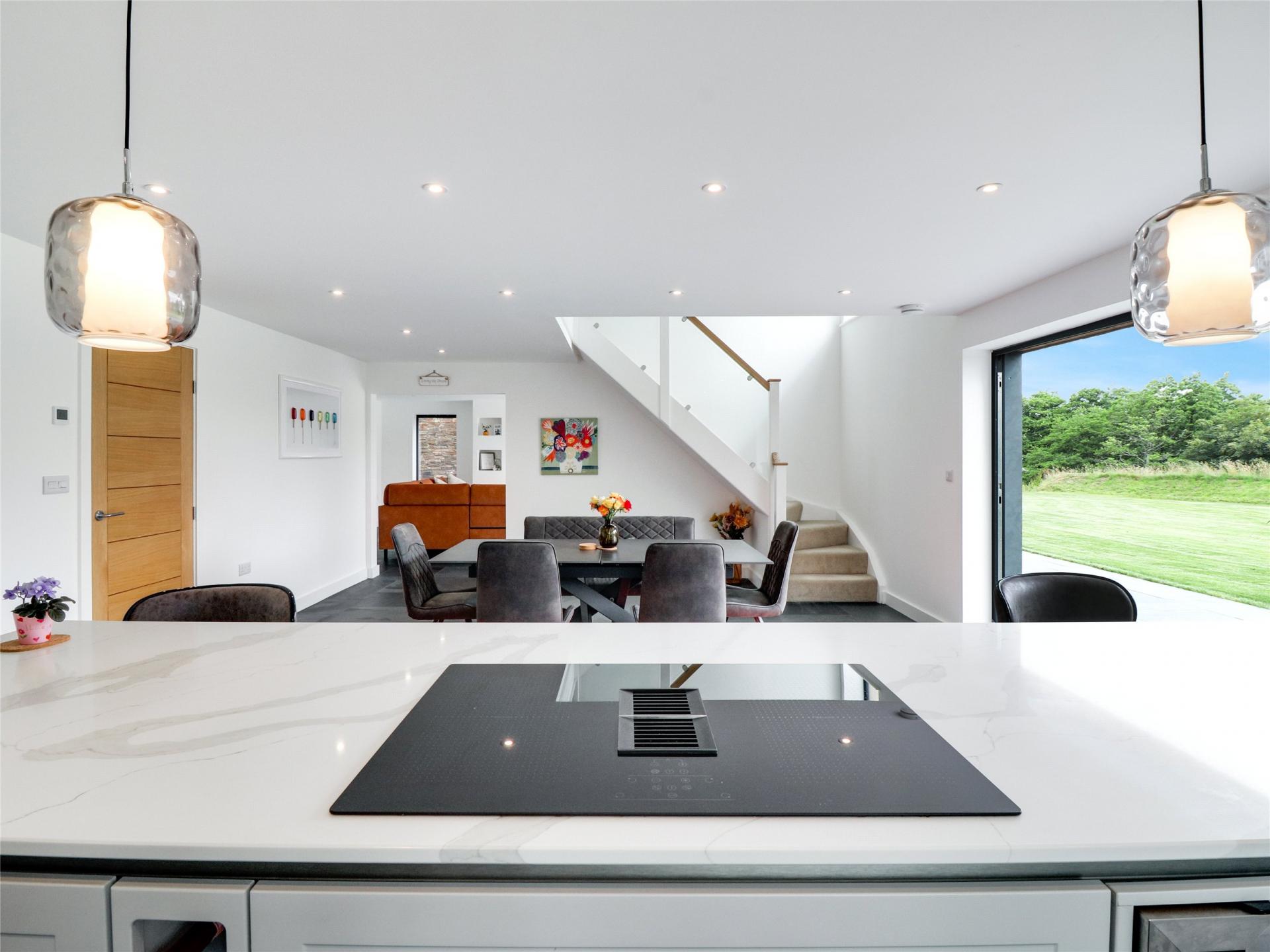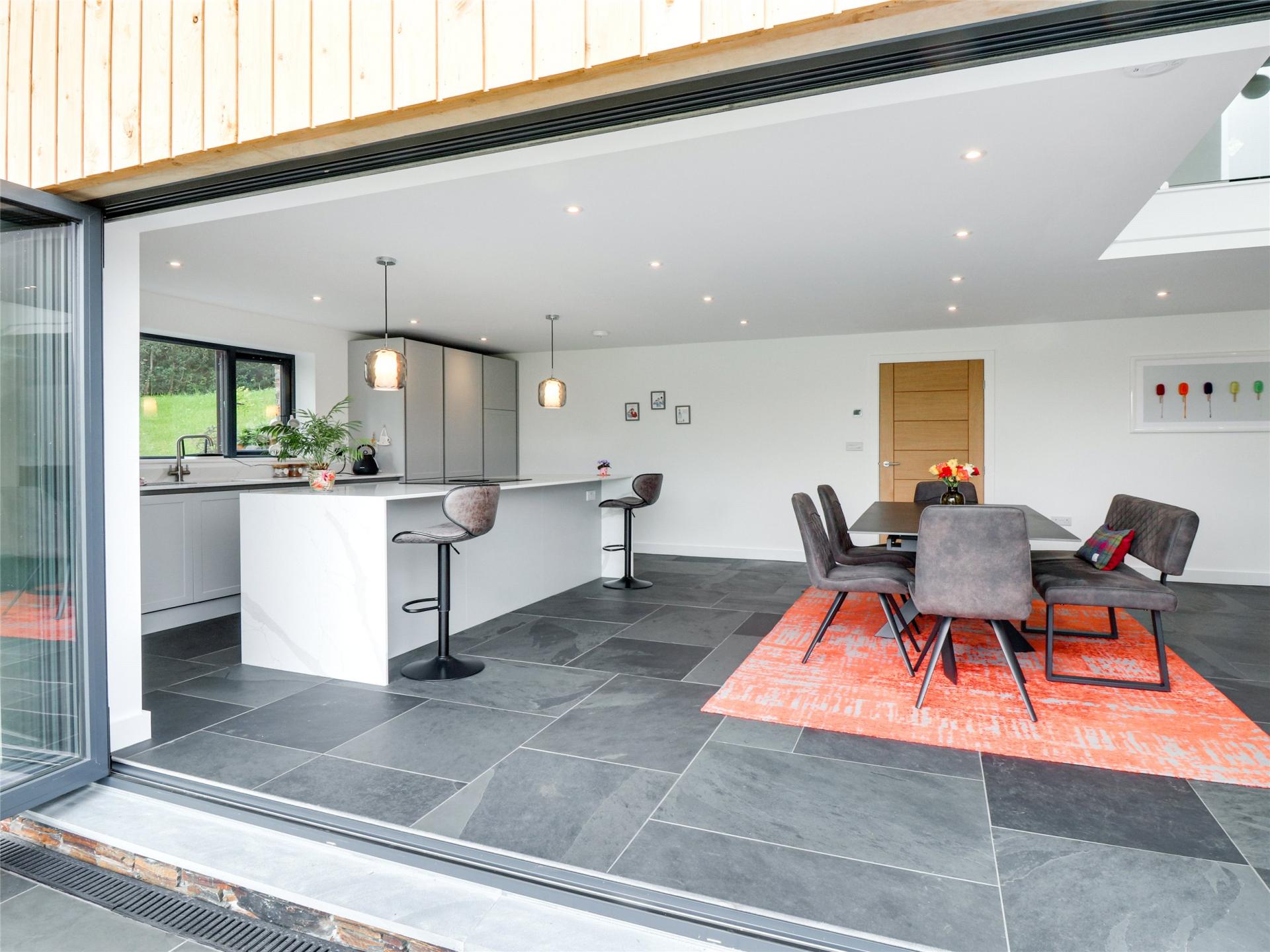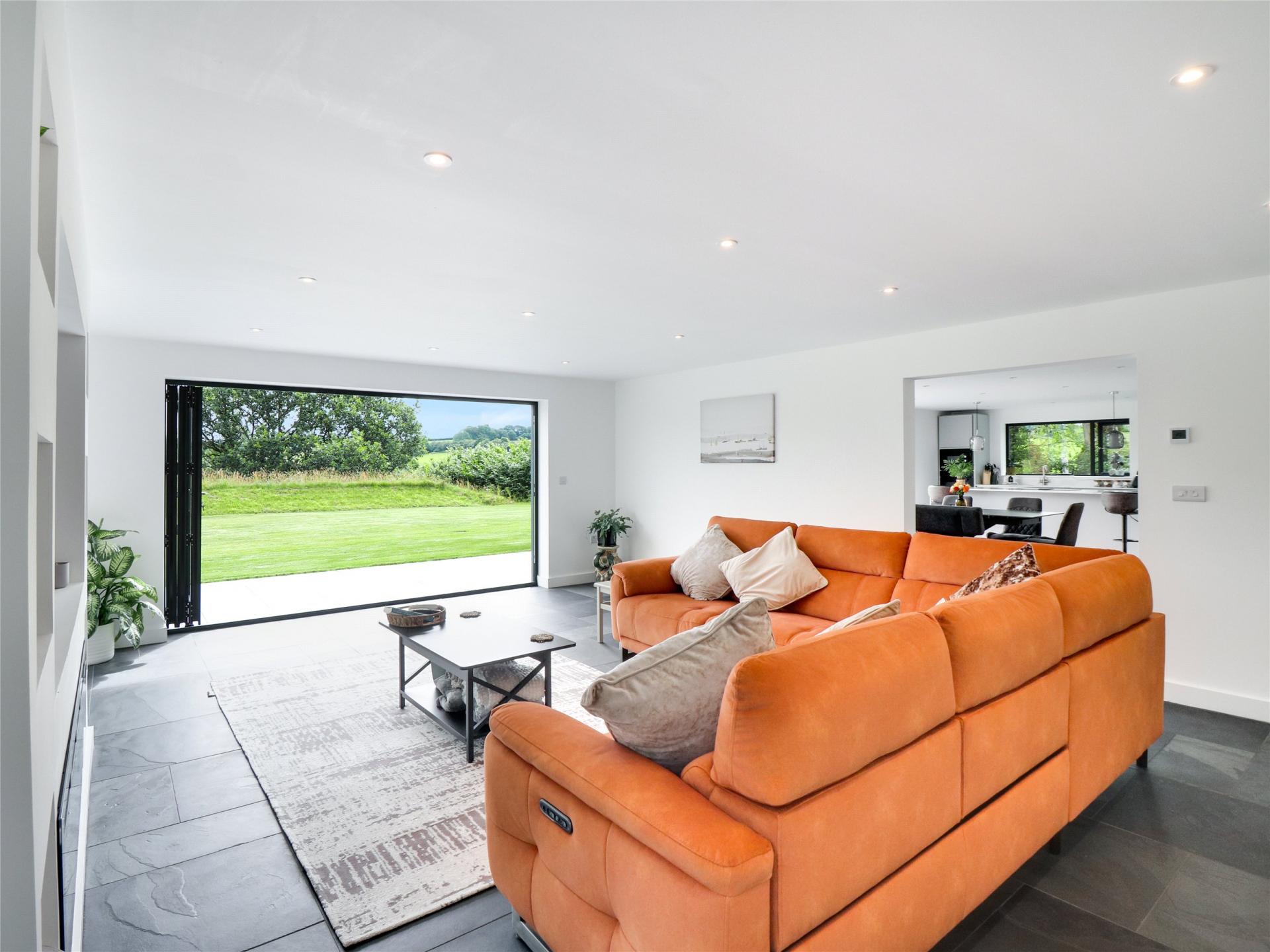 Taking the stairs down to the welcoming open plan kitchen/dining /family room you are struck by the amount of light coming in through the trifold doors and the large window behind the kitchen area. The kitchen has been designed with the minimum of walking between appliances and maximising the social aspect having a large quartz work top with bistro dining on one side. All the units are soft close with cupboards, pan drawers, integral cutlery tray, larder unit with four deep pull out drawers and so on. Out of sight behind the central island is a bottle rack and separate wine/bottle cooler. Appliances include an Inset is an induction hob with integral down draught extractor, oven with separate microwave, 12 piece dish washer and larder fridge with separate freezer. The rest of the room is however the new owners wishes to set it out having plenty of room for a large refectory style table and easy chairs, all sat upon an underfloorheated slate floorwhich continues into the sitting room. Leading off is a large utility room with what can only be described in one part as the engine room of the house, having an almost floorto ceiling pressurised hot water tank, expansion vessel, the inward connection point for the PV panels, the underfloorheating valves and on the outside wall is found the LG Air Source Heat pump. The rest of the room allows for plenty of storage for outdoor clothing and footwear and on the opposite side is an oak block top with space for a washing machine and tumble dryer and a door takes you to the outside. Finishing off the accommodation in this part of the down stairs is a large shower/ cloakroom following the same style and fitmentas the en suite and family bathroom. The sitting room is a lovely double aspect room with recess for a 65” television with contemporary slimline remote control flameeffect fireunder and display recess to either side. The trifold doors invite you out onto the full width terrace and patio which is an ideal spot for some al fresco entertaining and dining.