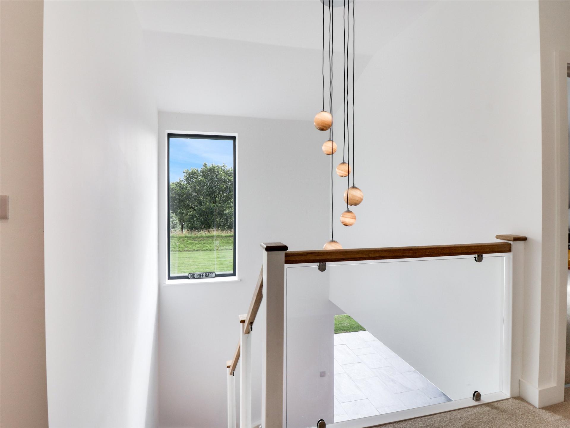 A slate path guides you to the continental styled composite front door and coming in through it into the reception hall you get a real sense of what this home is about. The firstthing you notice is the large picture window through which you see the country side and the amount of natural light through it bathes the landing in natural light. One of the many design features in the property include a glass and polished chrome balustrading which continues down the stairs.