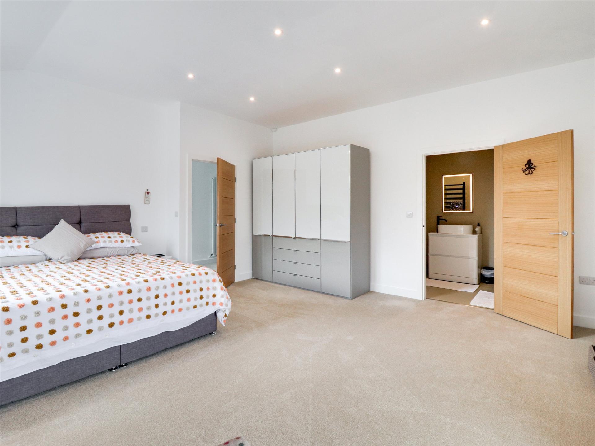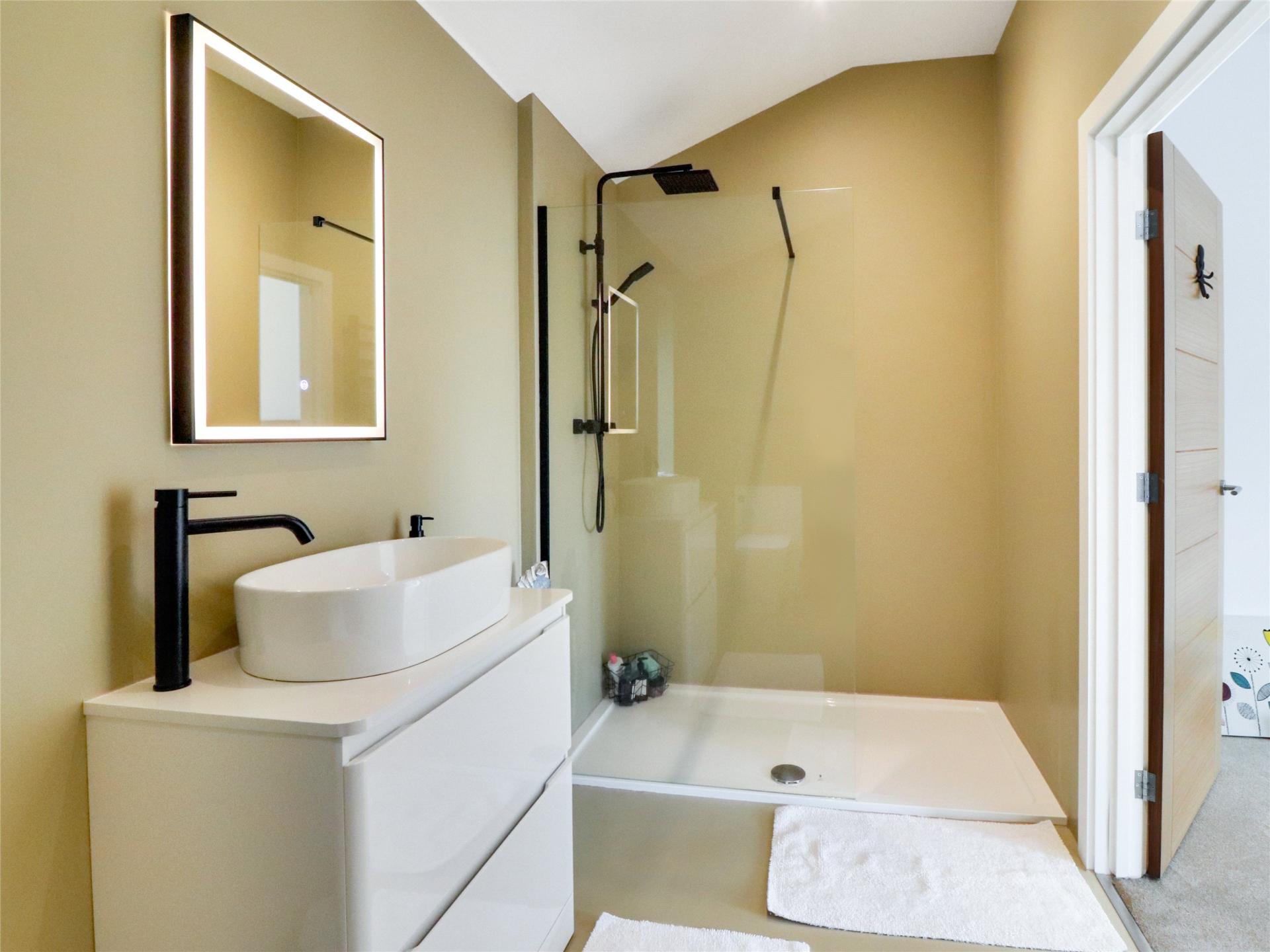 The size of the main bedroom would be a credit to many a sitting room and being double aspect enjoys a wonderful rural outlook especially on the eastern side through the large window. The positioning of the windows and doors within the room allow for an extensive range of wardrobes in two locations and above one there is a cabling point for internal lighting. The en suite has micro cement coloured walls as used heavily on the Continent and the result gives a very clean and modern twist as there are no tiles to be cleaned down. The contrast of the matt black taps, shower heads, heated towel rail, the gloss white back to wall cistern WC, freestanding counter top vanity with basin and illuminated LED mirror add to the luxury and calming feel. Across the landing are two further double bedrooms, again with cabling for wardrobe illumination, and one of these, being some 17’ in length, allows for it being a work from home room as well. These two bedrooms have use of the family bathroom the centre piece being a gloss white freestanding bath with floormounted taps and display recess inset into the wall. The theme of coloured micro cement on the walls and flooralong with black bathroom fittingsis carried though from the en suite.