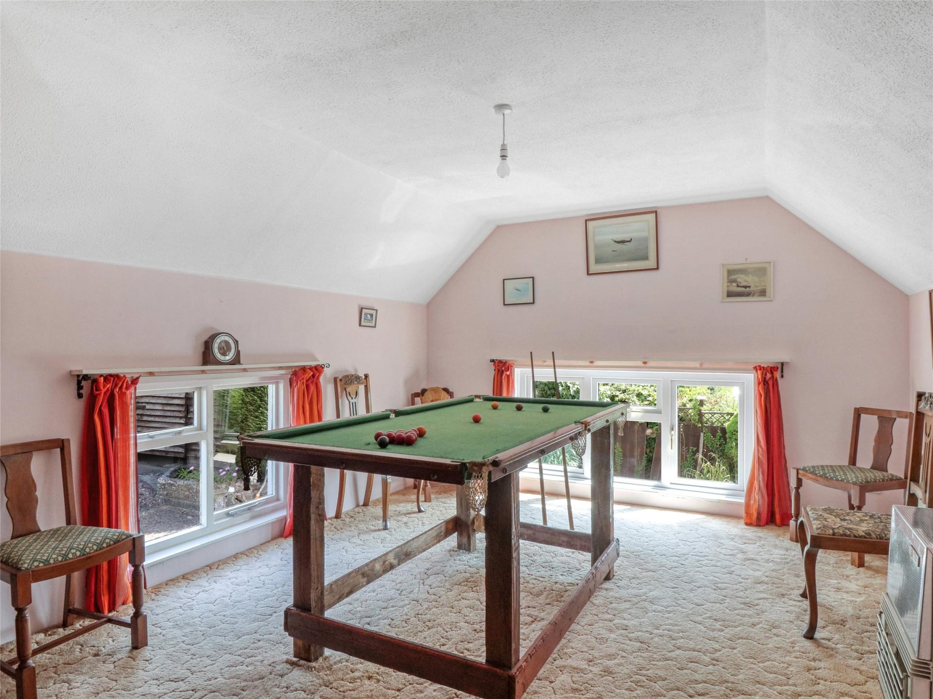 The first floor split level landing leads you to an enormous 19’ double aspect bedroom at the front having a range of cupboards and those views again. The same views are enjoyed from the other double bedroom at the front and from the single bedroom. Currently used as a games room the remaining bedroom is a large double aspect double room with views up the rear garden and a range of fitted cupboards and dressing table in situ. The family bathroom has a coloured three piece suite with shower over bath.