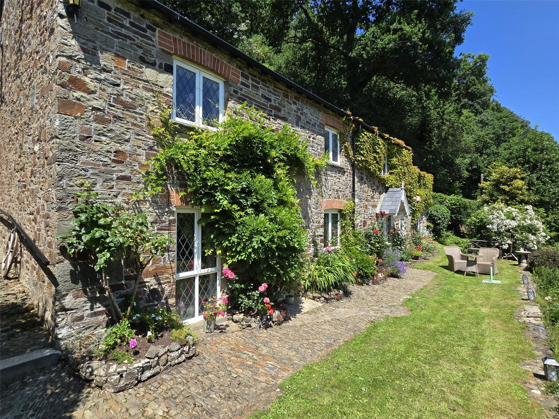 The gardens are a true delight and only come from someone owning a property for a length of time and understanding the nuances of gardening. The shrubs and plants are mature and really help set the scene. Running along the front of the cottage is a cobbled stone path and lawned terrace, overlooking the lawns below. Sitting here in the sun listening to the burbling stream as it meanders along the lower boundary is very calming. Beyond the formal garden and screened from it by mature Rhododendron and Camellia is a further swathe of lawn which is a wonderful area for energetic children to let off steam and play games. A gate from this area, beside the stone log and garden stores, leads onto the lane behind.