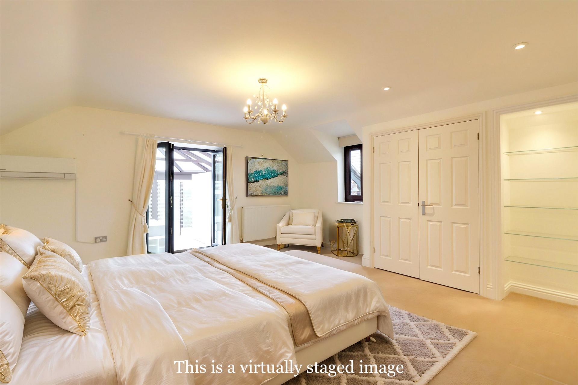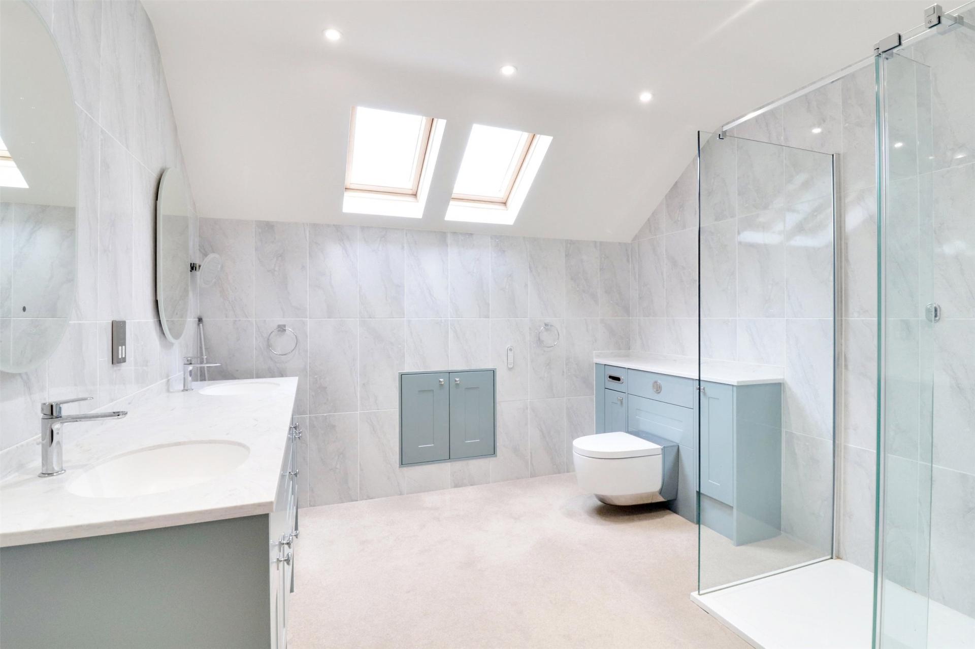 Effectively Latchford has been built on half levels so the stairs are short runs and on the first floor is found a well-proportioned master suite complete with wardrobe cupboards, display shelves, air conditioner and the most amazing dressing room approached via double opening doors and step having views across the pond to the fields beyond. You will not find many dressing rooms like this! The hotel like en suite offers twin wash hand basins with Corian surface, large walk in shower with remote control, tiled walls and Geberit Aquaclean Mera toilet. On the opposite side of the landing is a further suite which is a double room with a bank of wardrobe cupboards along one wall as well as having a stylish en suite shower room with multi jet shower, wash hand basin w.c. and heated towel rail.