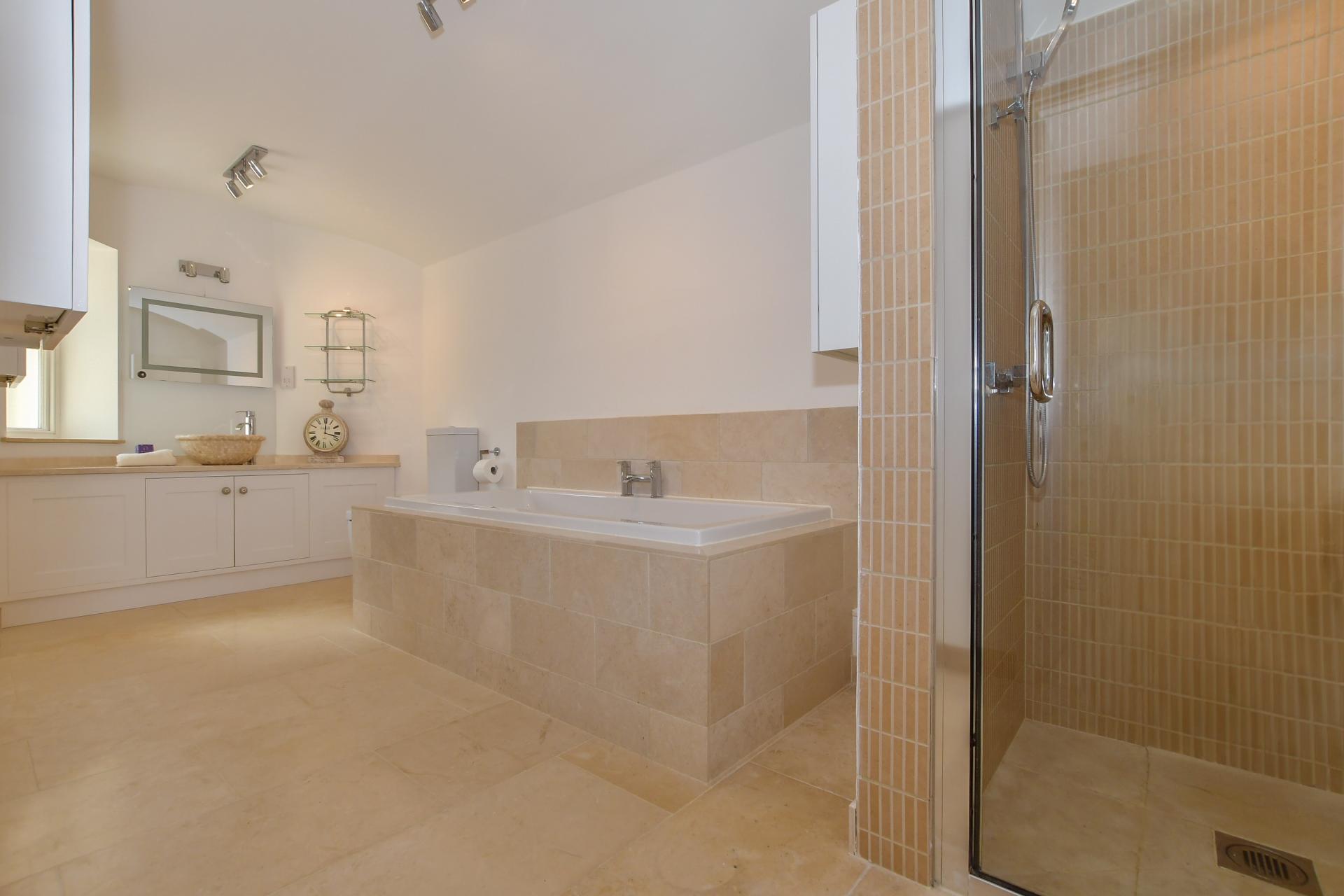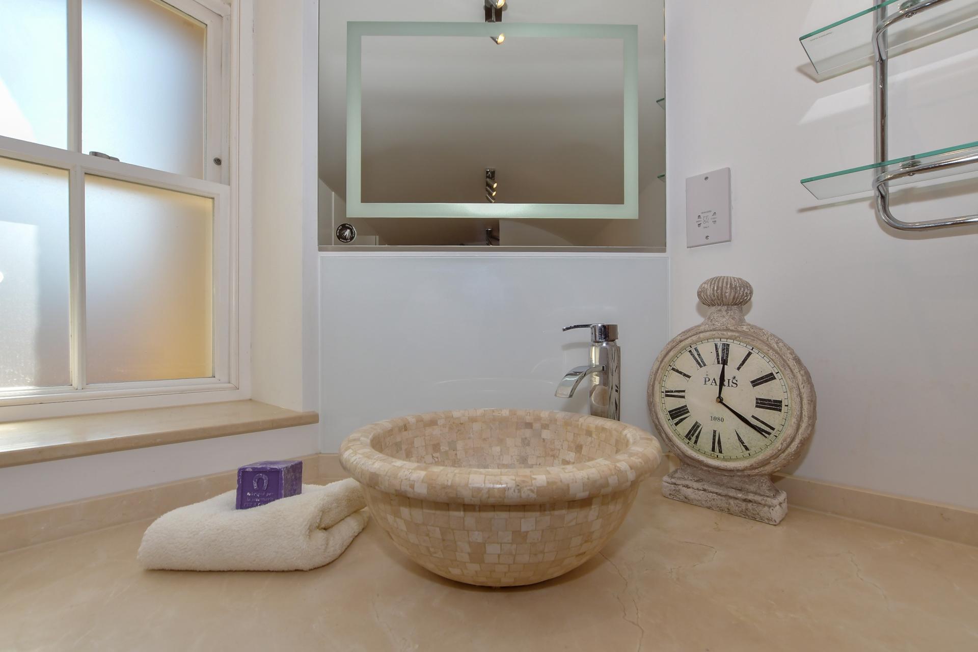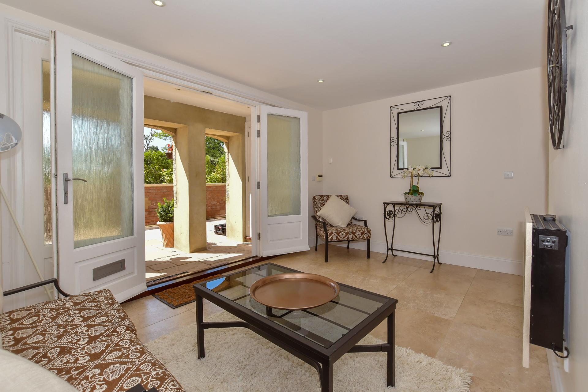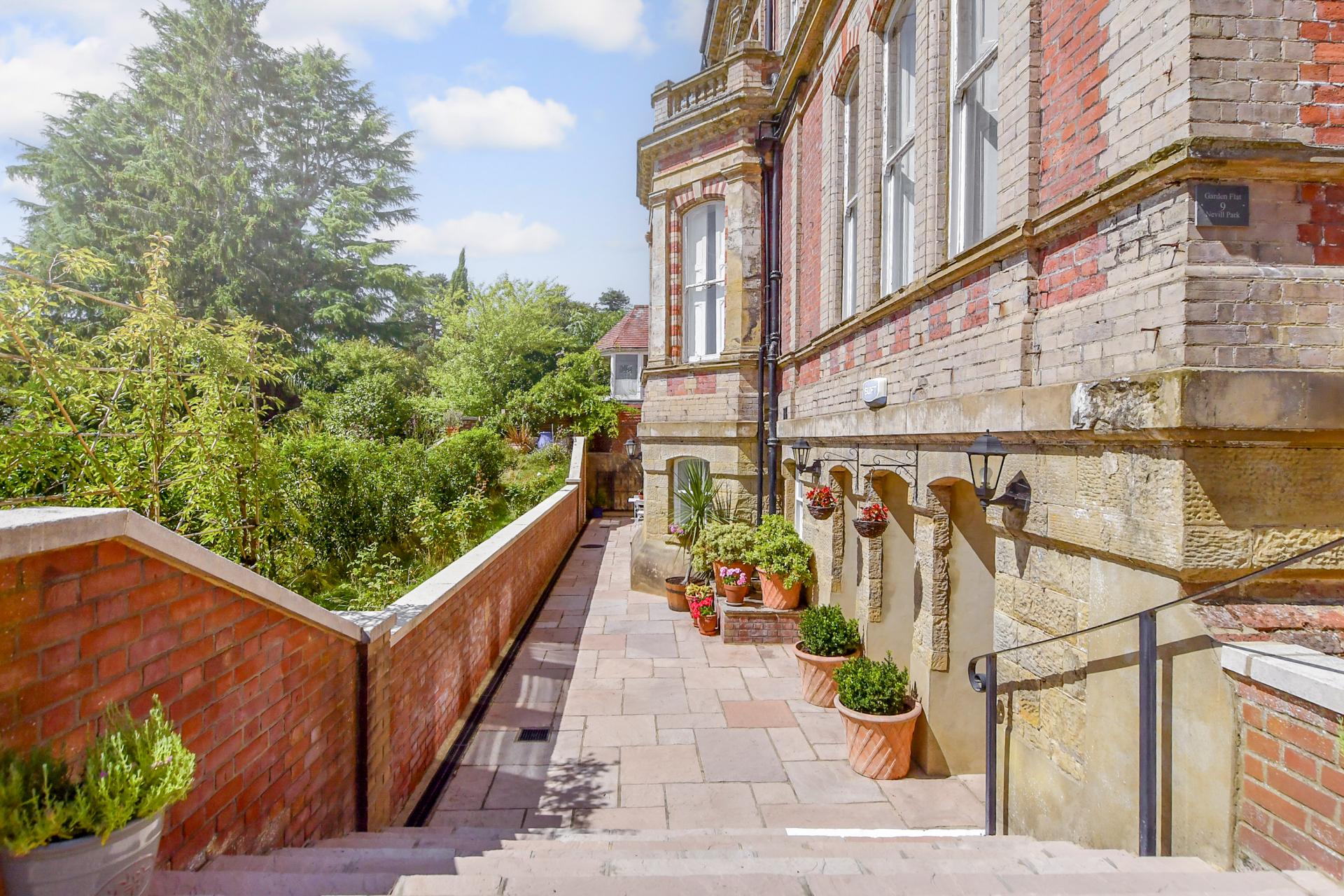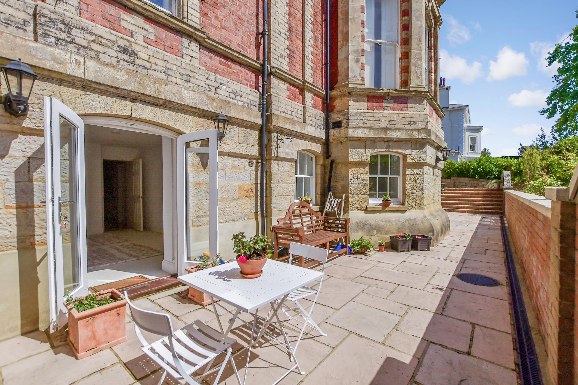 This delightful apartment forms part of an impressive and characterful villa built circa 1861 and is approached along a private drive that leads to the property. This has been divided into four large apartments (one on each floor) and the Garden Flat includes two designated carpark spaces behind the garages. It was renovated and completely refurbished in 2009 and is now an elegant and contemporary flat designed for modern day living but within a period environment. It features large Spanish porcelain floor tiles and limestone flooring with underfloor heating throughout, bespoke double glazed windows, inset ceiling lights and raised flame effect electric fires. Steps lead down to a large south facing terrace that spans the width of the apartment and is a real suntrap. Three impressive stone portico archways are open to a veranda style entrance with storage cupboards and French doors that open into a charming Garden Room. This light space provides wonderful views over the terrace and, even when the weather is inclement or too hot, if the doors are open, you can still enjoy that ‘outdoor’ feeling. Double doors provide access to a stunning open plan living space with a dining/seating and large kitchen areas enhanced by the plethora of white units housing a double oven, hob and additional appliances. There are built in storage units in the seating area and useful floating shelves in the good sized dining area as well as an adjacent utility room with laundry facilities. A door leads to a rear hallway with external access and another door opens into the large and attractive sitting room with its delightful bay window and wall mounted flame effect electric fire as a charming focal point. You will never have to queue for the bathroom in this apartment as there is an inner hall leading to a cloakroom and three double bedrooms that all have ensuite bathrooms. These include the superb principal bedroom with built in wardrobes, an ensuite featuring a bath with a limestone tile surround, a separate shower and a stone mosaic basin with a cream Carerra marble work surface as well as French doors to the terrace, so you can sit there, enjoying your morning coffee or evening nightcap.