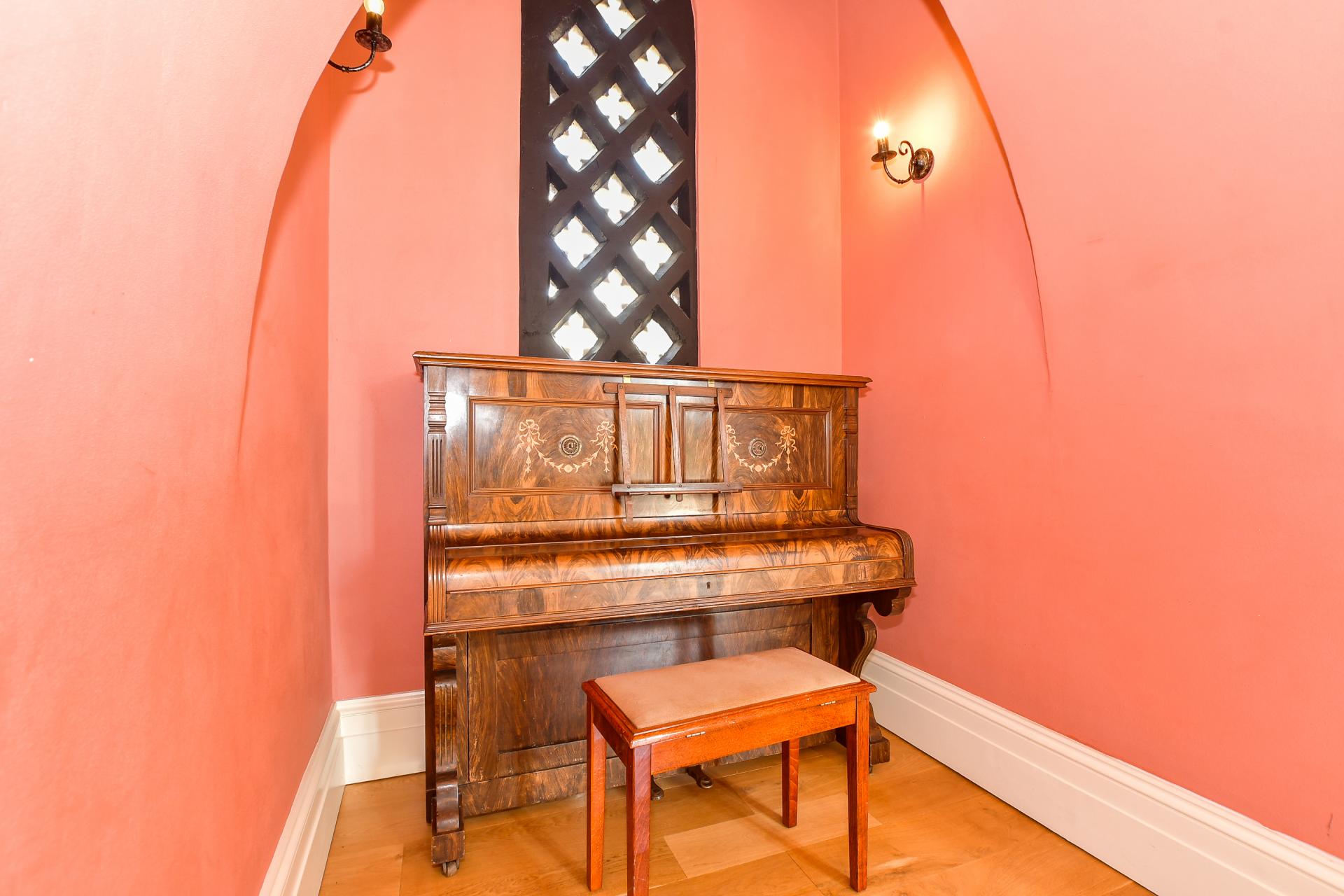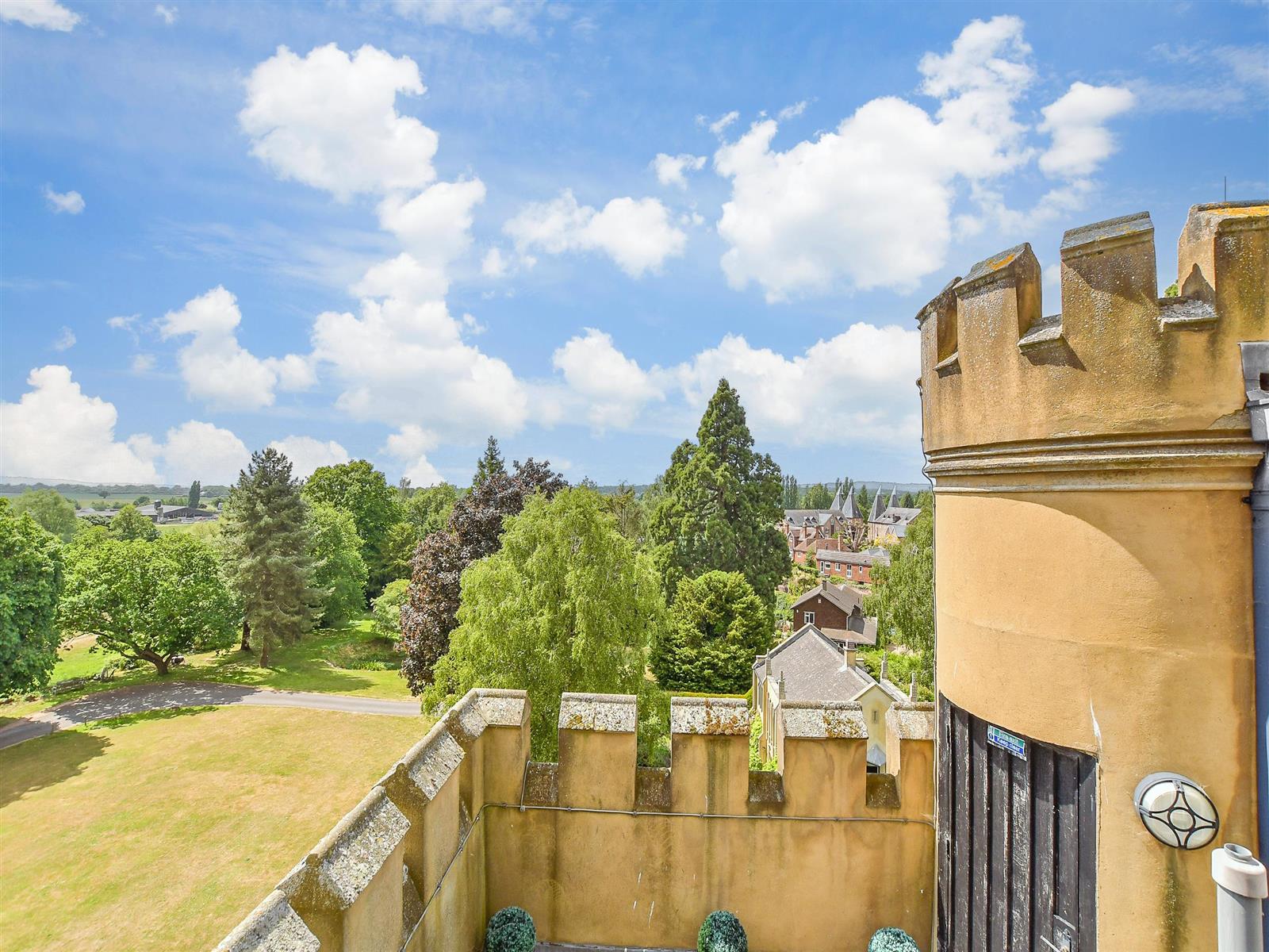 Now a fabulous private home it is accessed through the fantastic triple arched and castellated Romantic Gothic entrance on Hadlow village high street. There is a long and winding private road that passes a few individual properties and stunning countryside as far as the eye can see and ultimately leads to the spectacular tower, a parking area and the impressive walled courtyard. This includes additional buildings and a fabulous external window in what was thought to be the original castle entrance. The ancillary buildings have now been converted into six private dwellings and, together with the tower custodian, the owners of these six properties are responsible for the wonderful communal grounds that include sweeping lawns interspersed with impressive specimen trees and a beautiful lake encircled by a plethora of colourful shrubs.
