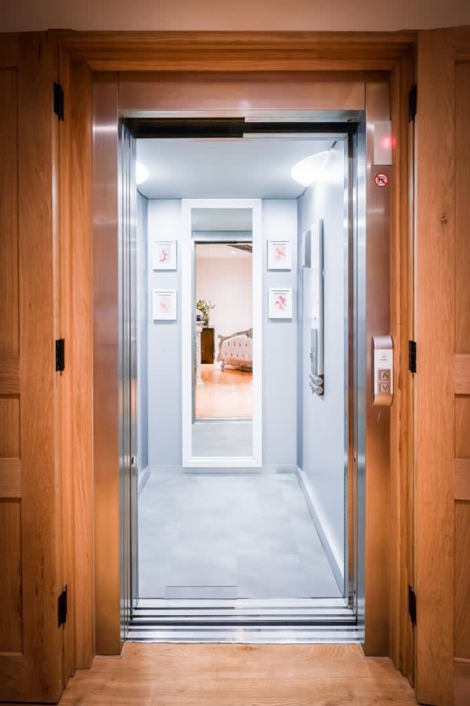 Opening the lift door on the first floor you are immediately confronted by a superb octagonal dining room where guests will be queueing up to be invited to a meal as this characterful room includes full height circle top arched windows providing far reaching views, a beautiful polished wood floor, a unique arched recess and sculptured oak doors that come from the original castle. These open into a small corridor with the main staircase and a second set of old oak doors that lead to the triple aspect kitchen/breakfast room with fantastic stained glass windows that were also rescued from the castle, access to the secondary staircase and shaker style units housing various appliances.