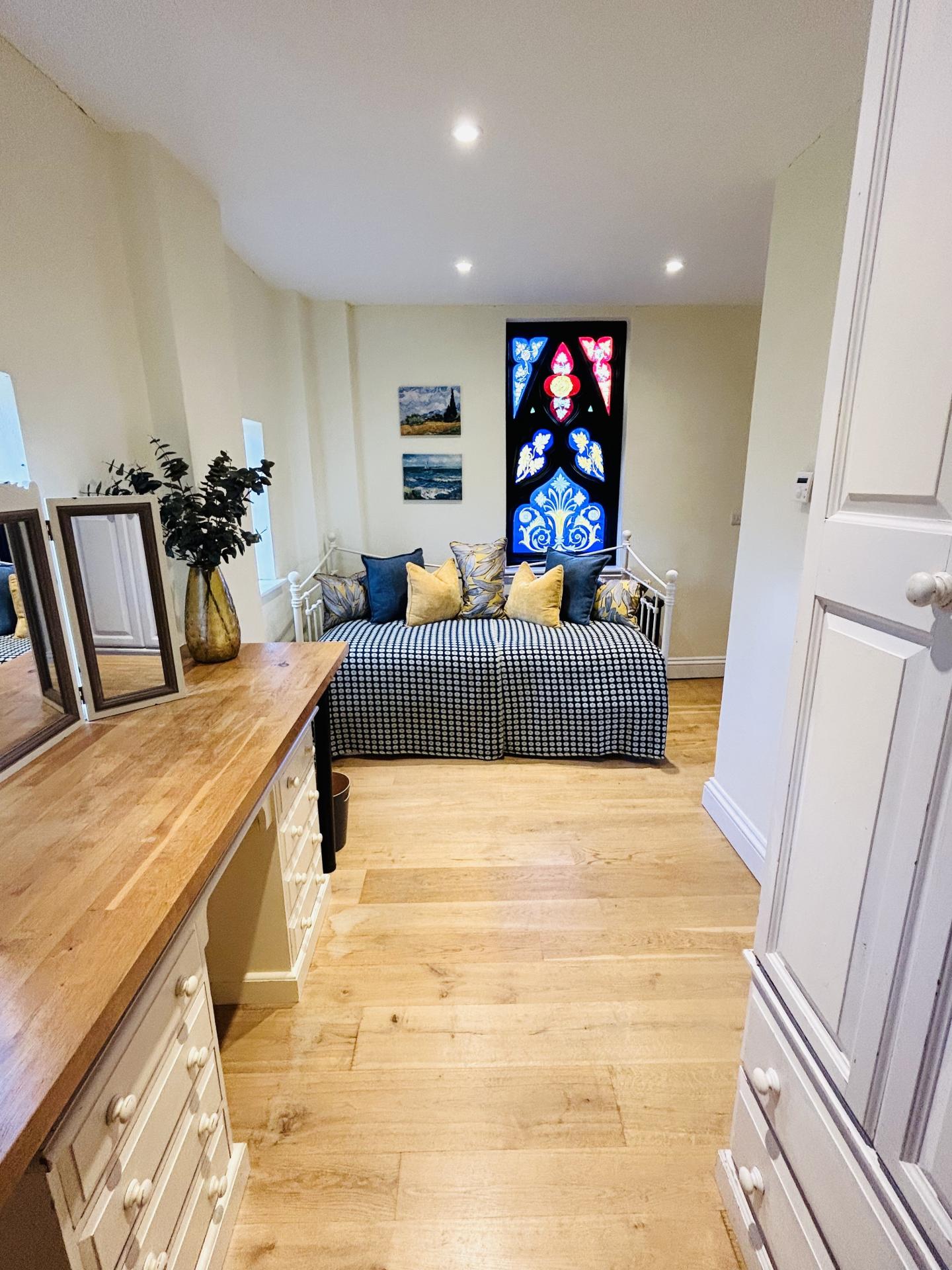 There are steps down to a double bedroom that also has a charming stained glass window from the castle, lovely views over the grounds, an ensuite bathroom and access to the secondary staircase.