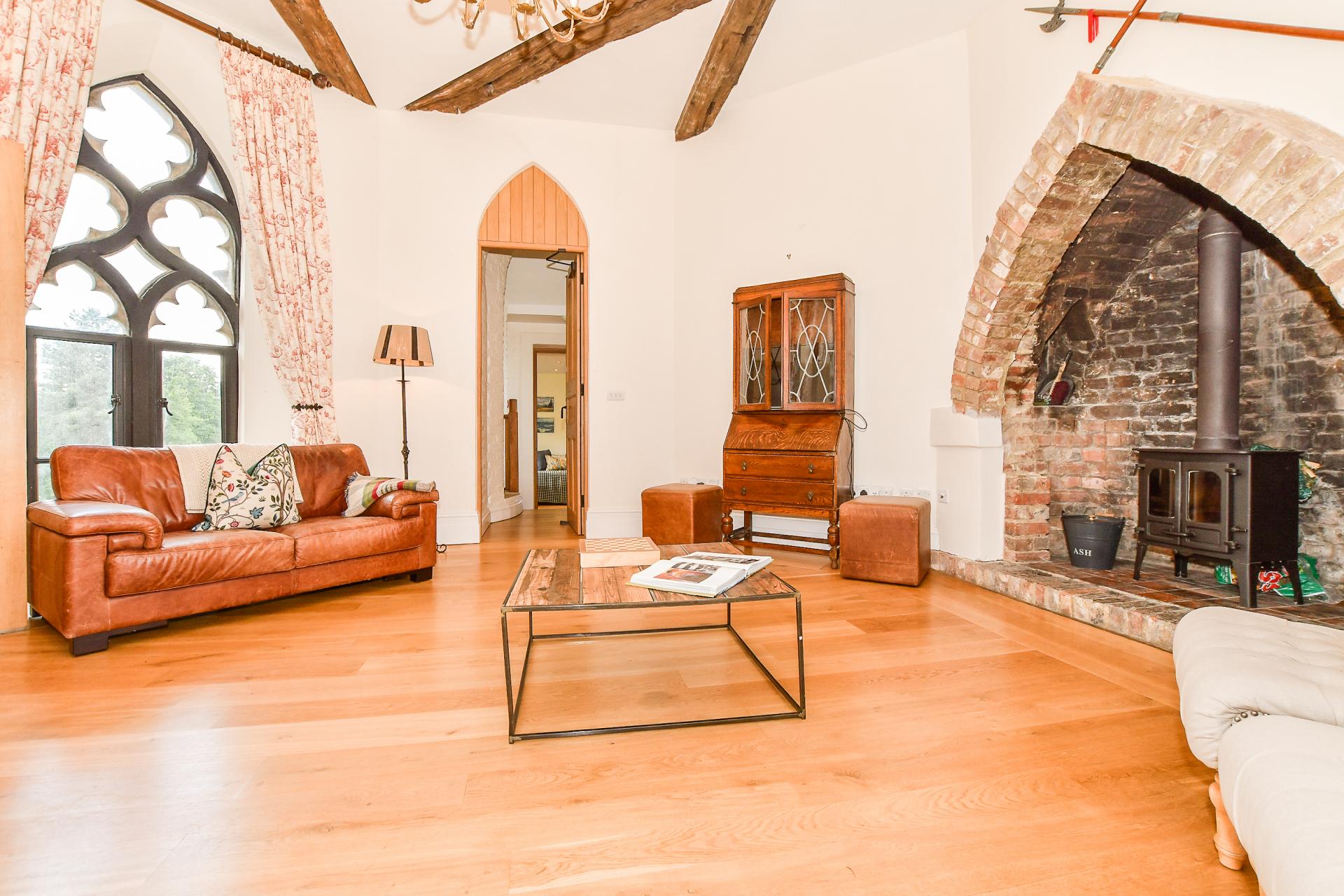 The octagonal drawing room on the next floor is something to behold with its gothic casement windows, polished wood flooring, exposed beams and amazing brick arched fireplace with a log burner but is also cosy enough for the family to enjoy relaxing and spending time together.
