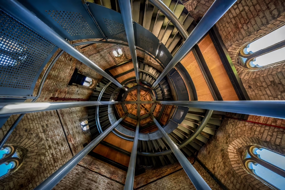 The next floor includes a useful study area and external access while open staircases lead to the additional floors. There are original six inch square vertical beams, interesting billboards showcasing the history of the tower and doors to the external castellated parapet with 360 degree views as far as the eye can see. At the very top of the tower is an exact replica of the original lantern that was destroyed during the Great Storm of 1987.