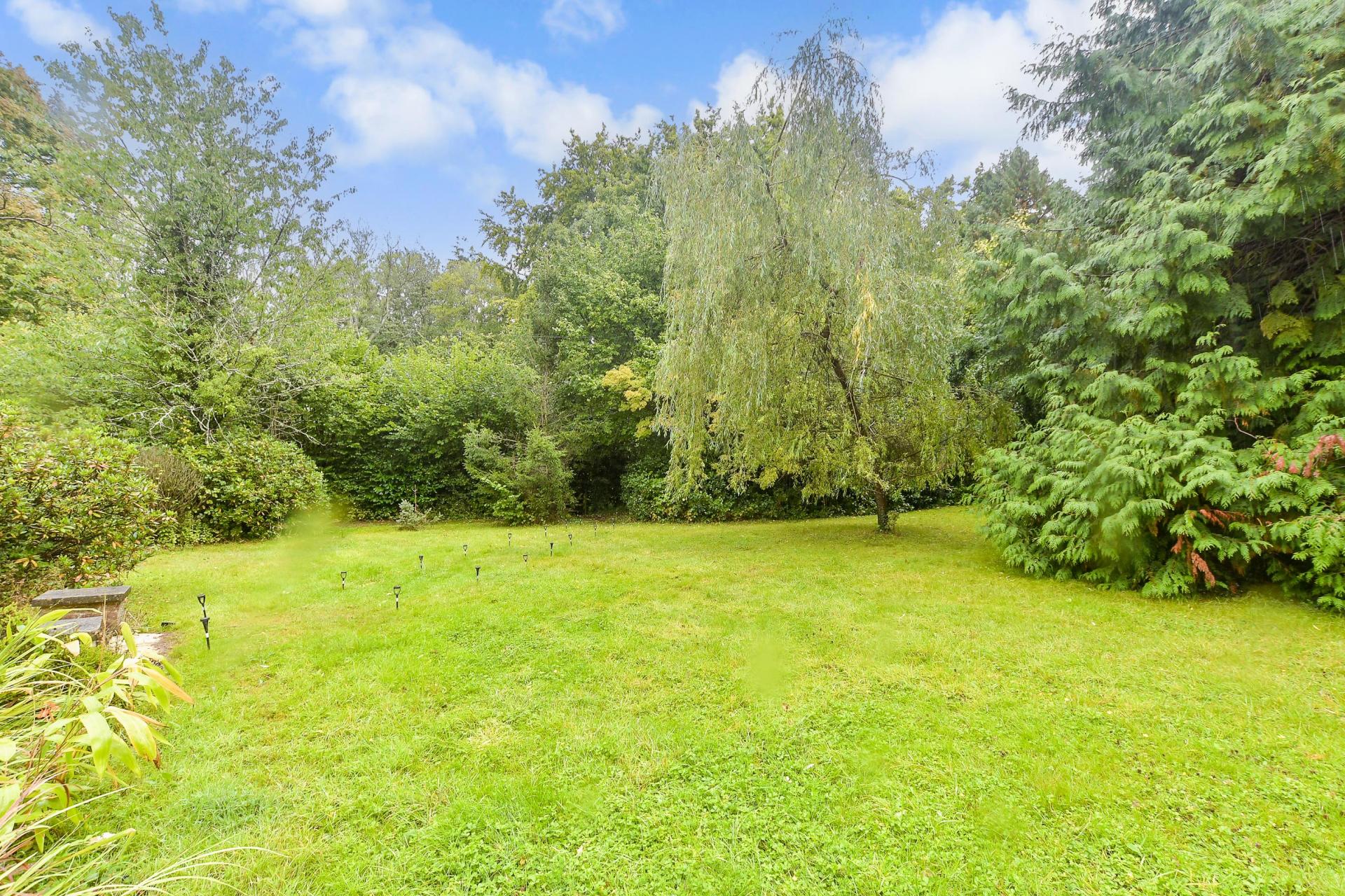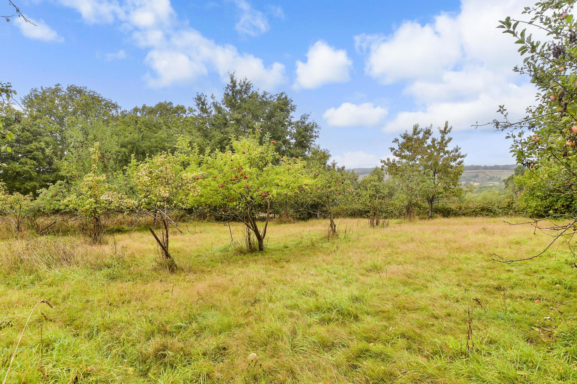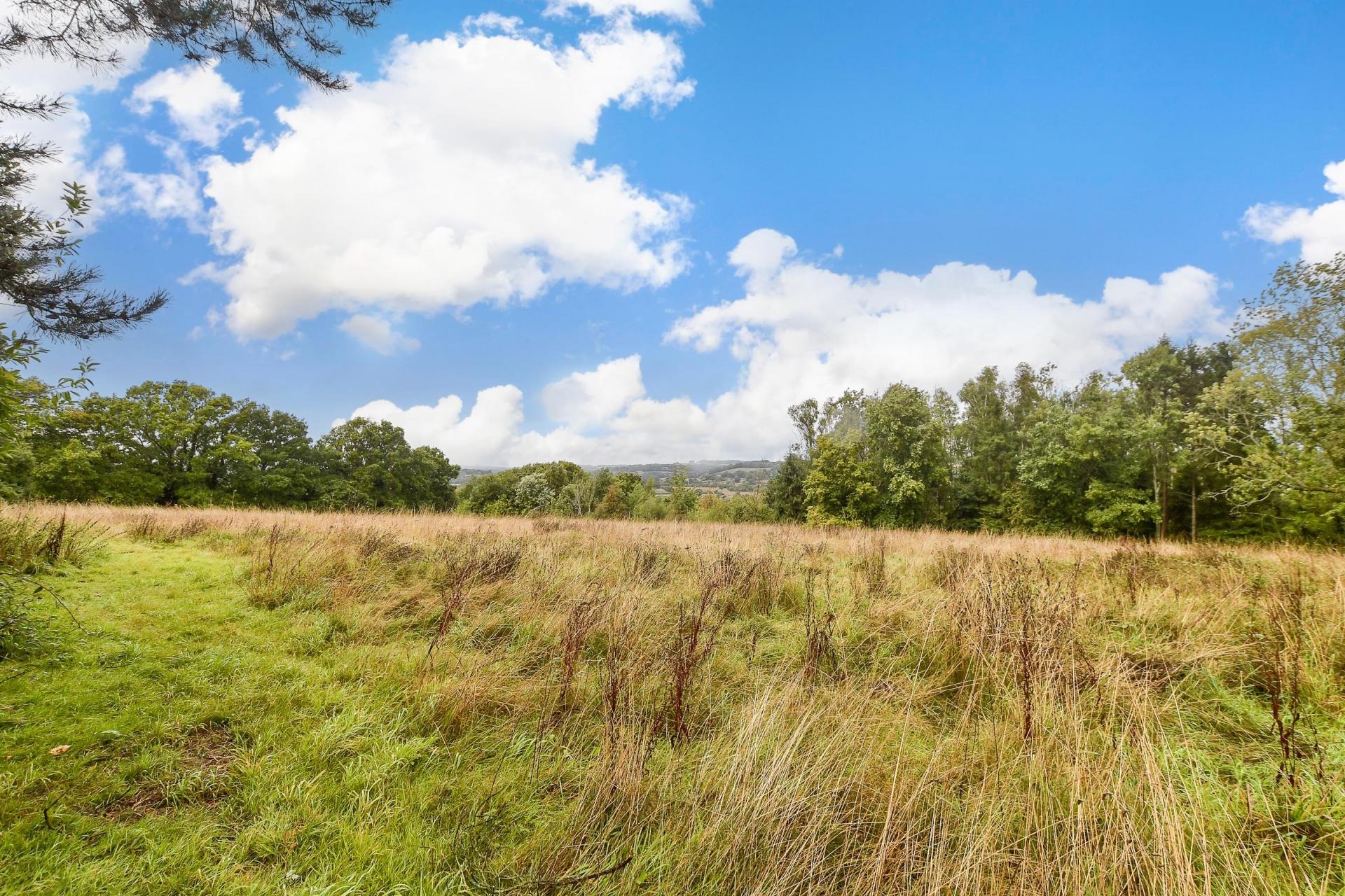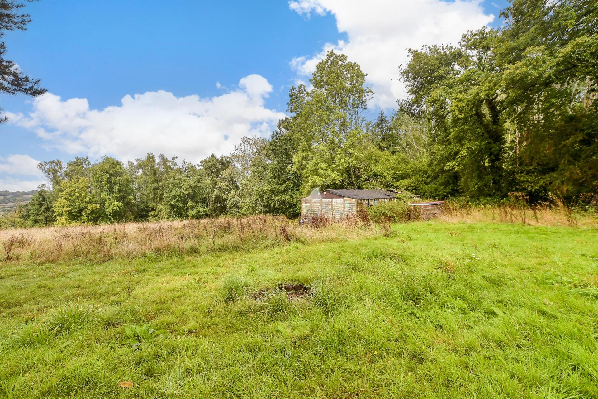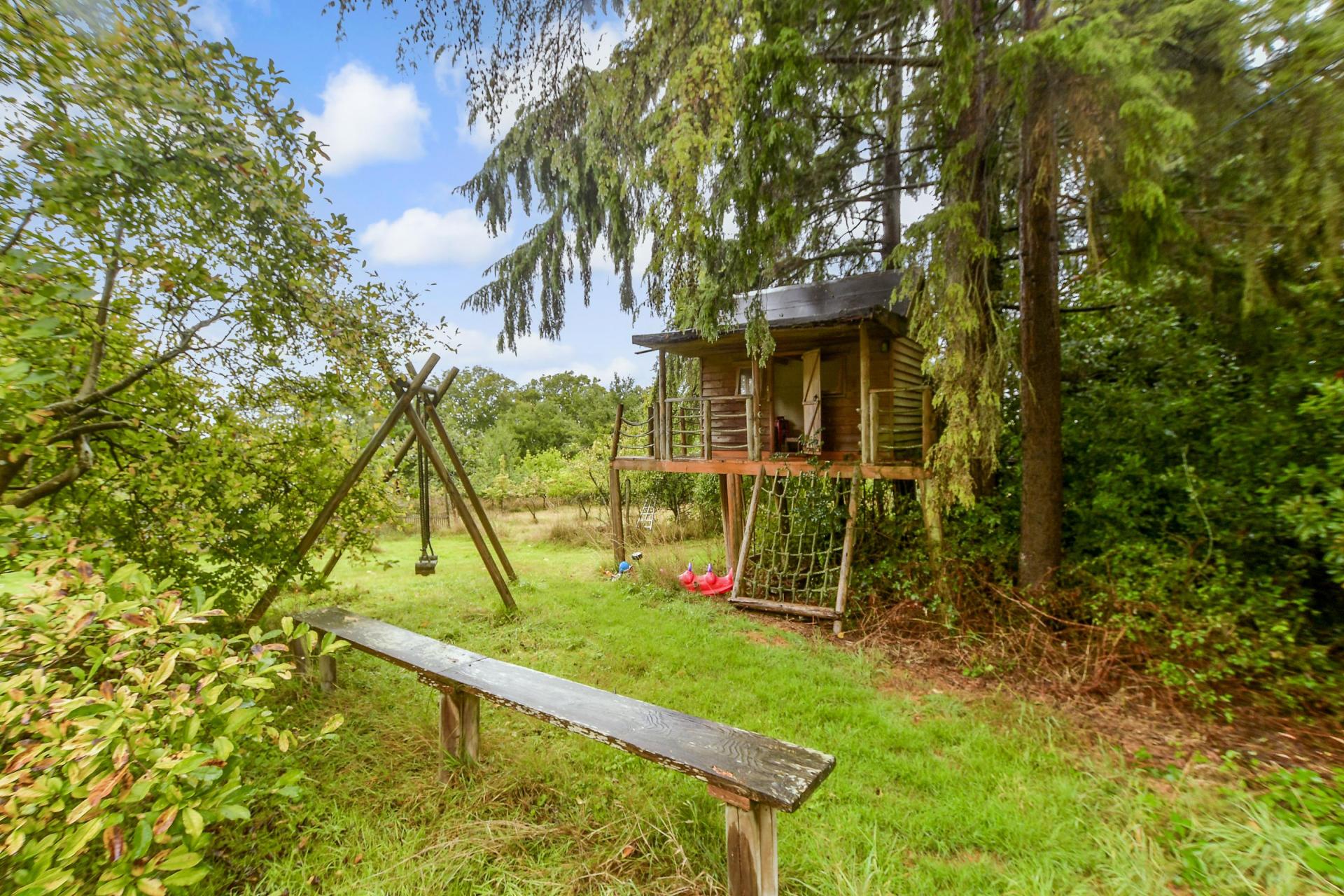A separate driveway leads to the two garages, one of which is also used as a games room. A high curved wall discreetly separates the forecourt from the swimming pool complex and is bordered by a terrace, providing an ideal space for lounging in the sunshine. Beyond the conservatory there is a large workshop/garden shed and steps down to another spacious terrace creating a charming area for outdoor entertaining. It leads to well-manicured level lawns and to the rest of the grounds that features an orchard with about 30 fruit trees, a vegetable garden and a greenhouse surrounded by six acres of woodland where children can play hide and seek, make camp or enjoy the charming tree house. For anyone with equestrian interests there is a wild meadow that could accommodate horses and it also includes a large barn that could be converted to stables or it would also make an excellent workshop/studio or office complex for anyone working from home who needs a quiet and peaceful working environment.