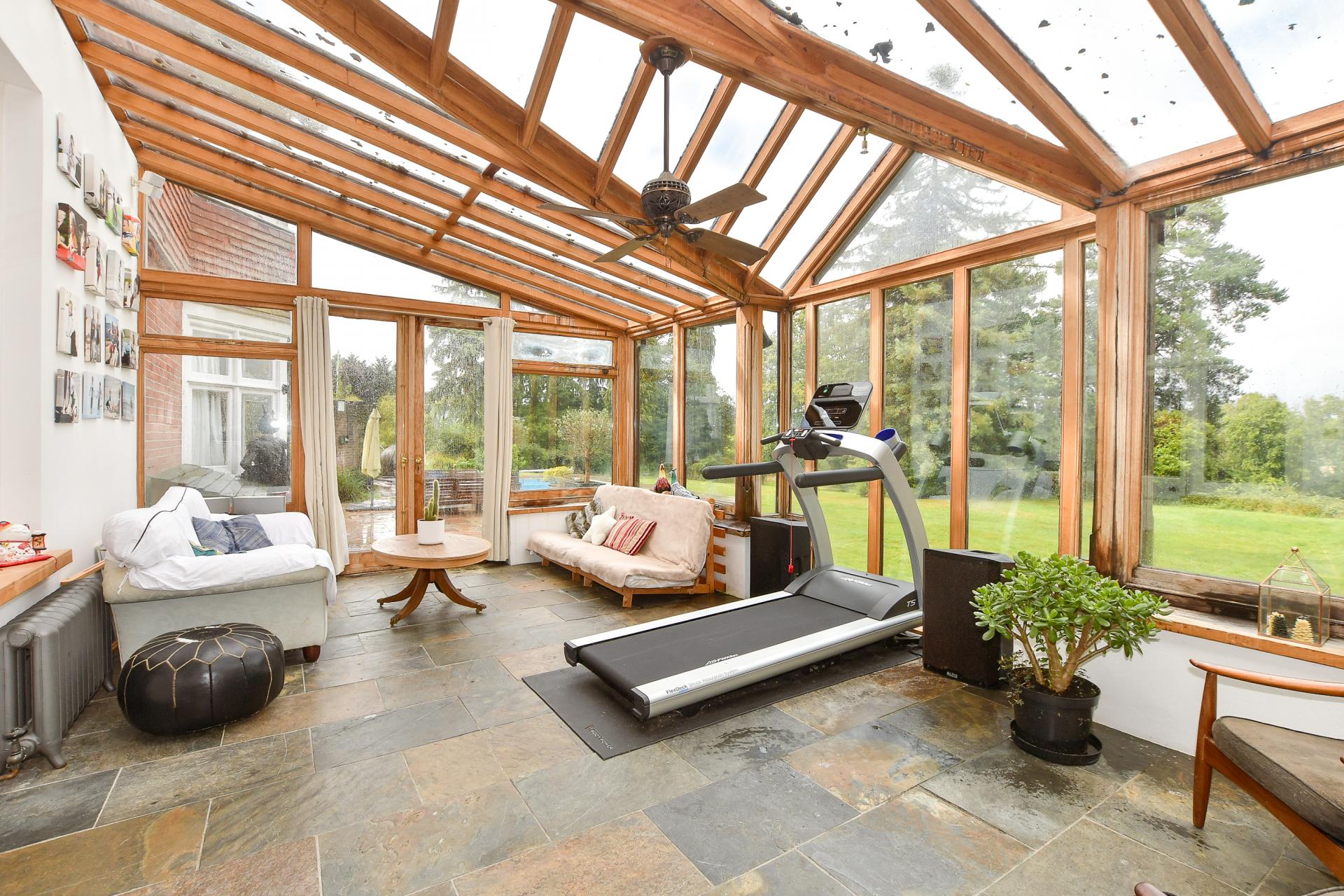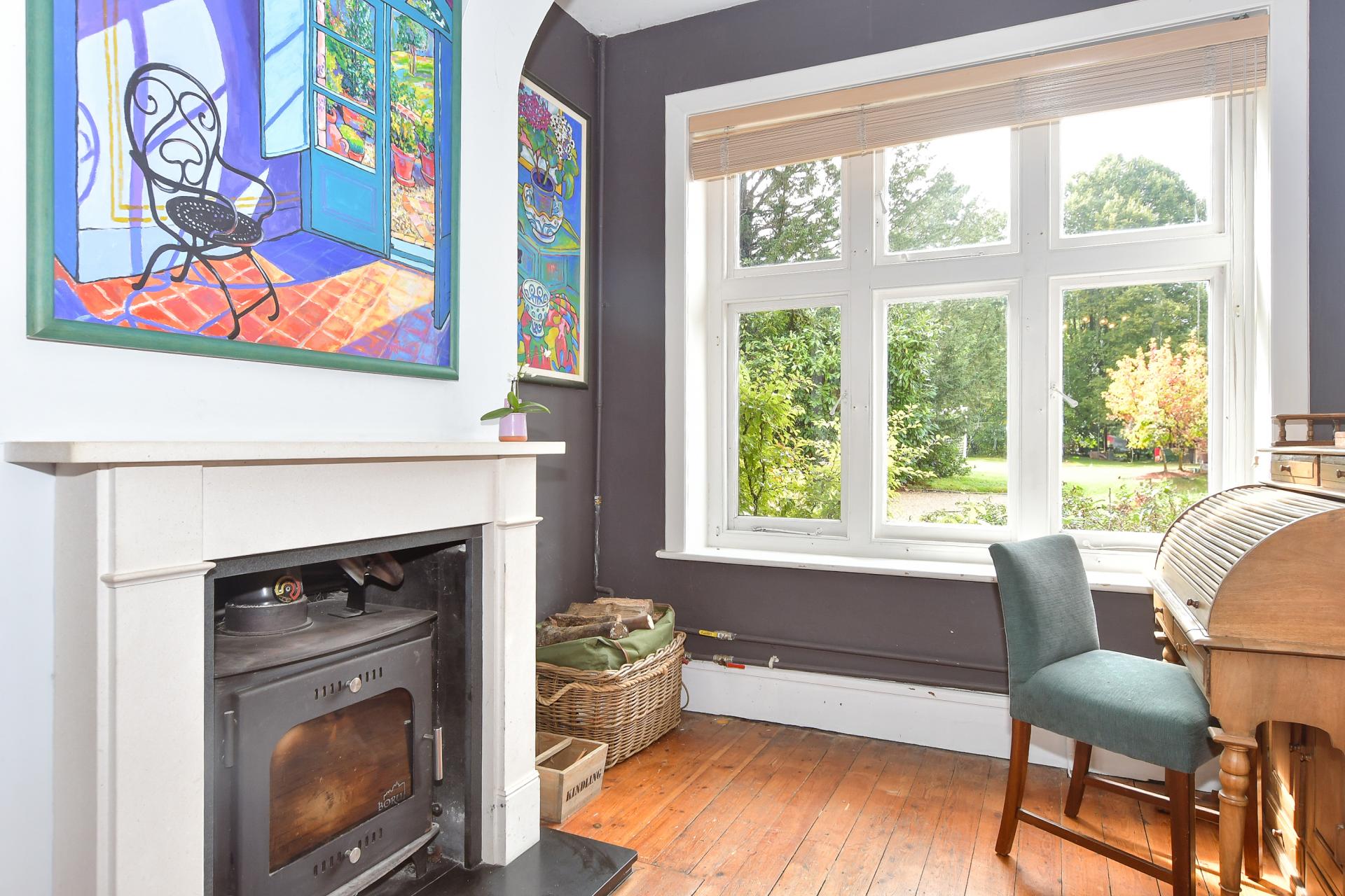 Although the property has been sensitively modernised to create a contemporary environment it still retains superb period features including wood flooring, the original oak staircase, coved ceilings, dado rails, panelled doors and original fireplaces in many of the rooms. No where is this better illustrated than in the almost 36ft lounge/dining room with its angled box bay window and stone fireplace with a second log burner and is ideal for entertaining. This elegant room has a glazed door to the large, wood framed conservatory that has slate tiled flooring, lovely views over the swimming pool and the garden and is big enough room to provide additional seating and dining areas. There is also a large reception room with a curved glass extension that is currently in use as a ‘snug’ and is ideal for the kids to have their own space.