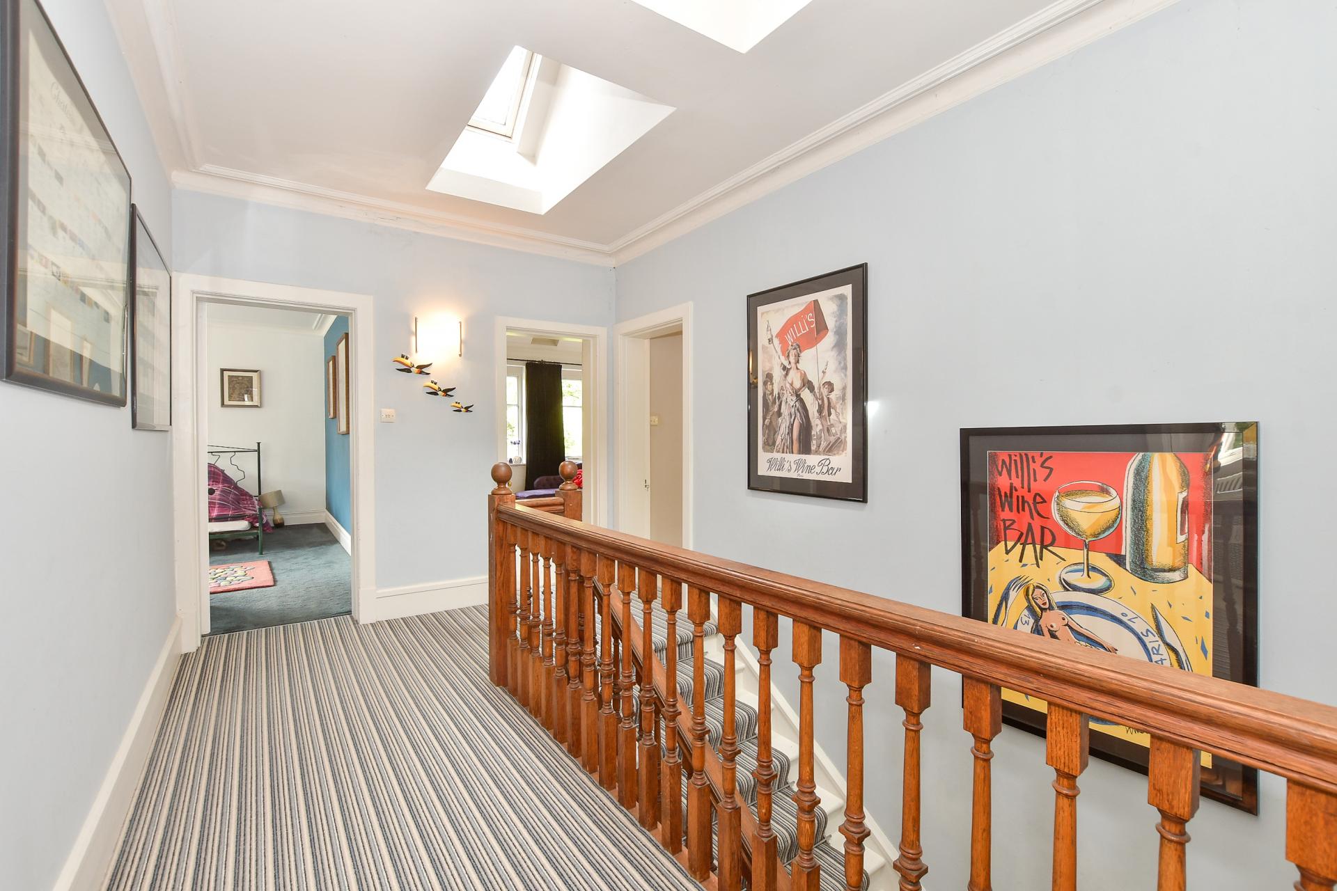 The other five double bedrooms are accessed via the main staircase that leads to a spacious galleried landing with skylights and an airing cupboard as well as to the modern family bathroom with a stand-alone oval bath, a walk-in shower and a vanity basin. Adjacent to the family bathroom is a large dual aspect double bedroom with far reaching views and direct access to another double bedroom with a wall of fitted cupboards and a basin so could become an excellent dressing room or a pair of bedrooms for kids. There is also a well-proportioned bedroom with an angled box bay window and a guest room with a spa inspired ensuite shower and underfloor heating as well as the principal suite. This calm and peaceful space includes glass fronted fitted cupboards, lovely views over the woodland and a trendy ensuite with a walk-in shower and a pair of contemporary vanity basins.