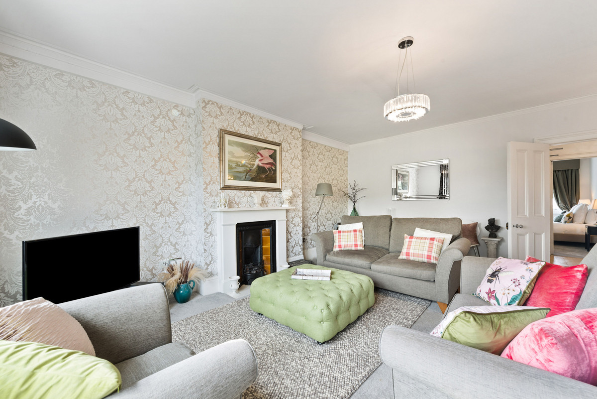 The Penthouse is a beautiful fully serviced two-bedroom apartment situated on the second floor, comprising a living room, designer kitchen, two double bedrooms and family bathroom, boasting high ceilings and original period features throughout. A bright and spacious living room is served by large sash windows, with a beautiful open fireplace creating a focal point. The sleek and stylish kitchen is finished to a high specification with built in appliances and a dining area, catering for family life or entertaining. Adjacent is a classic four-piece bathroom, including a magnificent deluxe walk-in rainfall shower. Both bedrooms are of grand proportions, with feature fireplaces and a master bedroom which benefits from bespoke fitted wardrobes. The apartment is currently offered as a two bed, with the option of a third bedroom adding further accommodation via an accessible door.