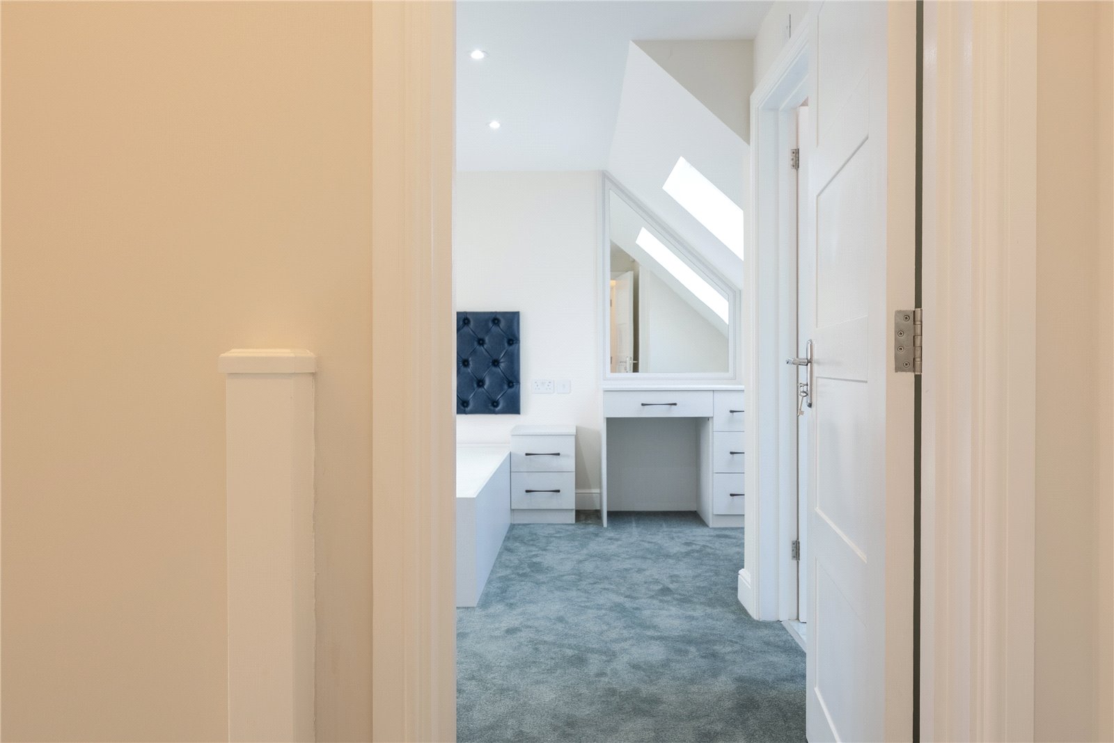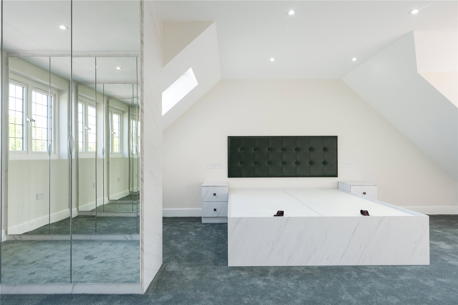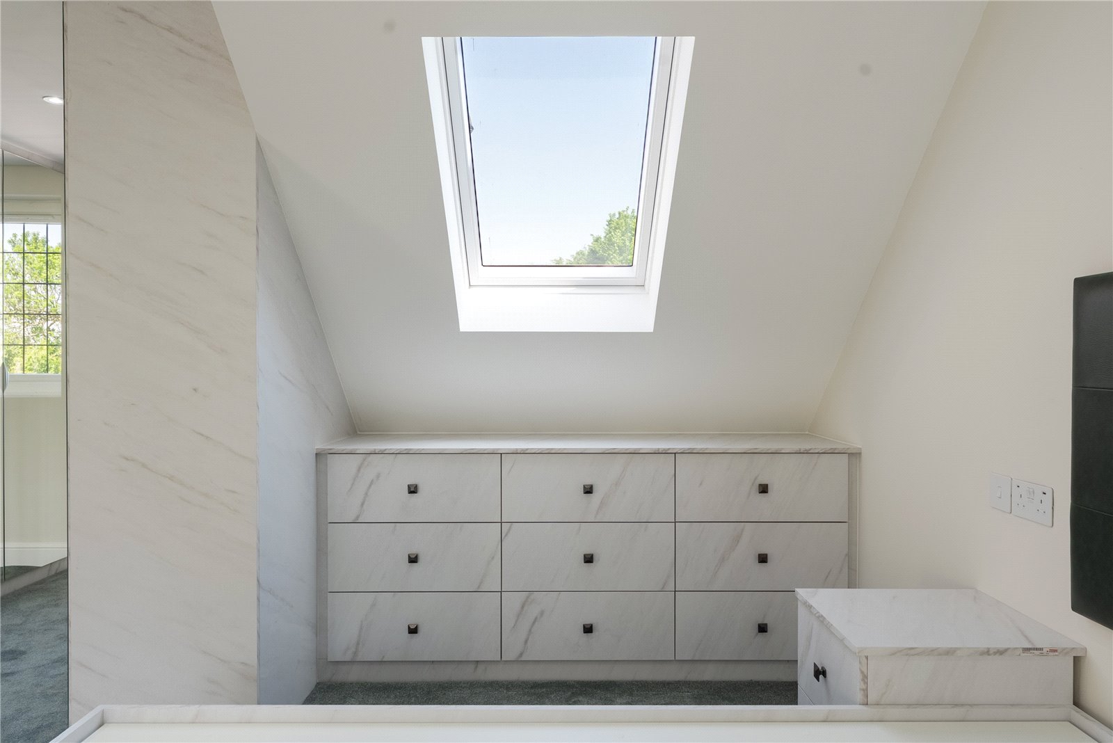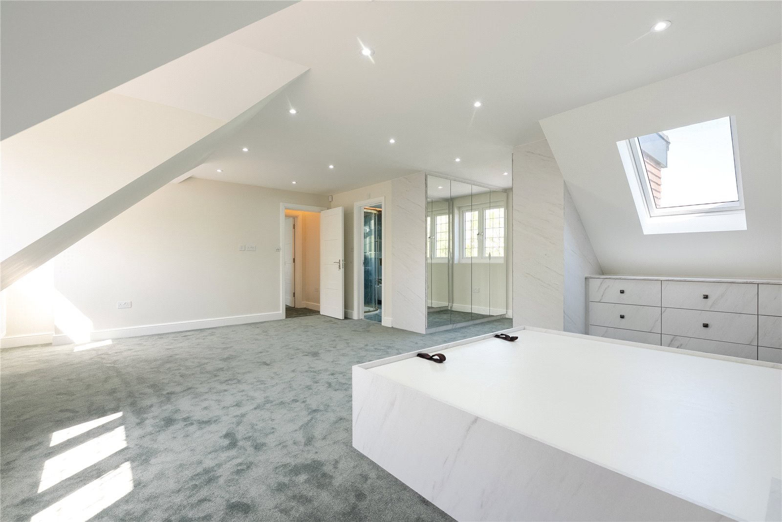 The property unfolds over a generous footprint, comprising five substantial double bedrooms, each appointed with bespoke fitted wardrobes and their own beautifully finished en-suite bathroom. Light-filled and serenely styled, these restful retreats offer space, privacy, and understated sophistication.
