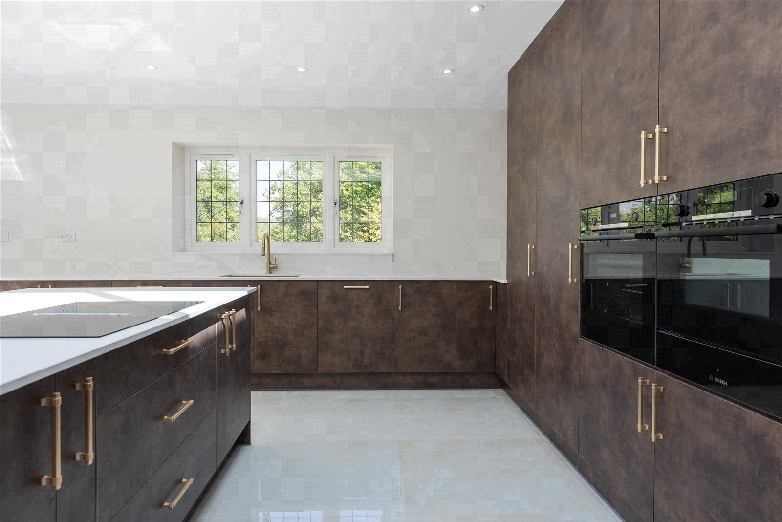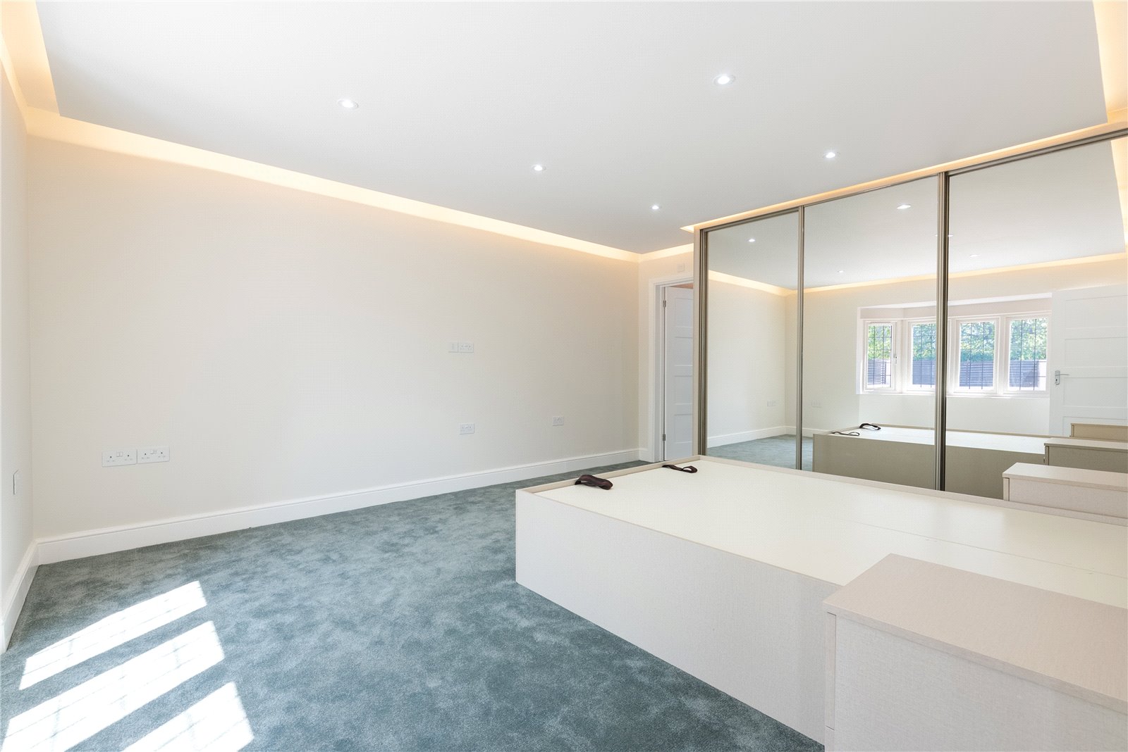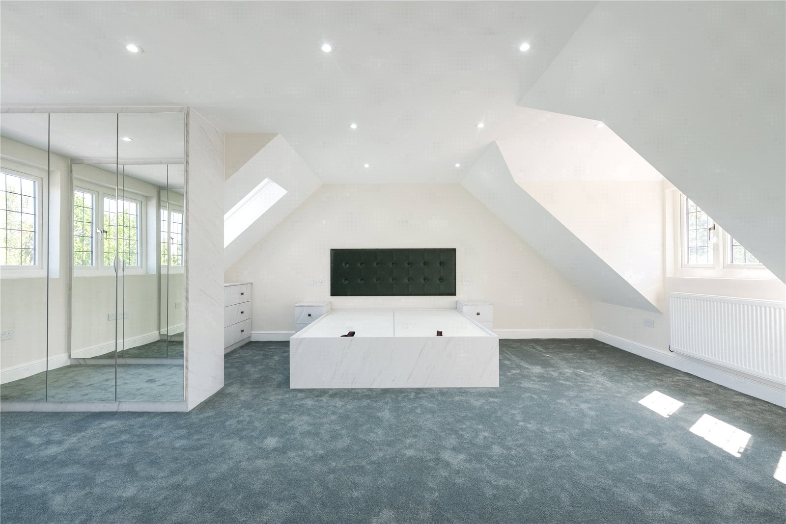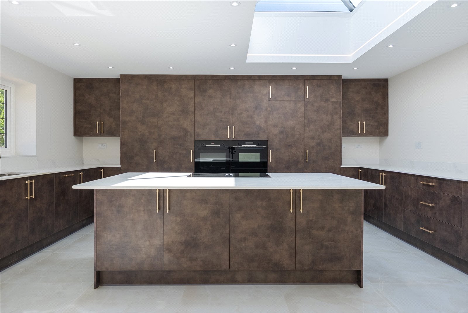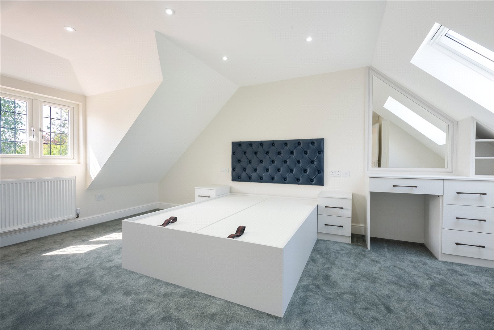 The property unfolds over a generous footprint, comprising five substantial double bedrooms, each appointed with bespoke fitted wardrobes and their own beautifully finished en-suite bathroom. Light-filled and serenely styled, these restful retreats offer space, privacy, and understated sophistication.
