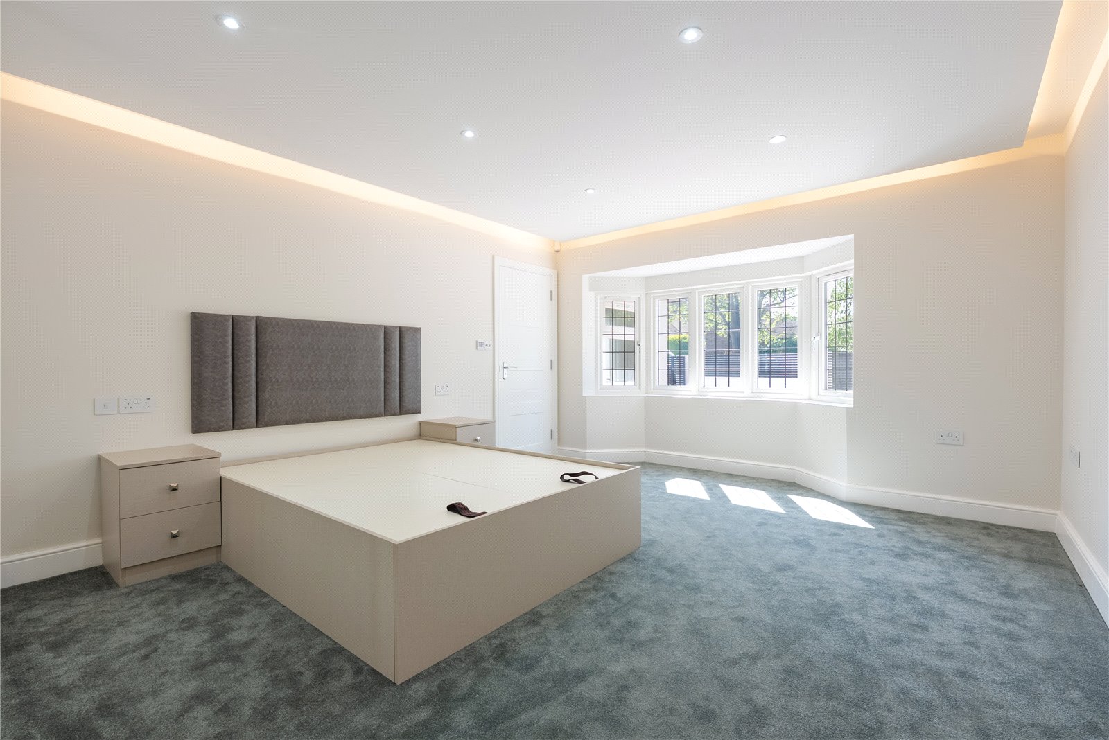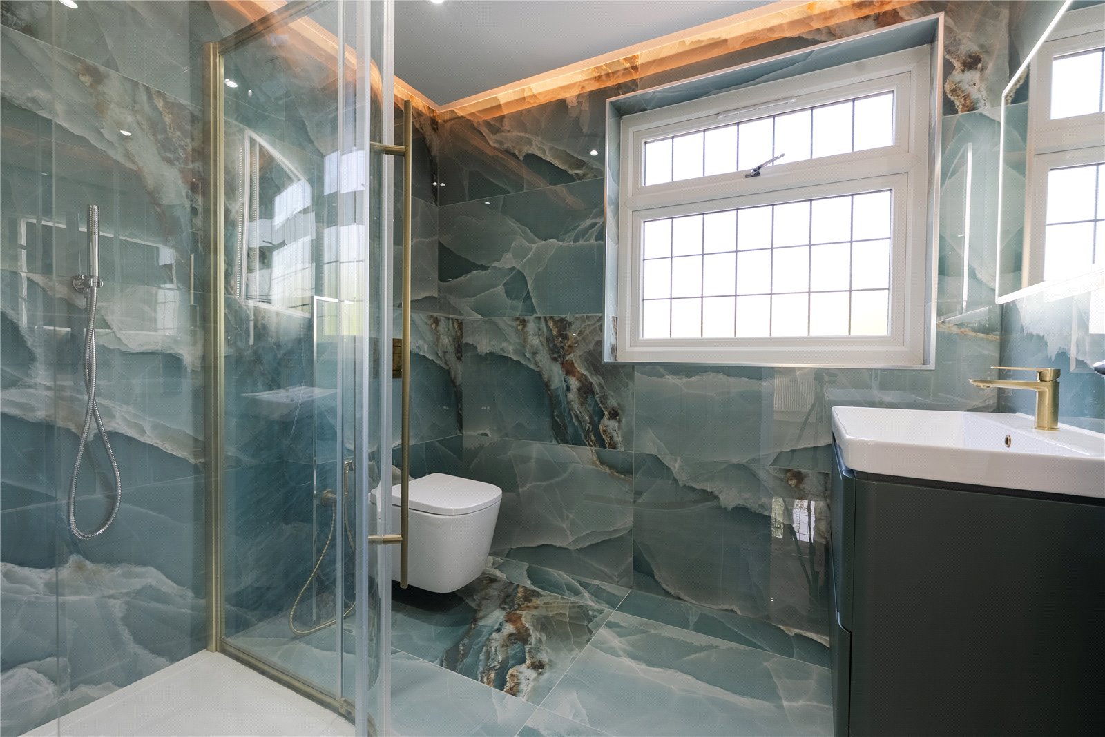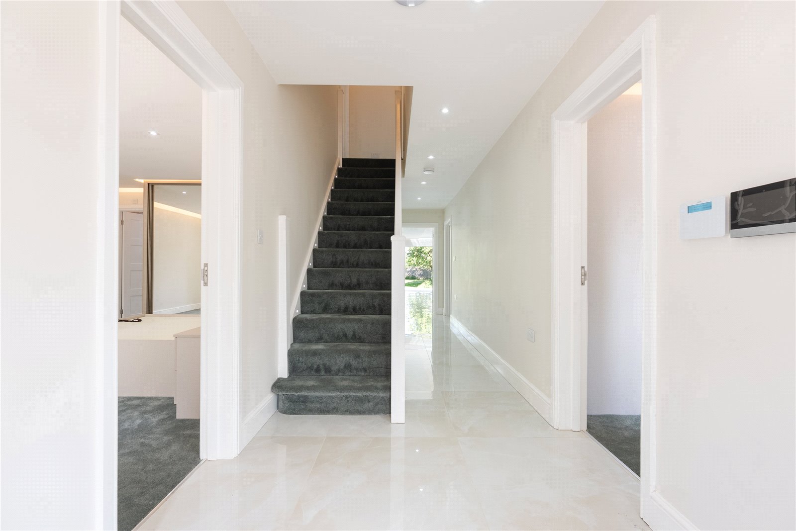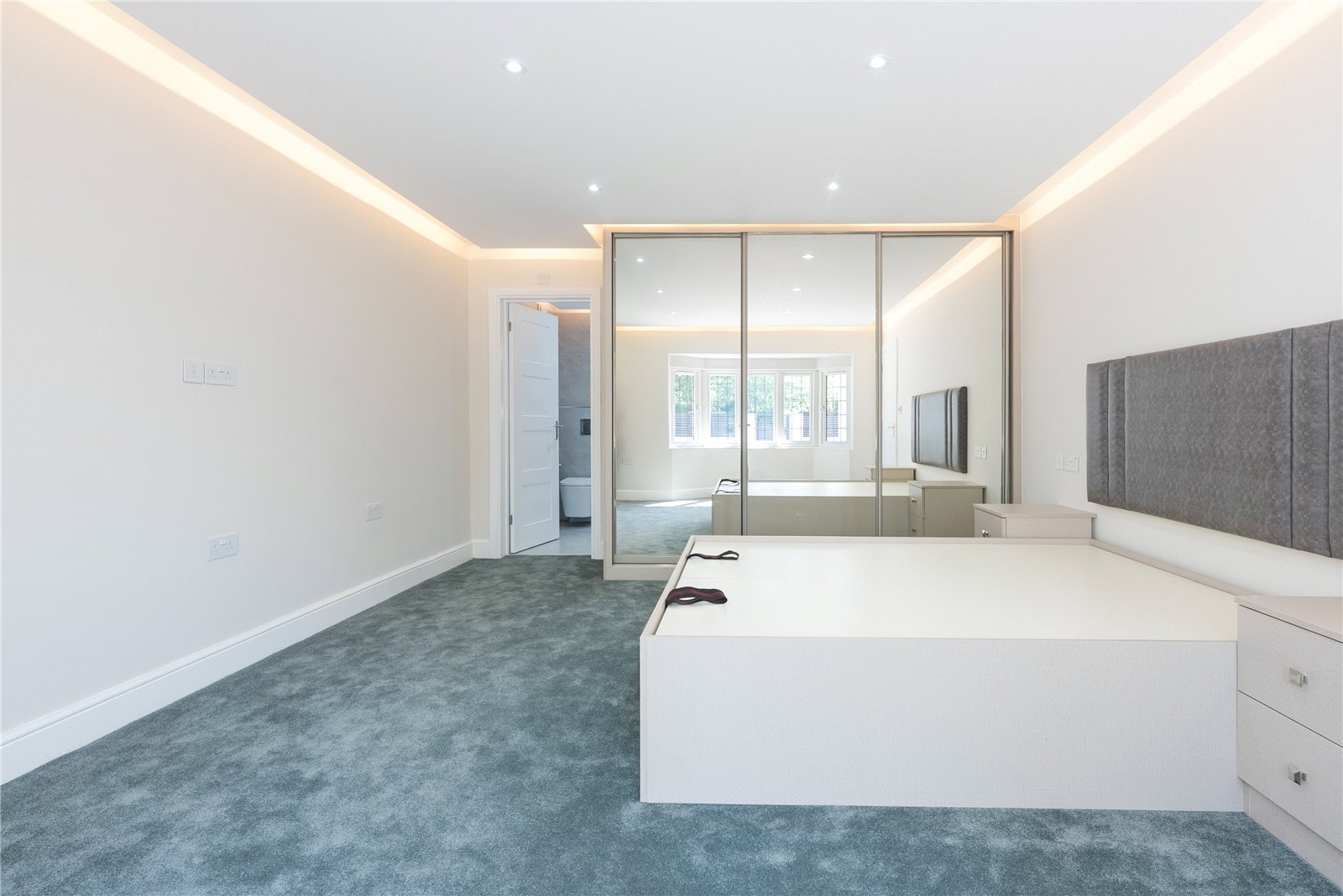 The property unfolds over a generous footprint, comprising five substantial double bedrooms, each appointed with bespoke fitted wardrobes and their own beautifully finished en-suite bathroom. Light-filled and serenely styled, these restful retreats offer space, privacy, and understated sophistication.