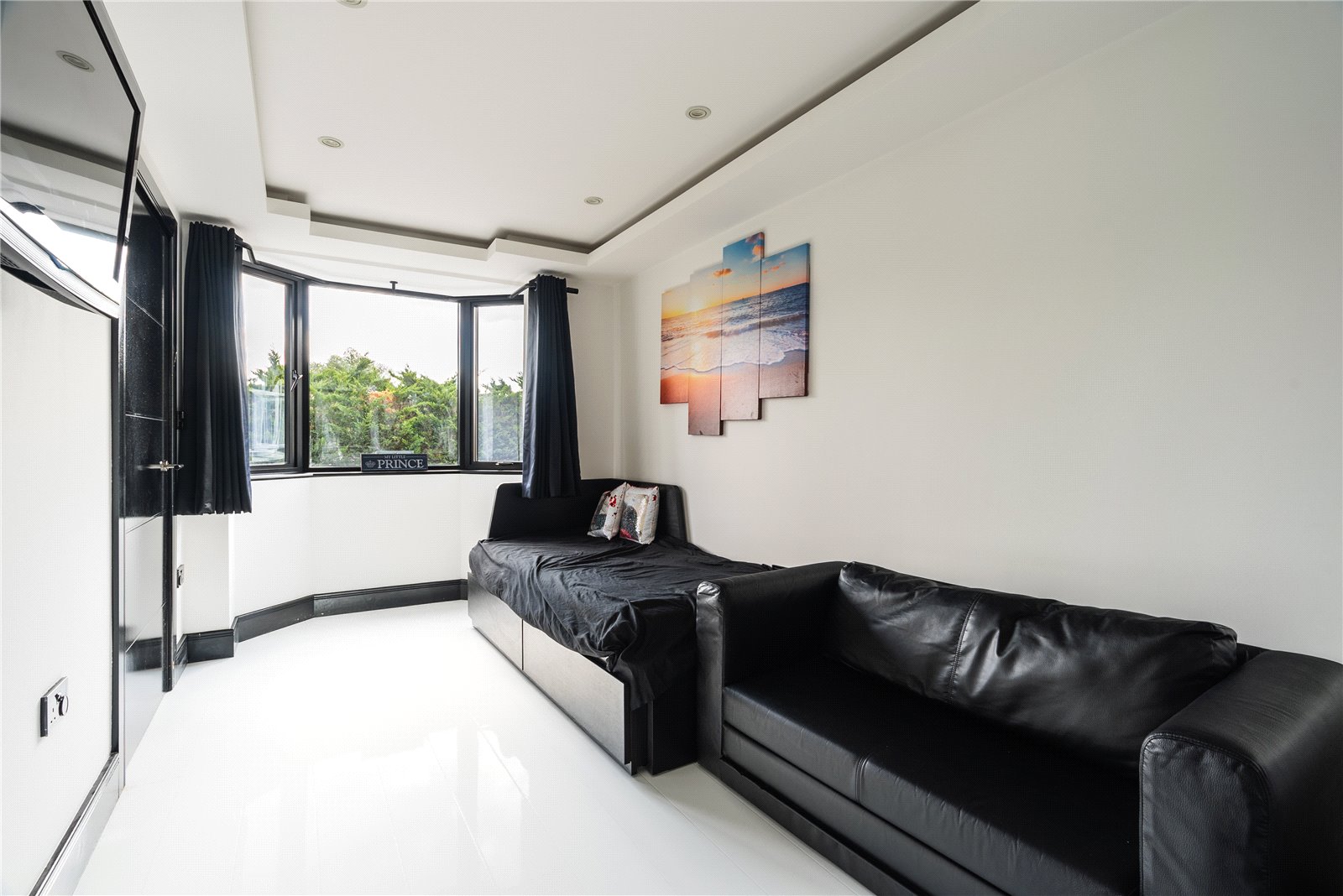 The ground floor is a testament to modern family living, featuring a state-of-the-art kitchen complete with a central island and dining area that overlooks the 100-foot garden. This space is perfect for entertaining, with sleek, contemporary finishes and bi-fold doors that open onto the garden, offering the ideal setting for al fresco dining or simply enjoying the tranquil surroundings. The ground floor also boasts three inviting lounges, one of which is designed as a versatile space that can serve as a seventh bedroom, complete with a private en-suite and a cozy room perfect for a home office or walk-in closet.