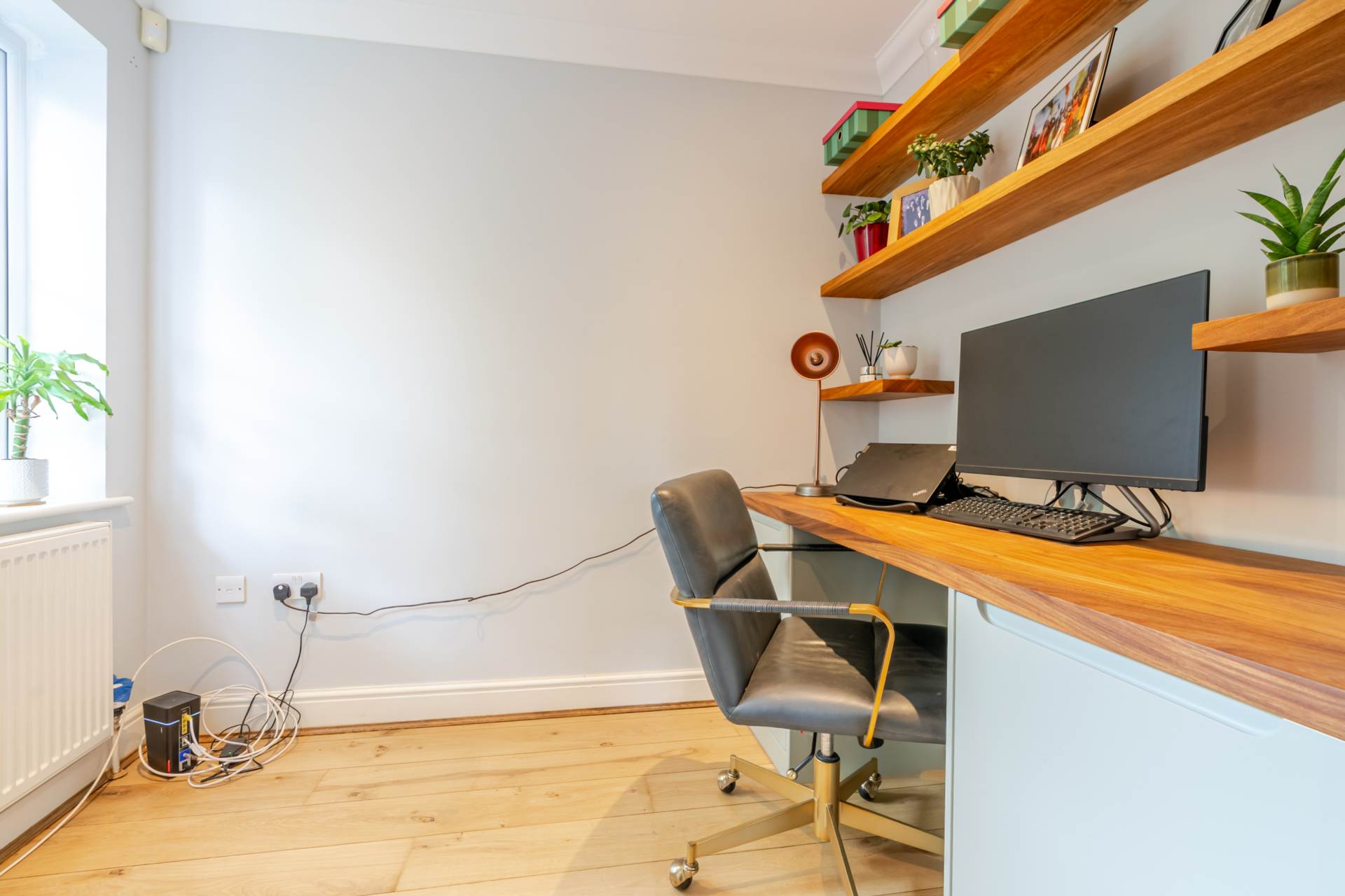 For those who work remotely or require a quiet area to focus, the property includes a well-proportioned study, thoughtfully designed to function as an efficient home office. A convenient cloakroom on the ground floor adds to the practical layout of the home.