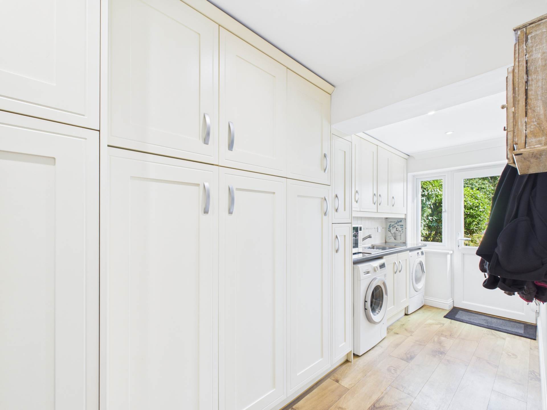 The modern luxury kitchen is a standout feature, flooded with natural light and thoughtfully designed with stylish cabinetry, premium worktops, and ample space for dining. A separate laundry room includes built-in storage, a washer/dryer, and direct access to the rear garden.