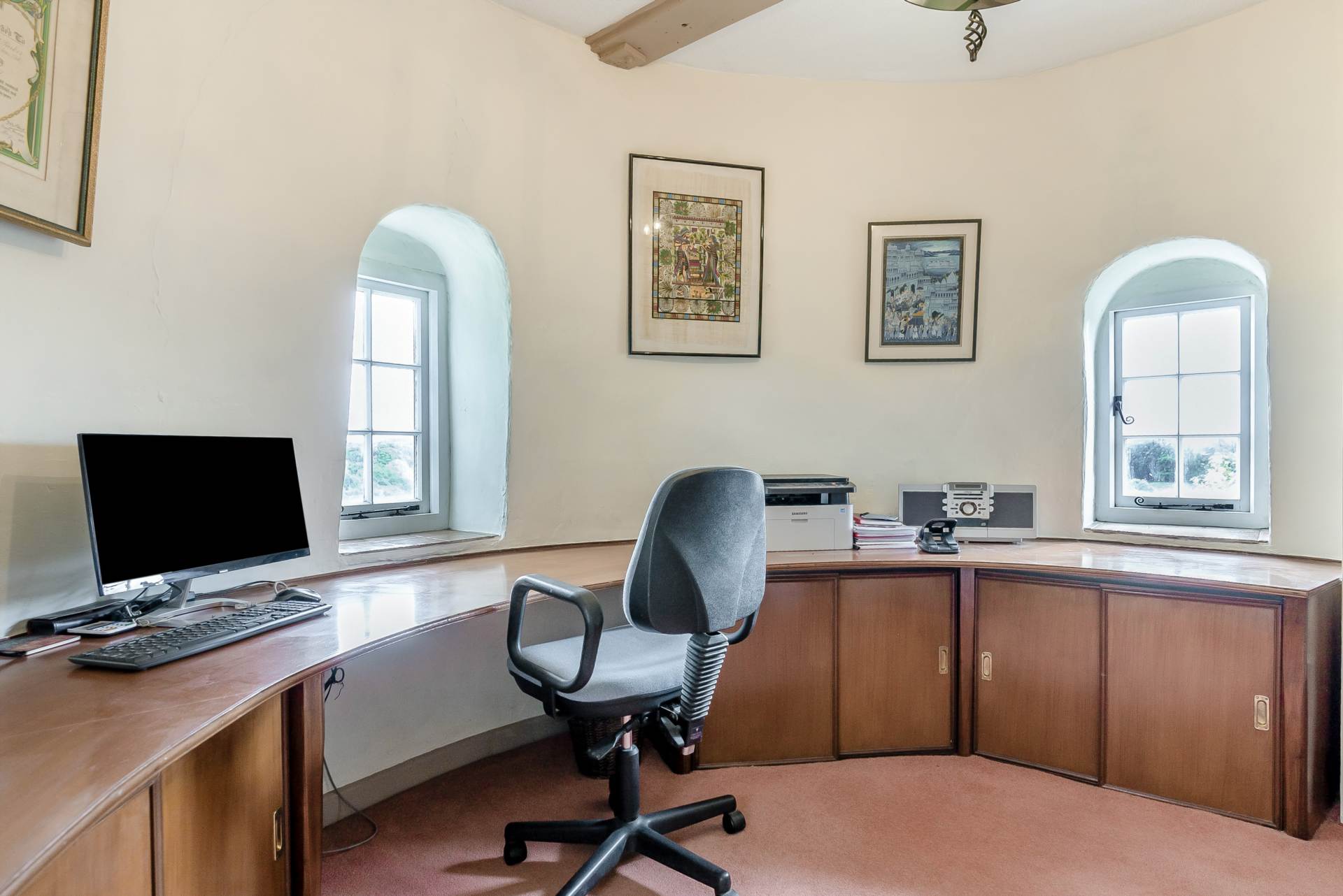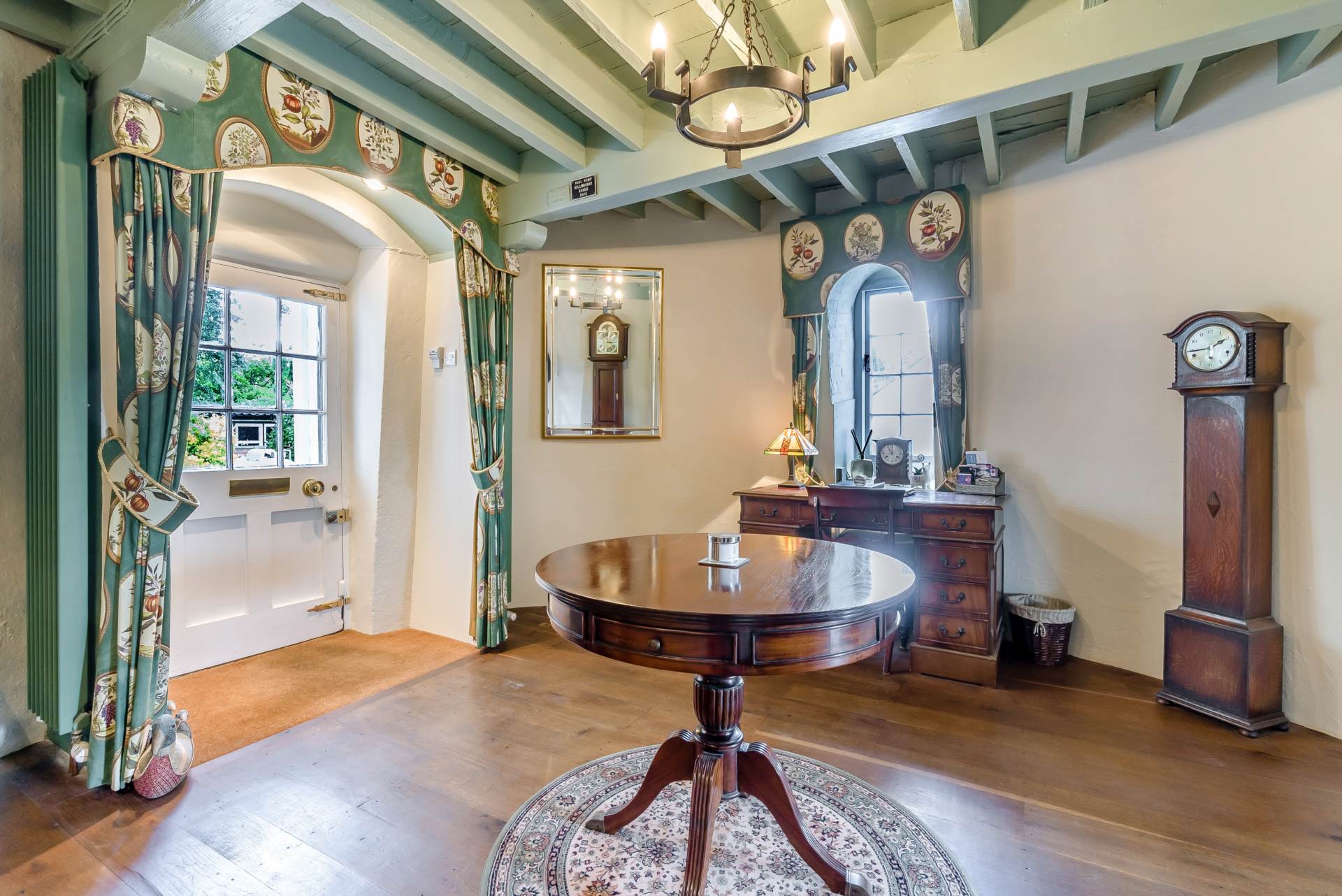 The home`s entrance opens into the circular reception hall at the base of the tower, leading into the inner hall of the adjoining cottage. Two elegant and light-filled reception rooms sit on either side, with the sitting room featuring a cosy wood-burning stove.