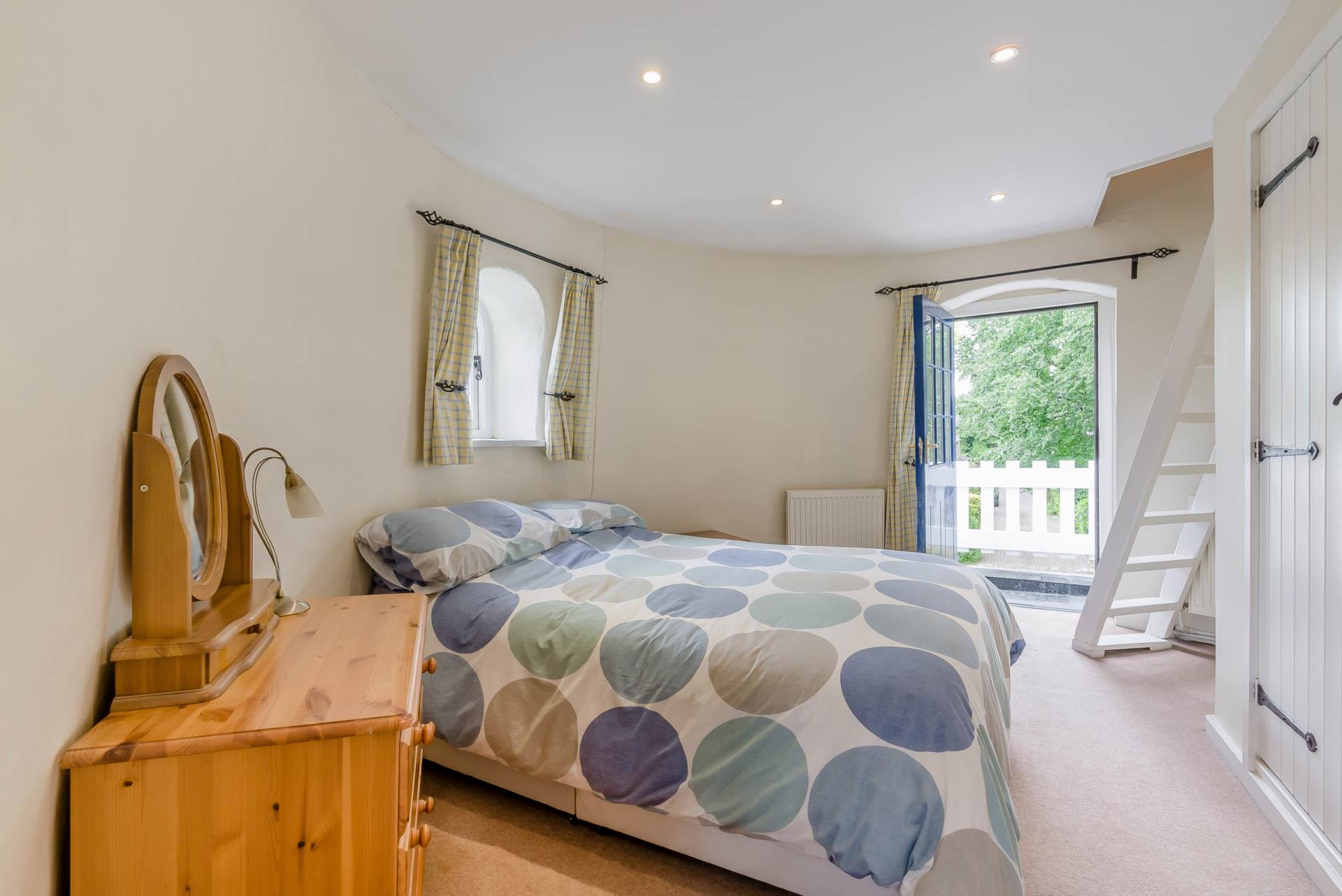 Upstairs, three generously sized bedrooms and two bathrooms (one en suite) provide comfortable accommodation. A stunning circular fourth bedroom with en suite shower is ideal for guests, while a further staircase leads to a fifth bedroom perfect as a home office, with spectacular countryside views. From here, a ladder gives access to the cap and the original mill workings.