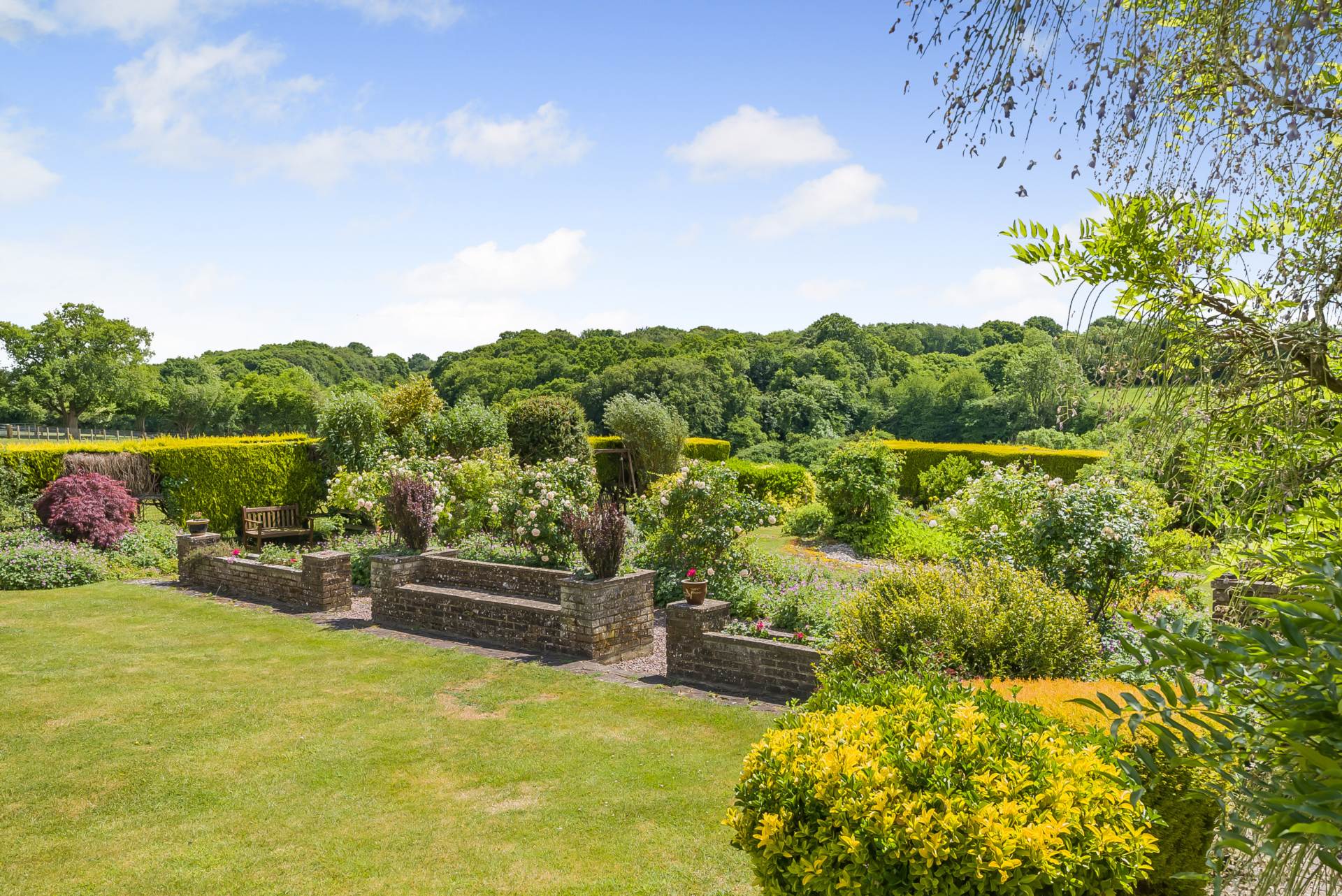 The beautifully maintained country garden is a peaceful haven, with lovely views over open fields. Well-stocked flower beds, neat lawns, and a tranquil seating area offer a perfect escape. Additional features include two summerhouses, a shed, and a workshop.