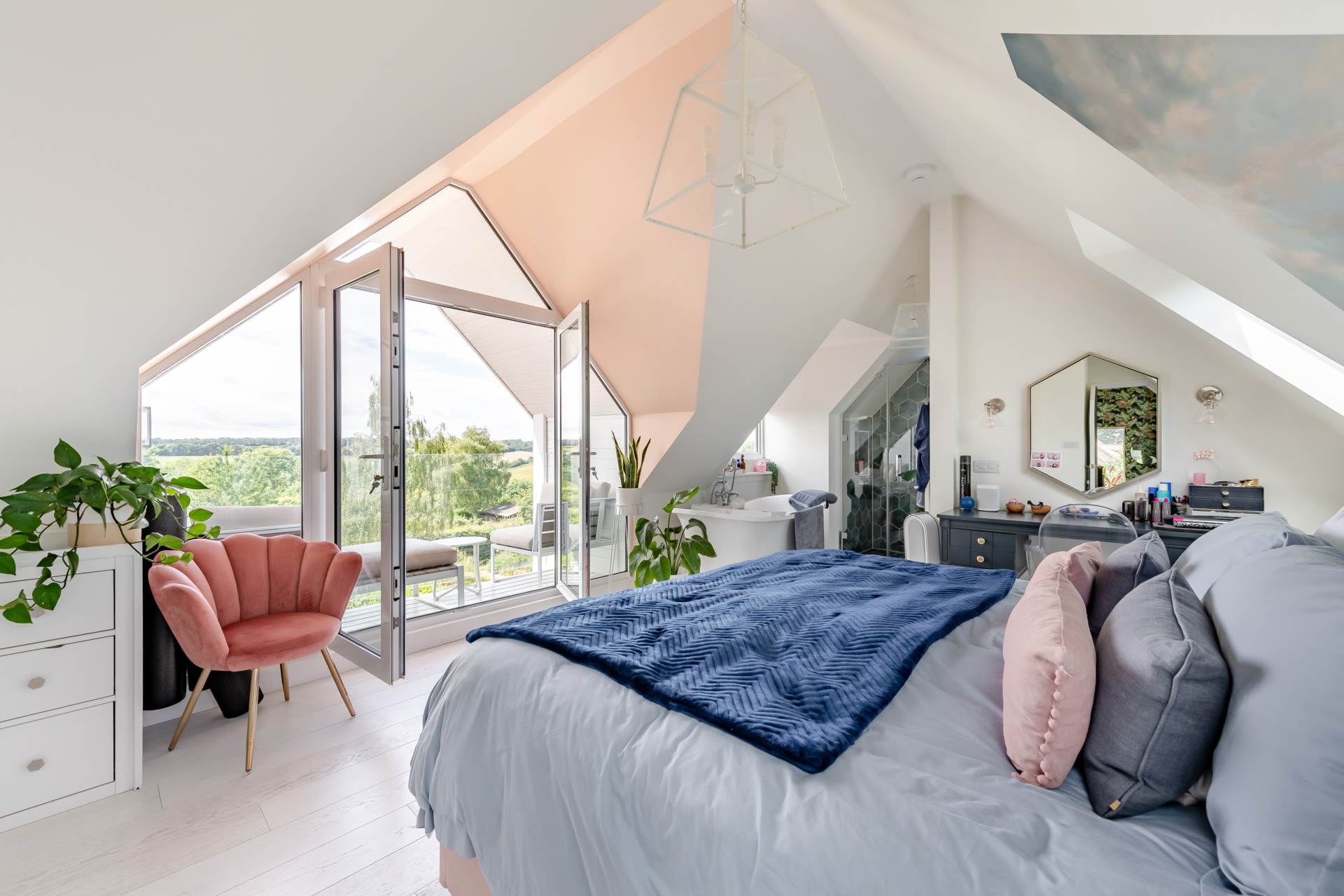 Upstairs, on the first floor there are three double bedrooms, a family bathroom and a study/single bedroom. On the top floor, and of particular note is the master bedroom suite which has been extended into the eaves. This contemporary and architect designed extension has glass floor to ceiling triangulated doors leading onto a private balcony, from where it commands the most stunning far reaching views over the Buckinghamshire Countryside.