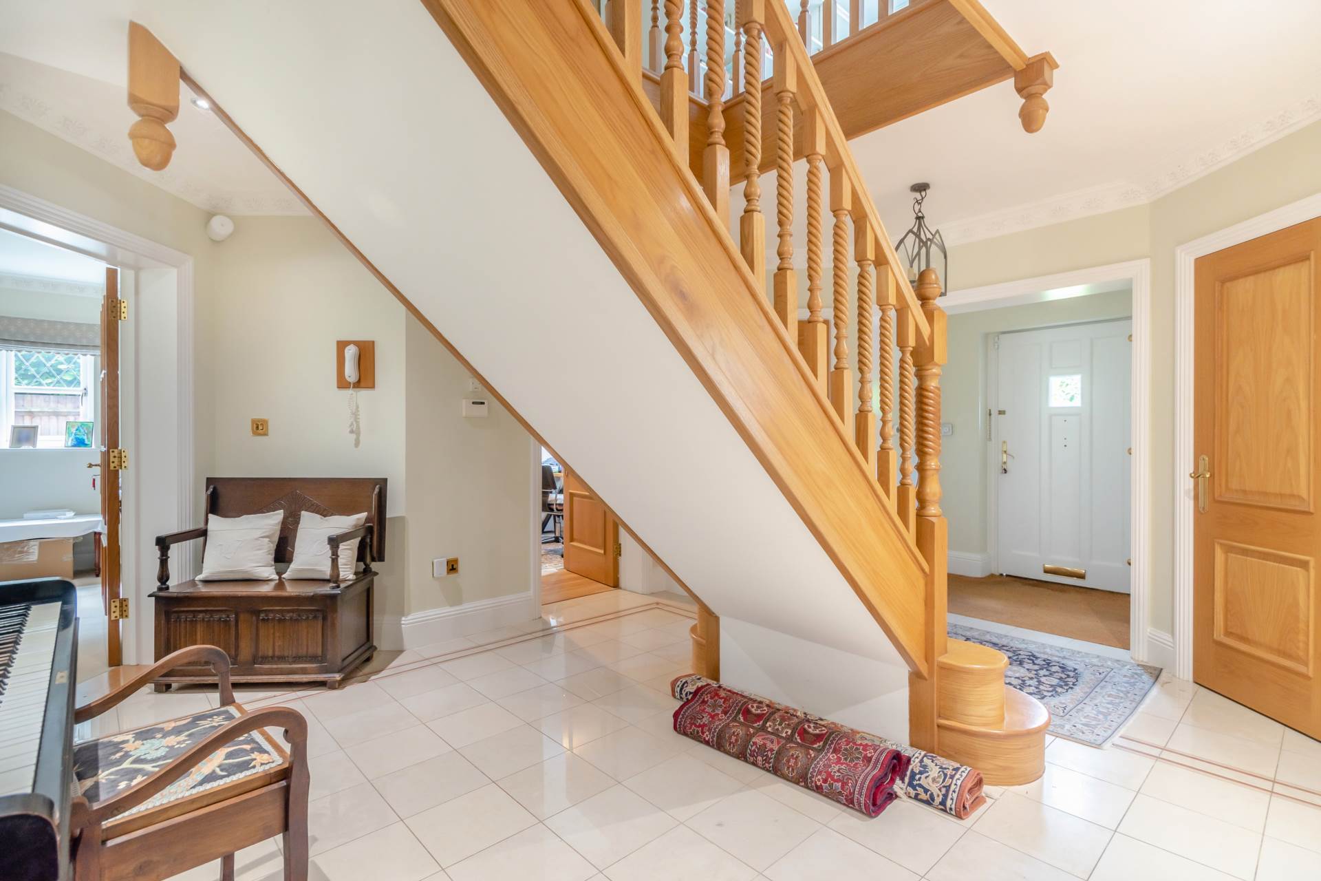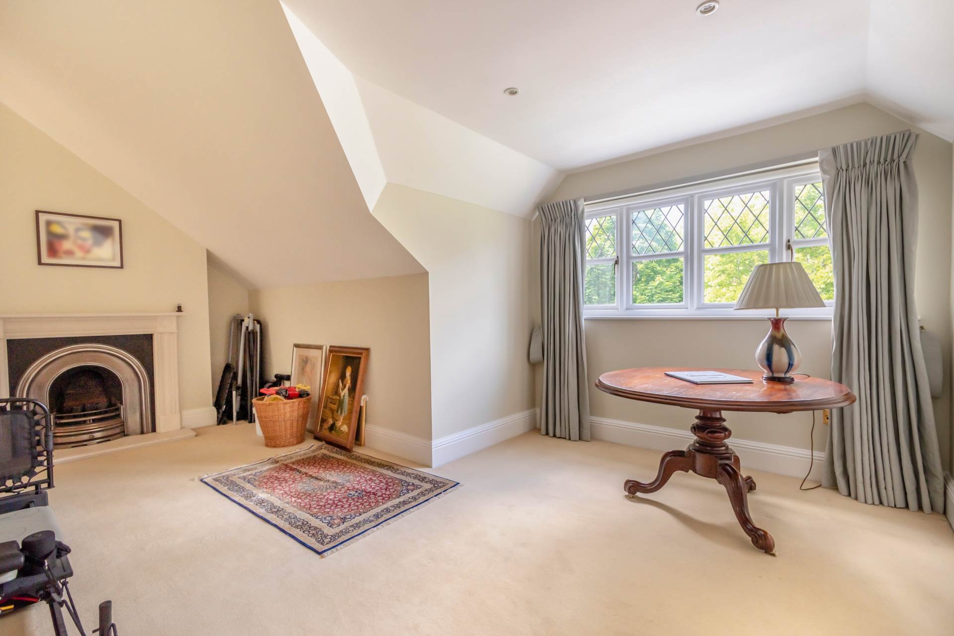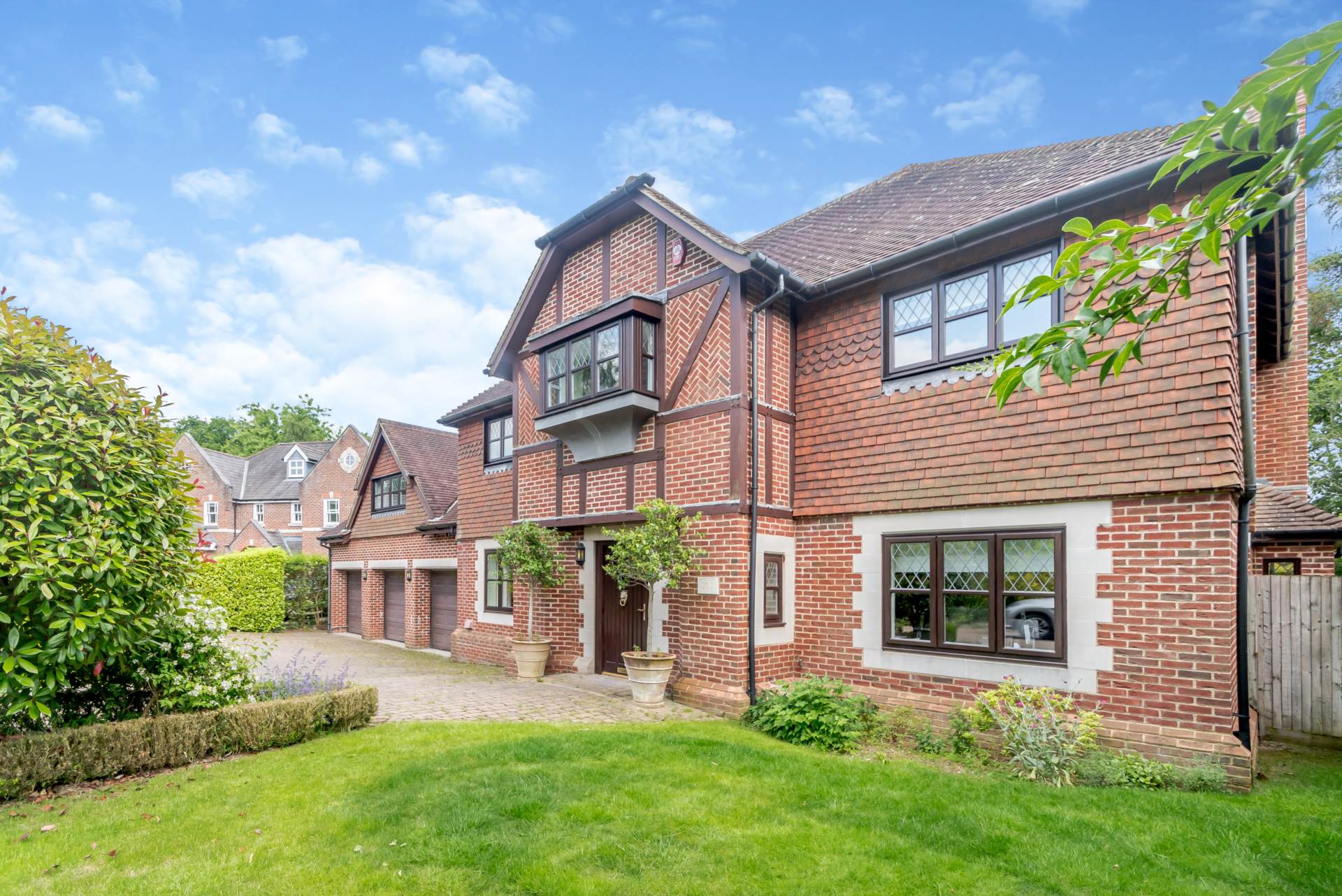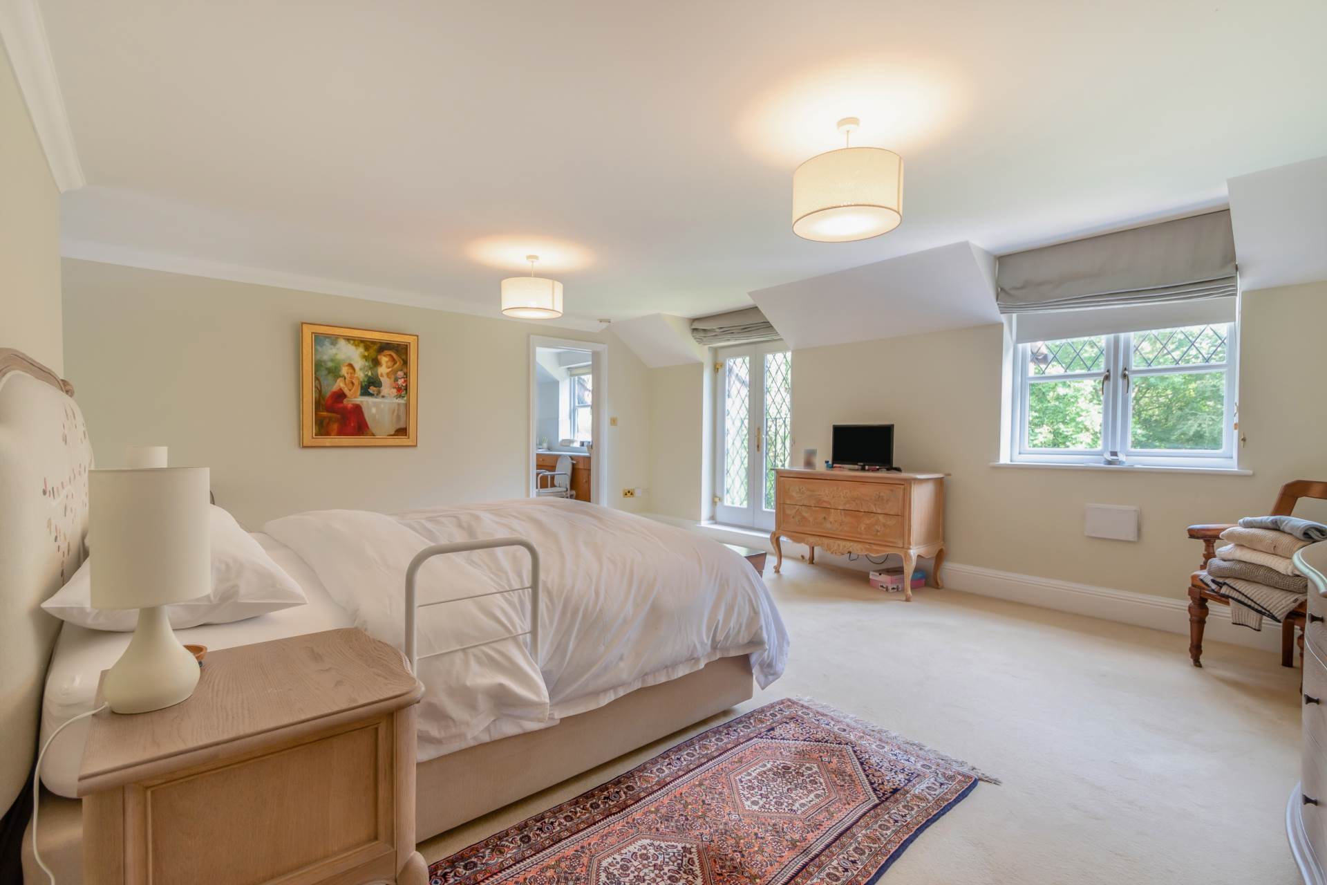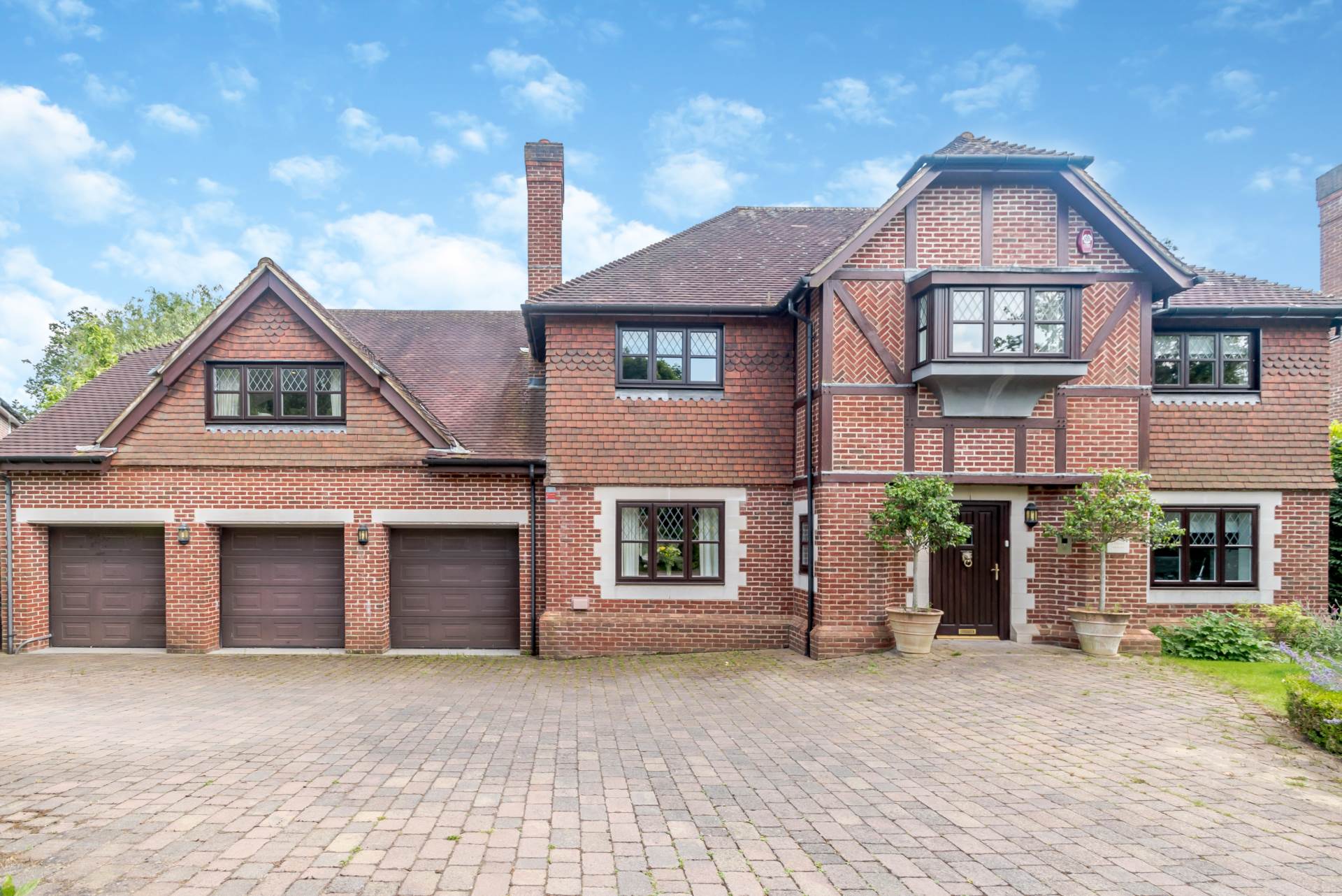 The principal reception room accessed from the main hallway provides an abundance of space and light with French doors leading onto a pretty patio overlooking the gardens. For formal Entertaining there is a well-proportioned dining room and finally on the ground floor there is a generous study looking out of the main driveway, providing plenty of parking and access to the three-car garage