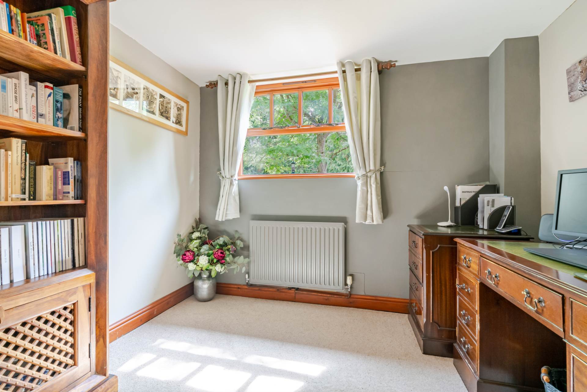 The ground floor also offers two well-proportioned bedrooms, a family bathroom, and a study that could serve as a home office or additional bedroom. Upstairs, the vaulted principal suite is a private retreat, complete with dressing room and en suite. Two further bedrooms and a family bathroom are accessed via a second staircase, providing an excellent layout for families or guests.