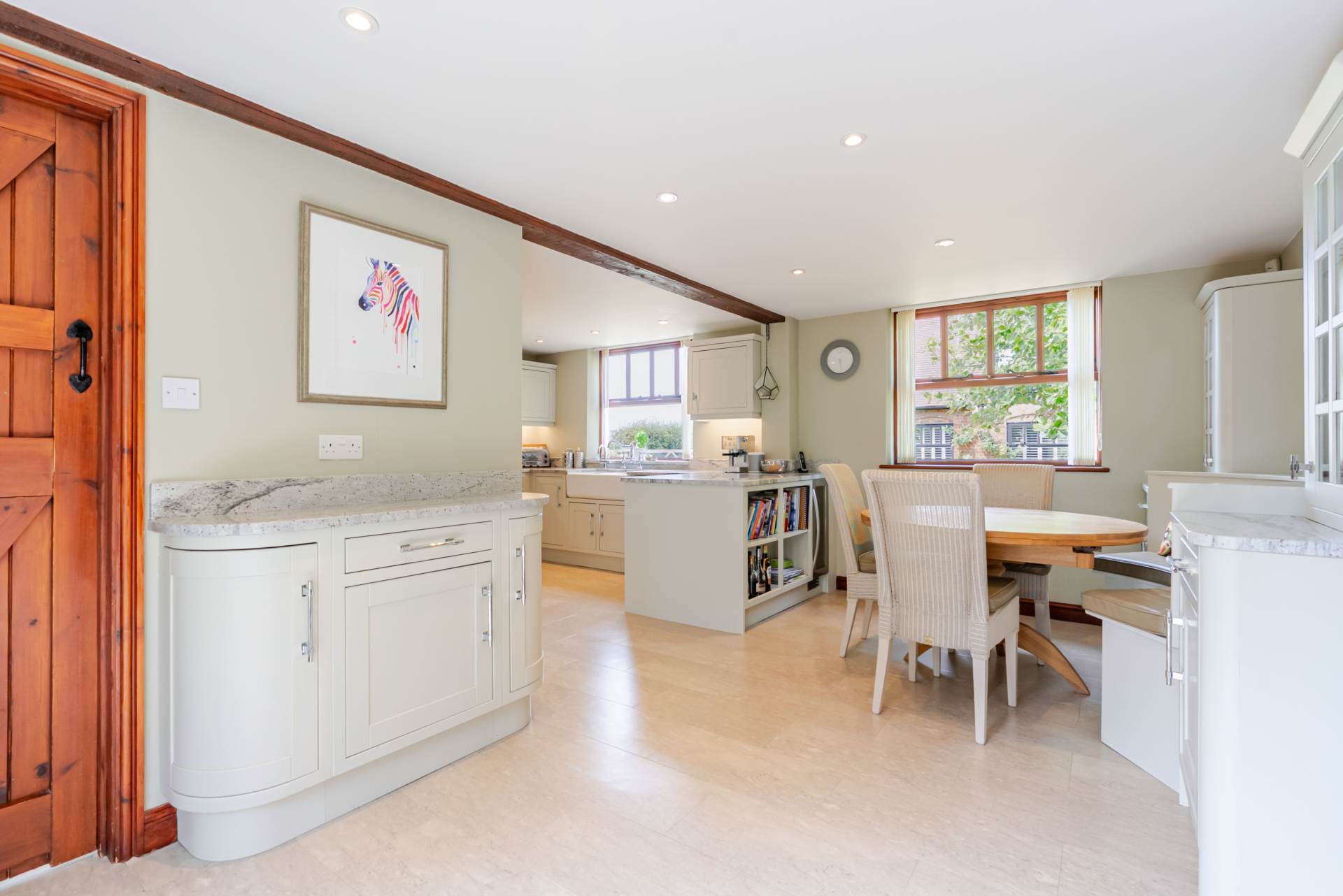 Step inside and you`re welcomed into a spectacular open-plan sitting/dining room with soaring ceilings, exposed beams, and a dual-aspect wood-burning stove the perfect heart of the home. The bespoke kitchen/breakfast room, refitted in 2014, blends timeless design with practical luxury, featuring granite worktops, a range Aga, and a stylish circular seating area ideal for relaxed family meals or entertaining.